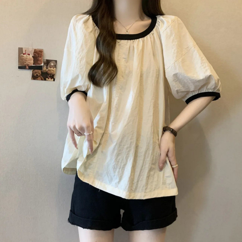 플러스 사이즈 바느질 퍼프 소매 반팔 셔츠 여성의 여름 새로운 라운드 넥 유행 루즈 슬림 벨리 커버 탑