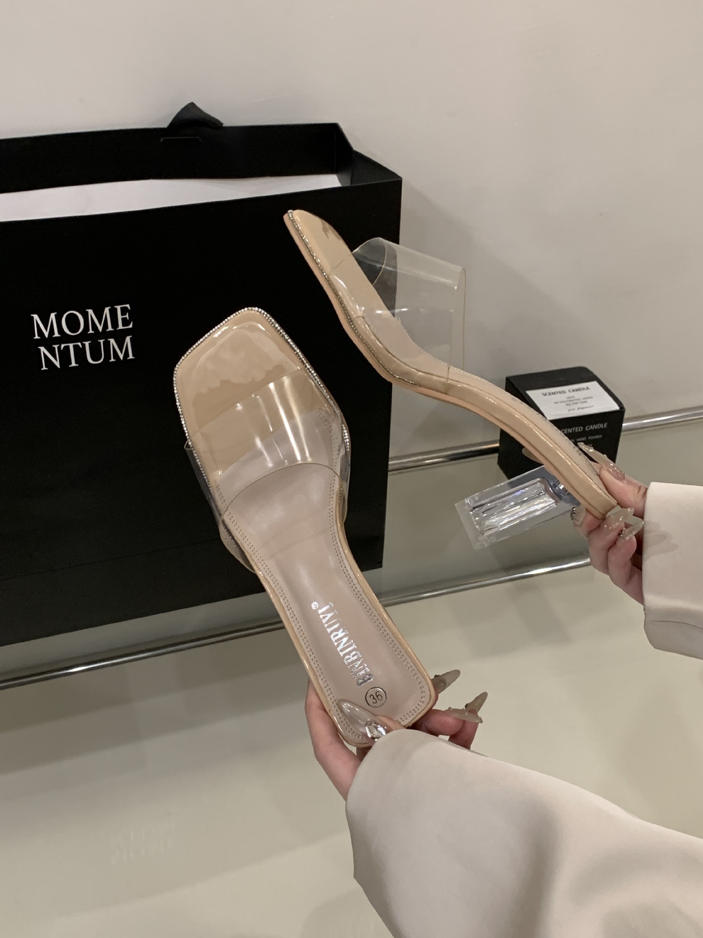 2025 새로운 샌들 여성 봄, 여름 투명한 두꺼운 굽 크리스탈 하이힐 요정 스타일 원 스트랩 샌들스토어 가기