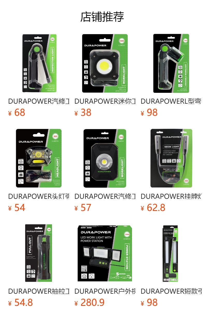 LED工作灯,高1200lm,中600lm,低300lmm。(单根白光高光600lm, 中光300lm, 低光150lm)。