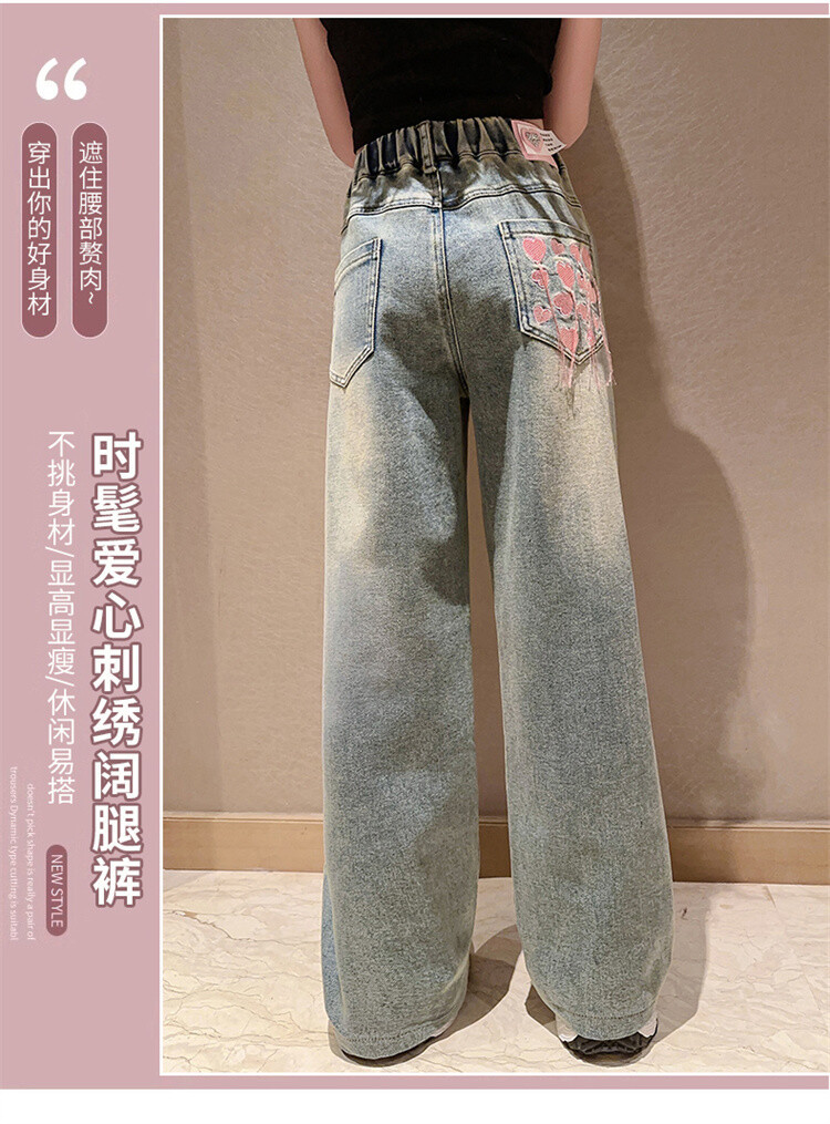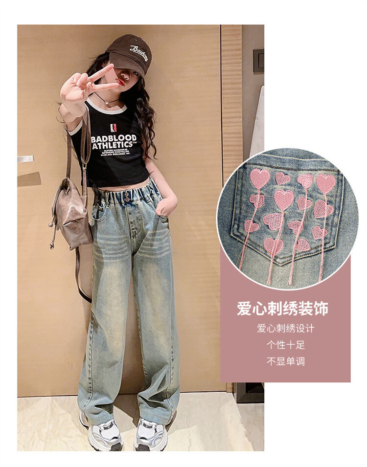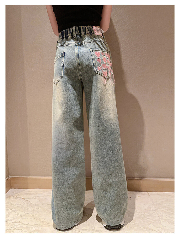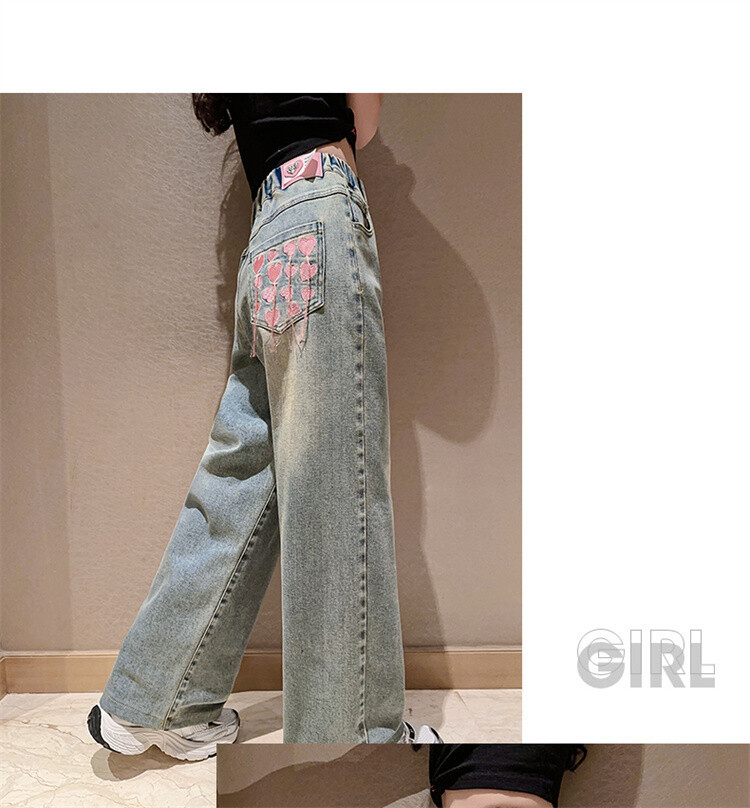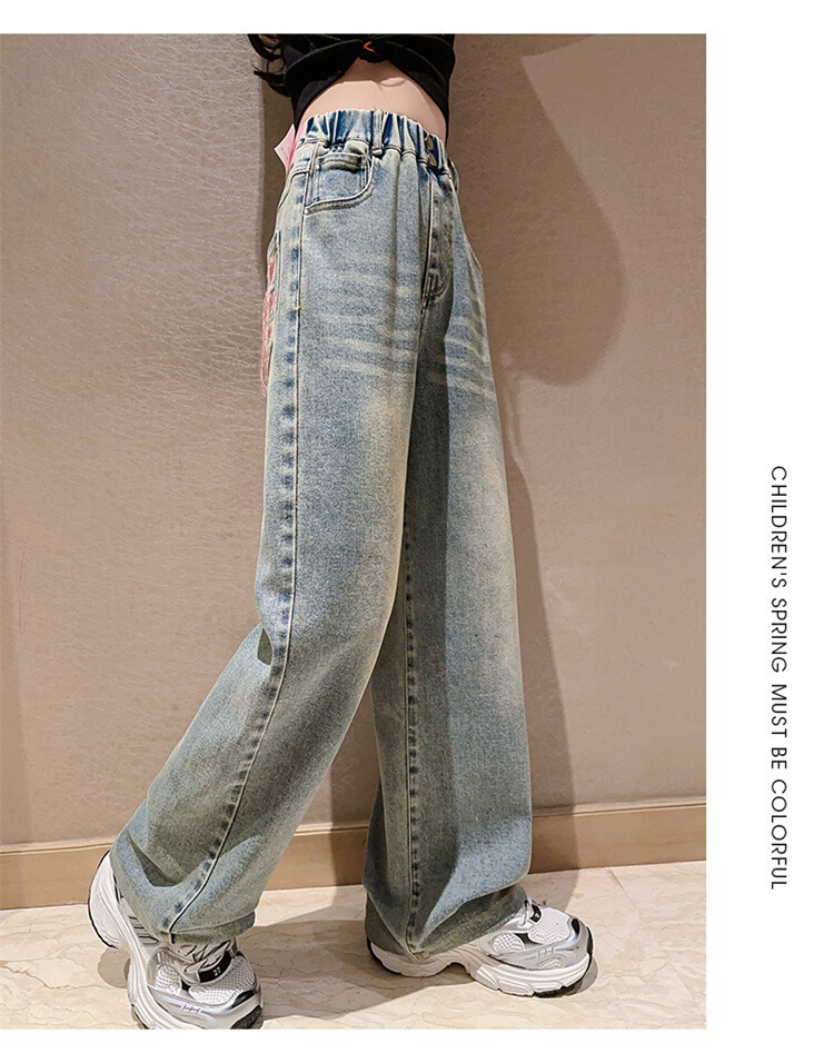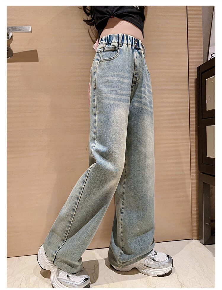 소녀 2025 봄 가을 중 큰 어린이 새로운 어린이 한국 자수 청바지 올매치 인기 트렌디 쿨 스트레이트 와이드 레그