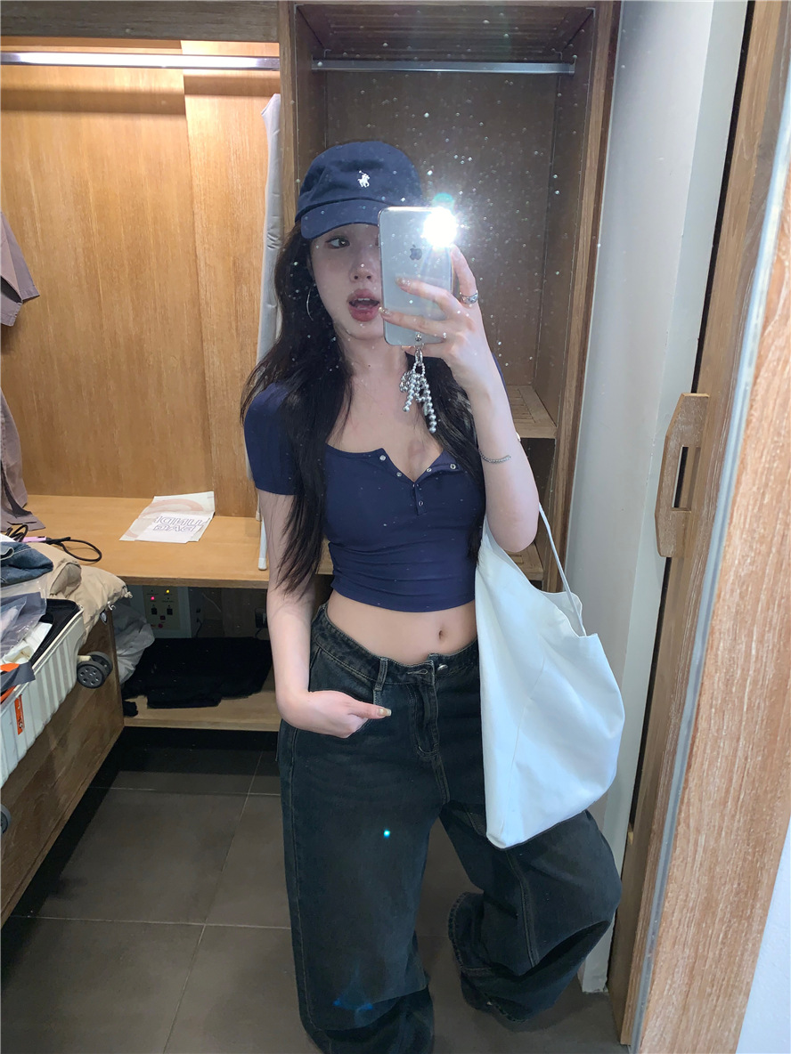 섹시한 스파이스 걸 쇼트 타이트 배꼽 노출 반팔 티셔츠 여성 2025 년 여름 슬림핏 슬리밍 올 매치 패셔블 학생 탑스토어 가기