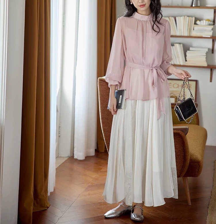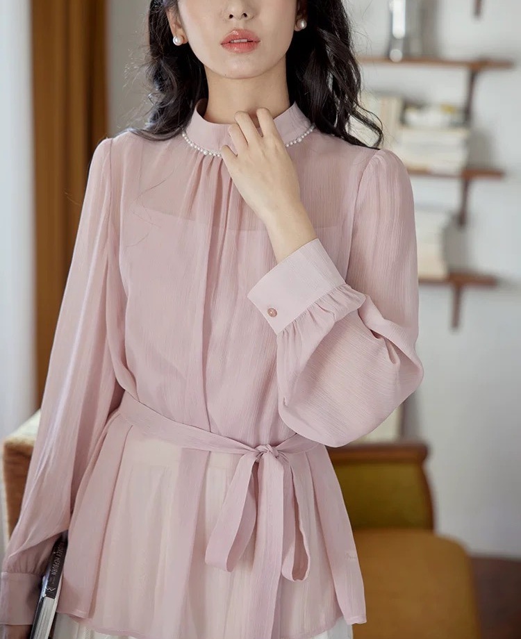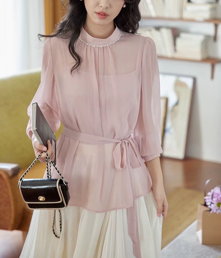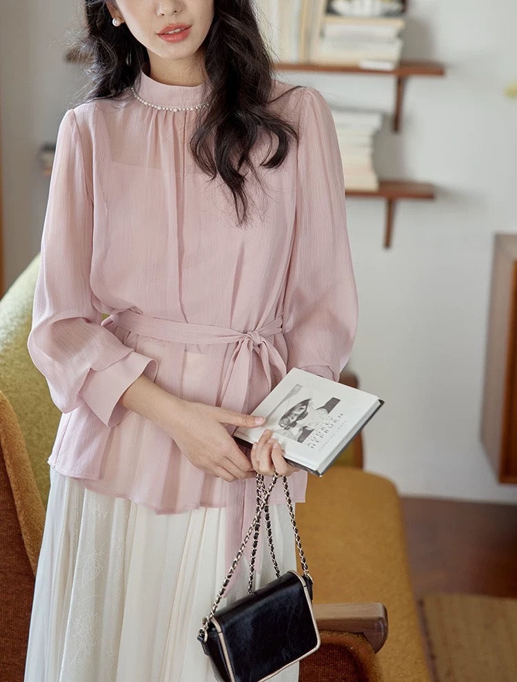 핑크 칼라 펄 레이스 셔츠 여성용 봄 프렌치 레트로 타이트 허리 슬리밍 우아한 탑스토어 가기