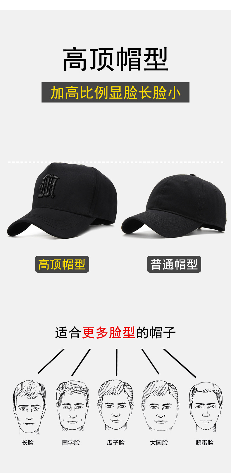 블랙 빅 헤드 하이 탑 햇 남자 한국 스타일 패션 브랜드 심화 얼굴 작은 야구 모자 봄과 여름 라운드 페이스 캡