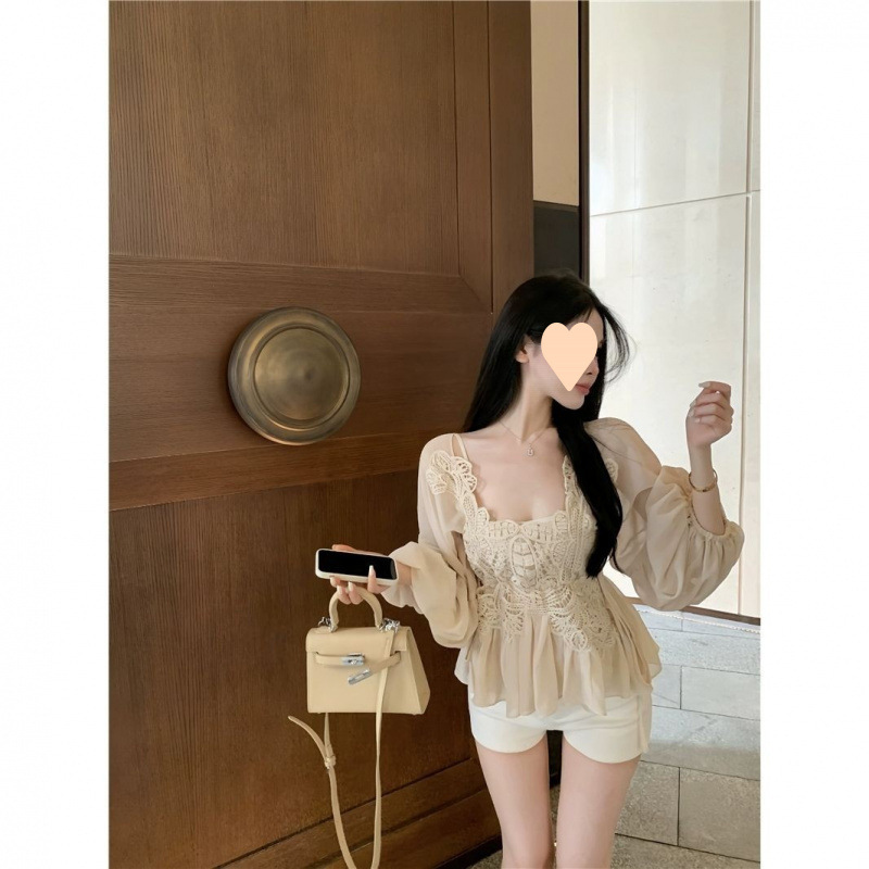레이스 바느질 프렌치 퍼프 슬리브 쉬폰 셔츠 여성의 여름 디자인 센스 작은 요정 셔츠 슬링