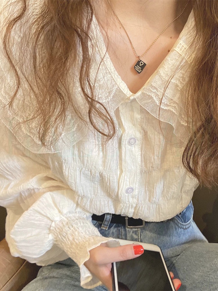 인형 칼라 퍼프 슬리브 셔츠 여성 최고 여성베이스 셔츠 얇은 레이스 셔츠 쉬폰 셔츠 긴 소매 내부 프렌치 스타일