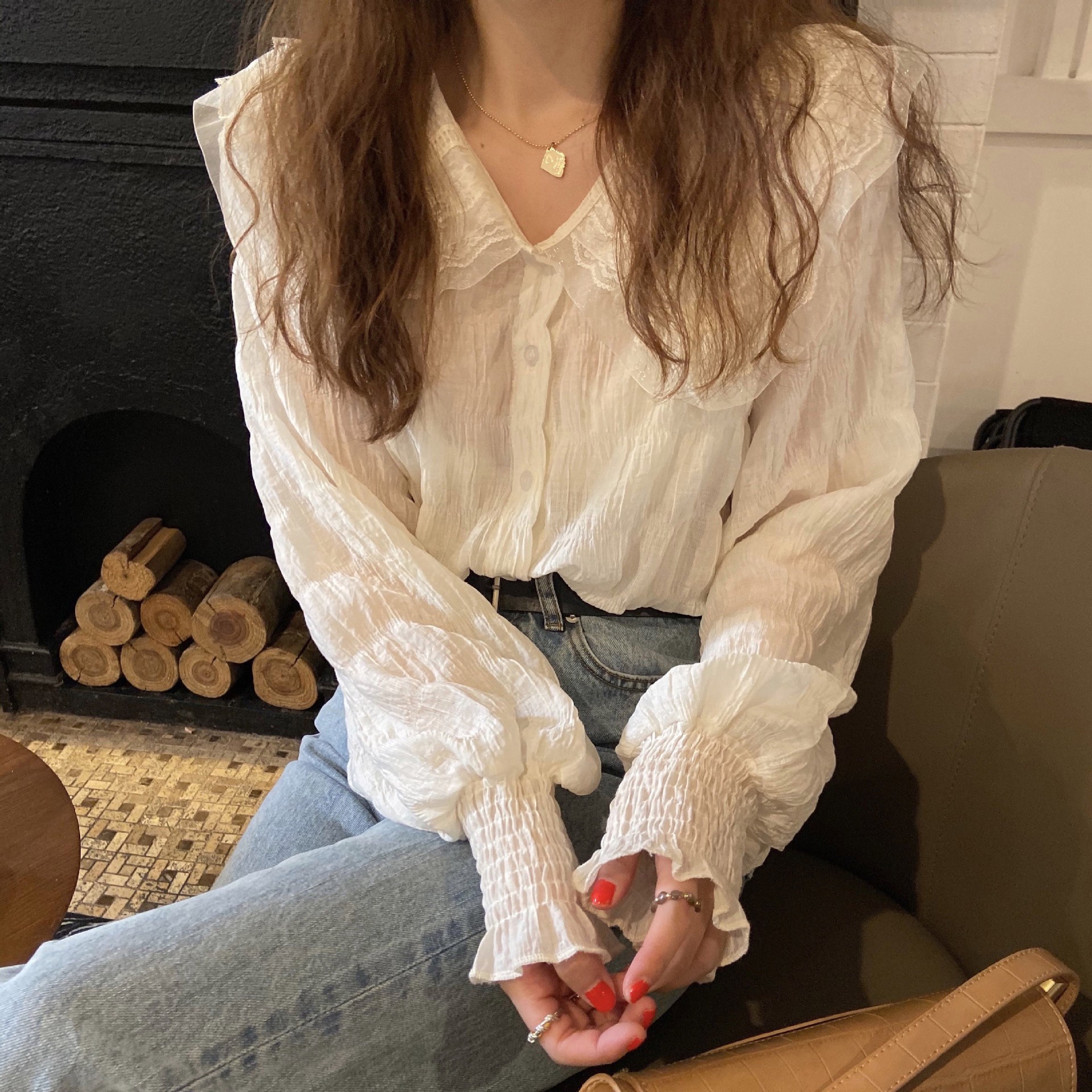 인형 칼라 퍼프 슬리브 셔츠 여성 최고 여성베이스 셔츠 얇은 레이스 셔츠 쉬폰 셔츠 긴 소매 내부 프렌치 스타일스토어 가기