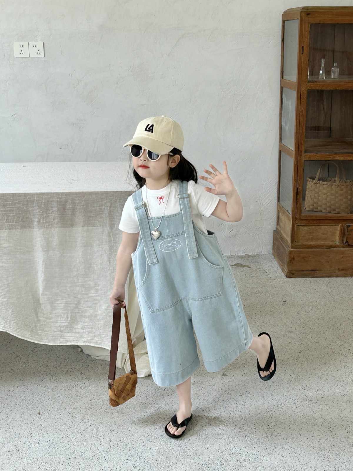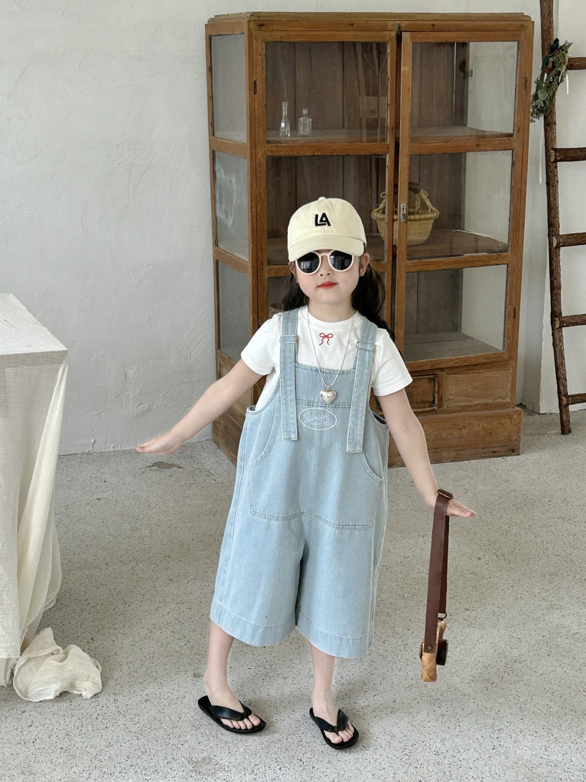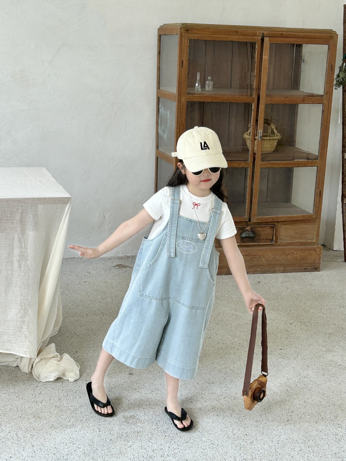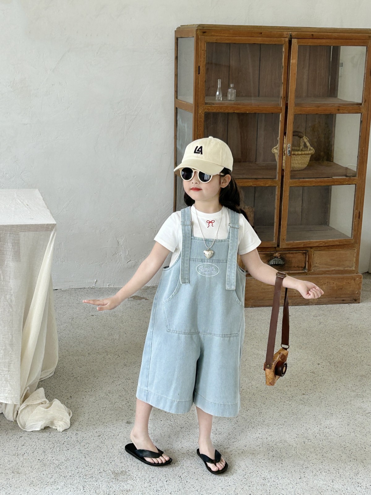 한국 스타일 아동복 2025 여름 새 어린이 청바지 남녀 남녀 아기 카프리 바지 올매치 스트랩 바지스토어 가기