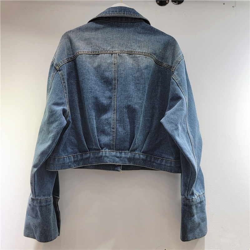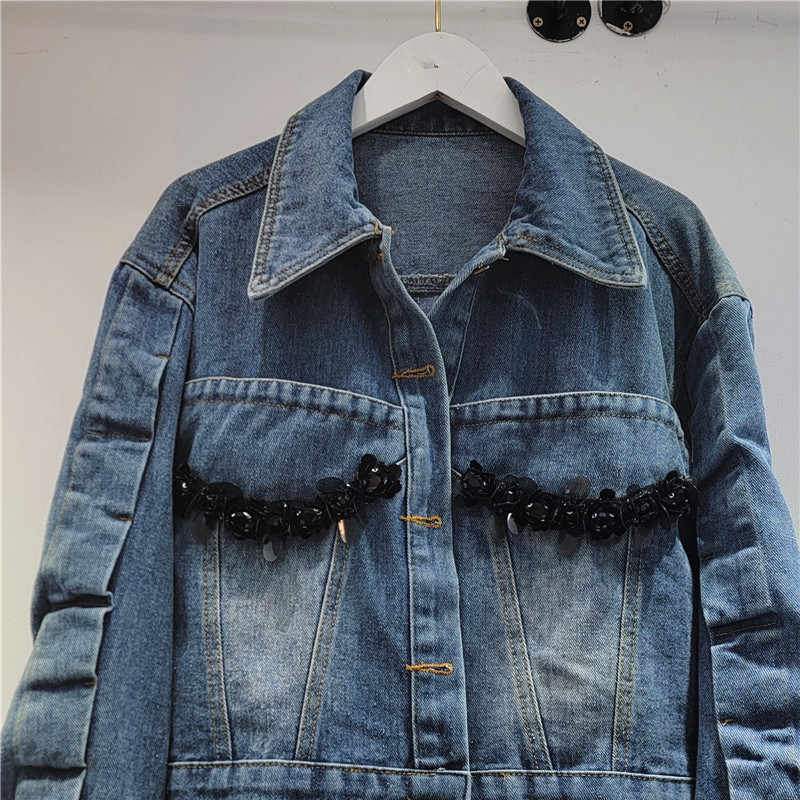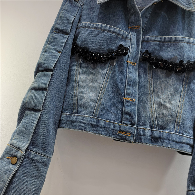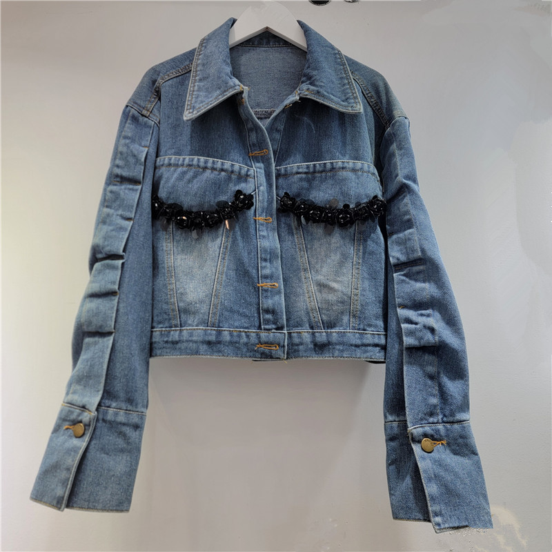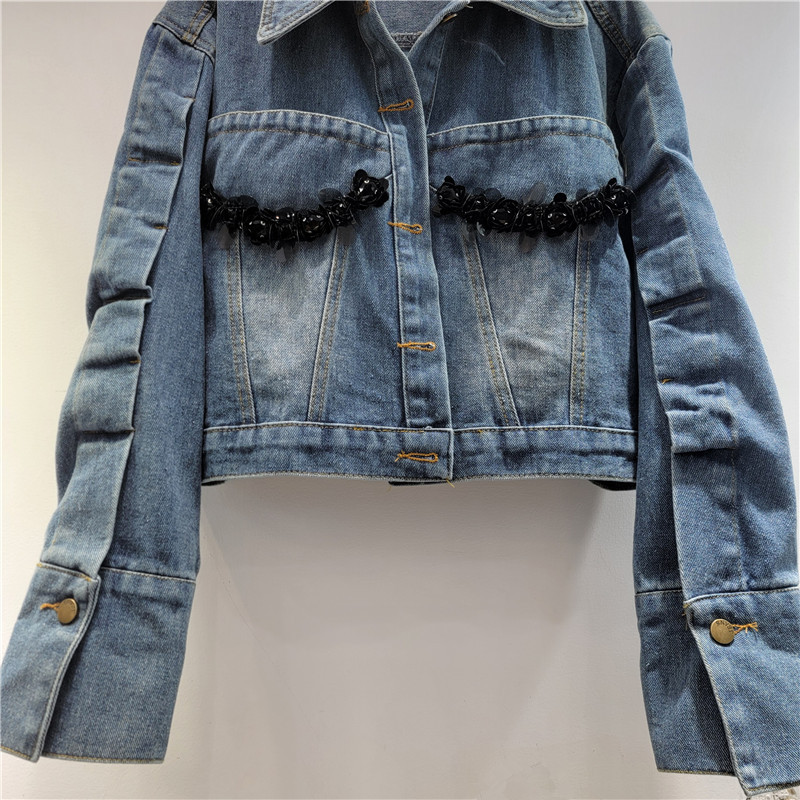 2025 봄 새로운 독특한 세련된 중공업 수제 구슬 데님 코트 디자인 재킷 짧은 여성스토어 가기