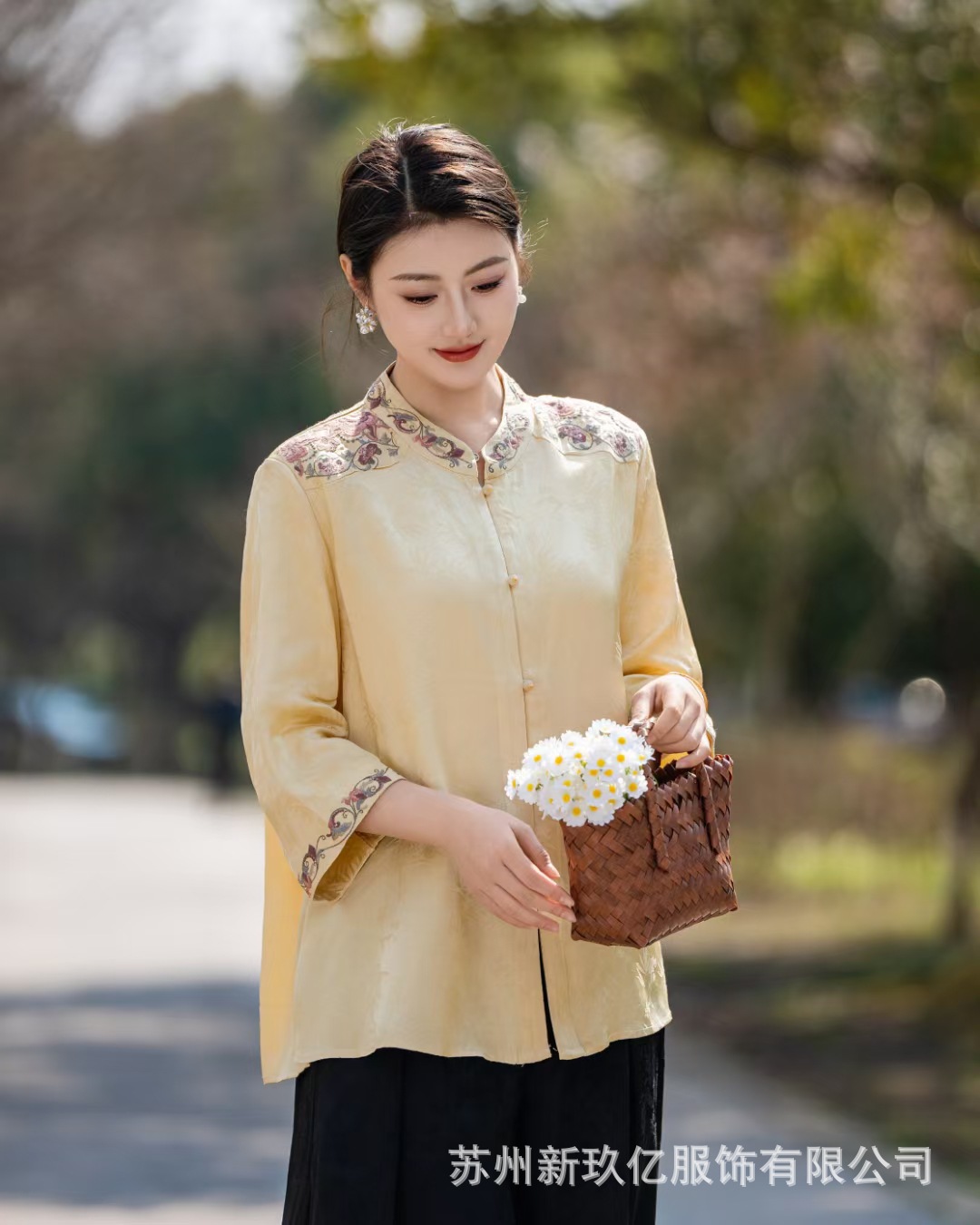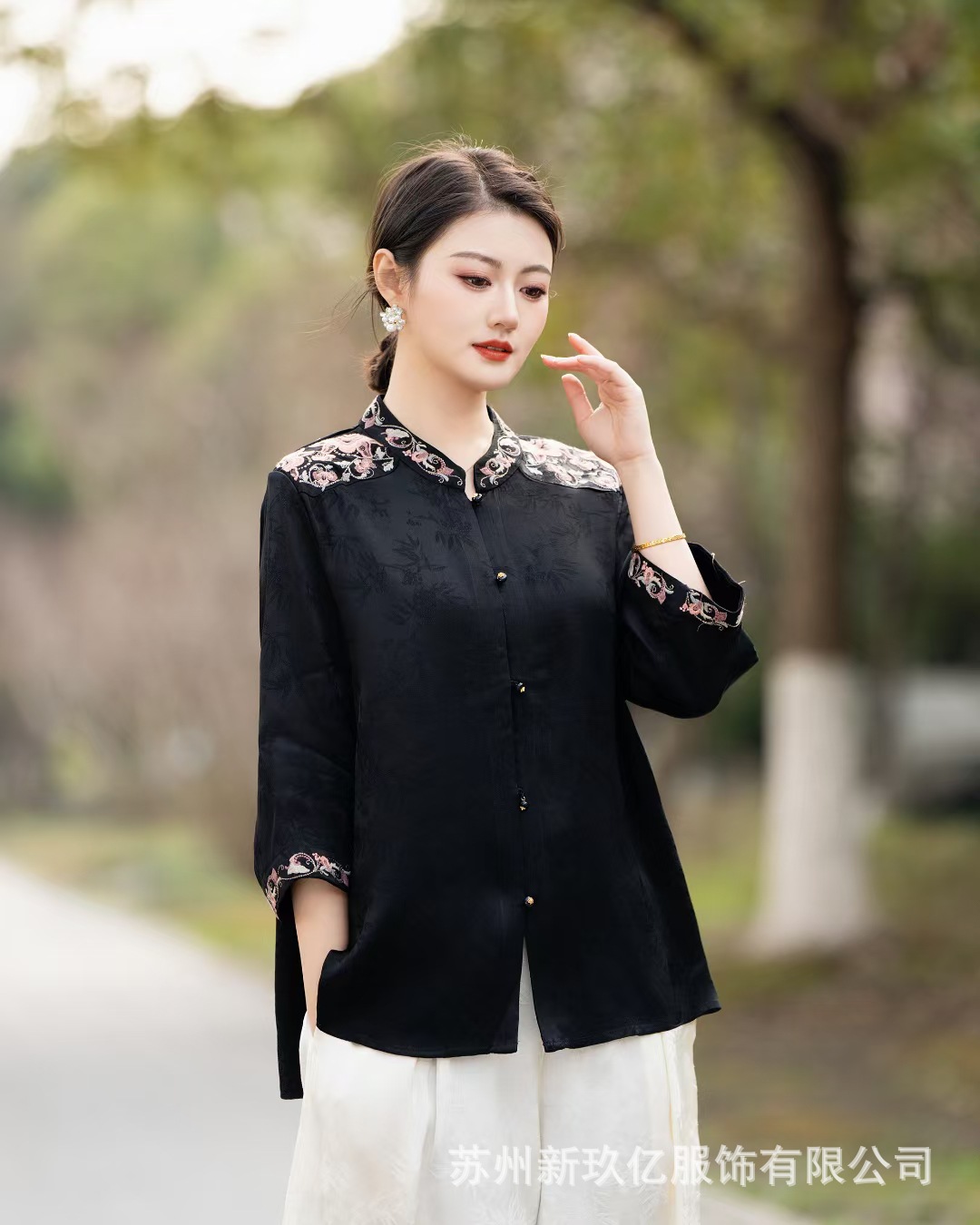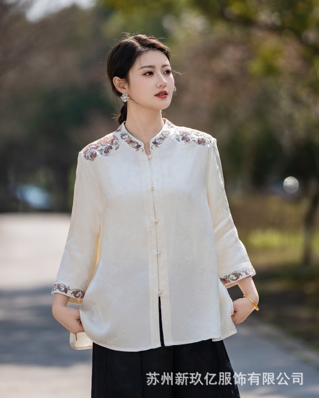 새로운 중국 스타일 얇은 Guofeng 자수 셔츠 여성의 2025 새로운 자카드 새틴 칼라 우아한 셔츠 루즈 탑