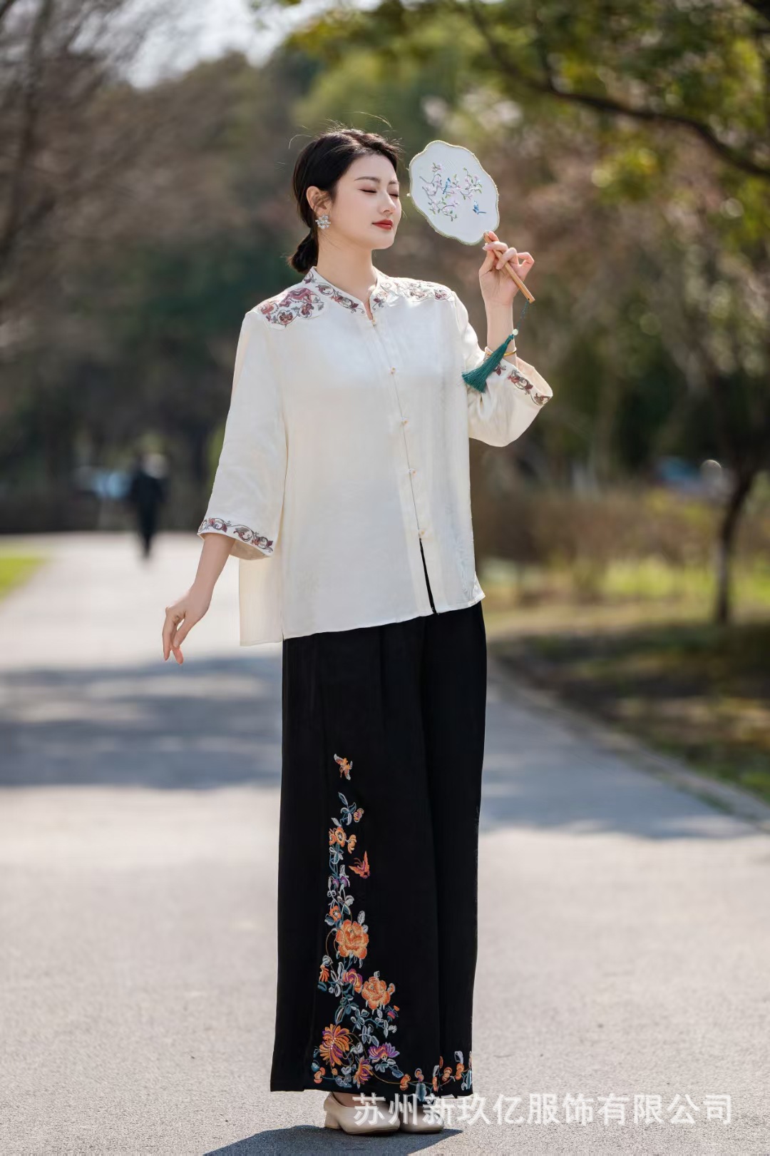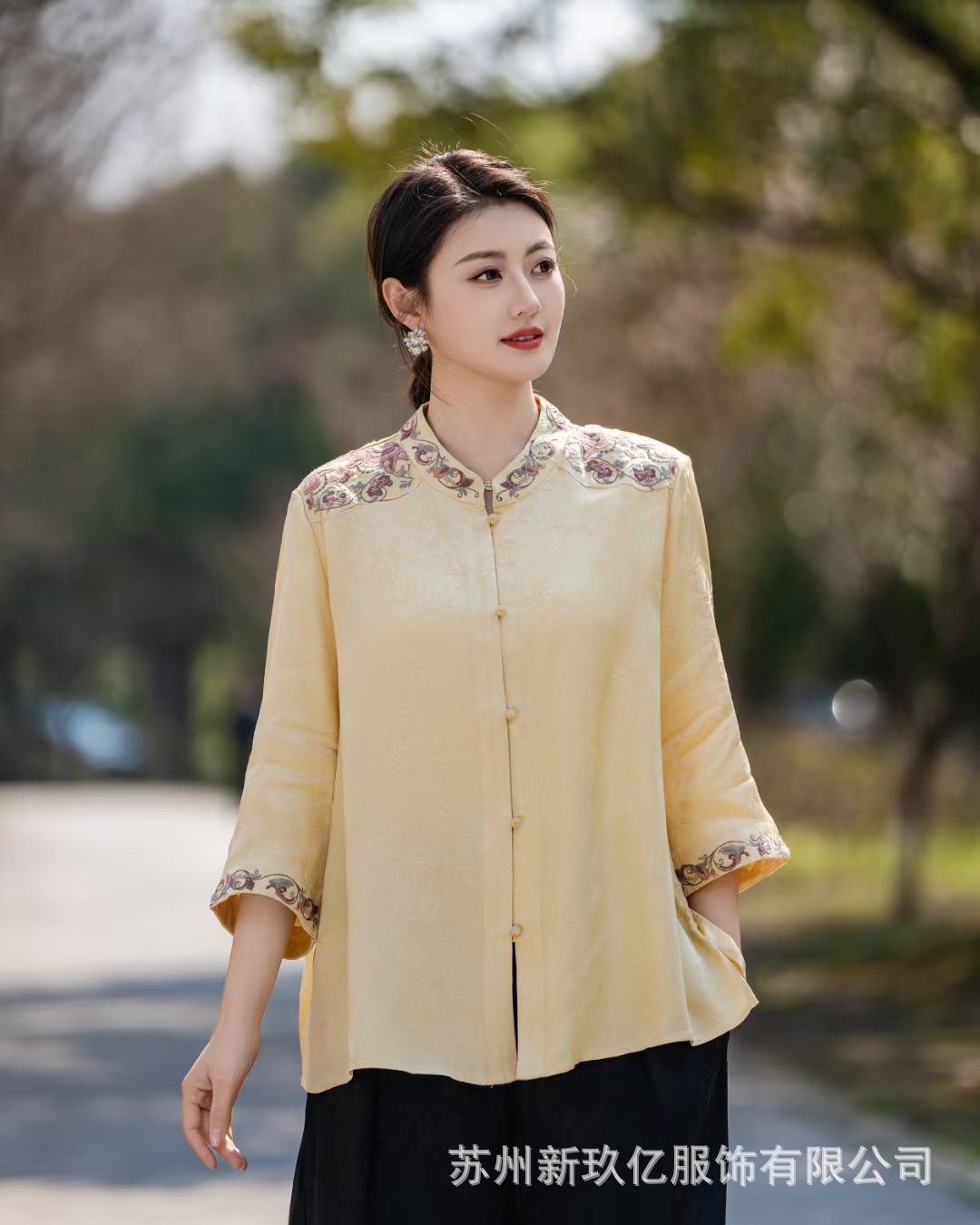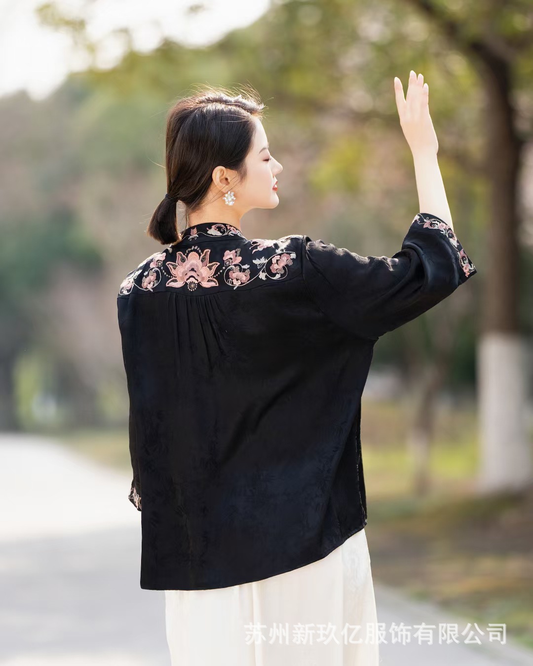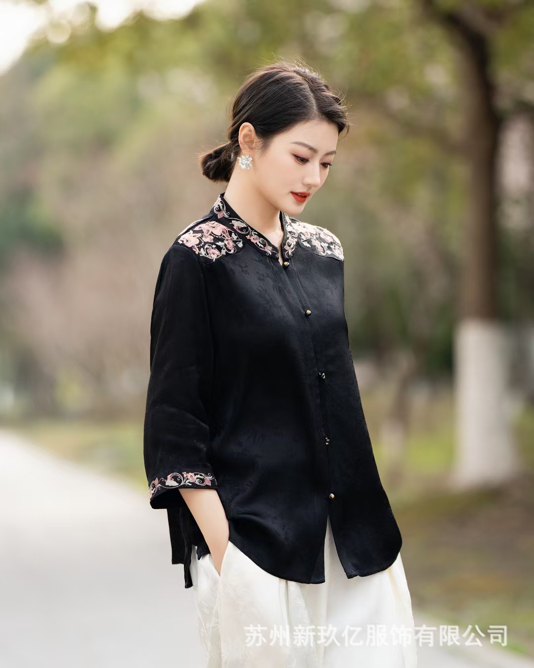 새로운 중국 스타일 얇은 Guofeng 자수 셔츠 여성의 2025 새로운 자카드 새틴 칼라 우아한 셔츠 루즈 탑