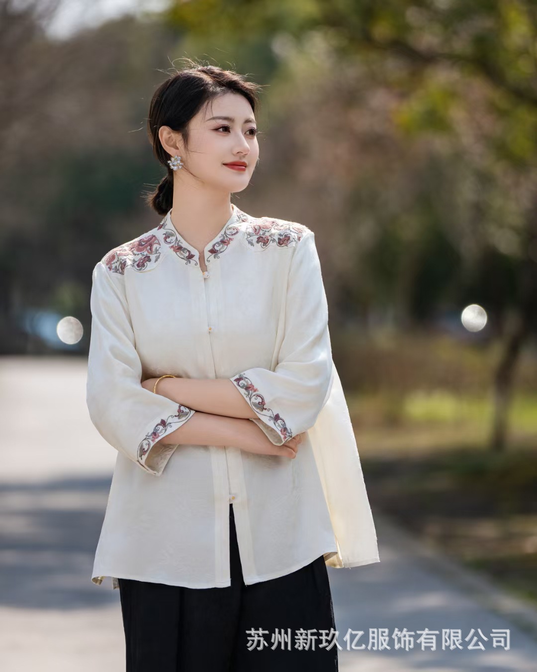 새로운 중국 스타일 얇은 Guofeng 자수 셔츠 여성의 2025 새로운 자카드 새틴 칼라 우아한 셔츠 루즈 탑스토어 가기