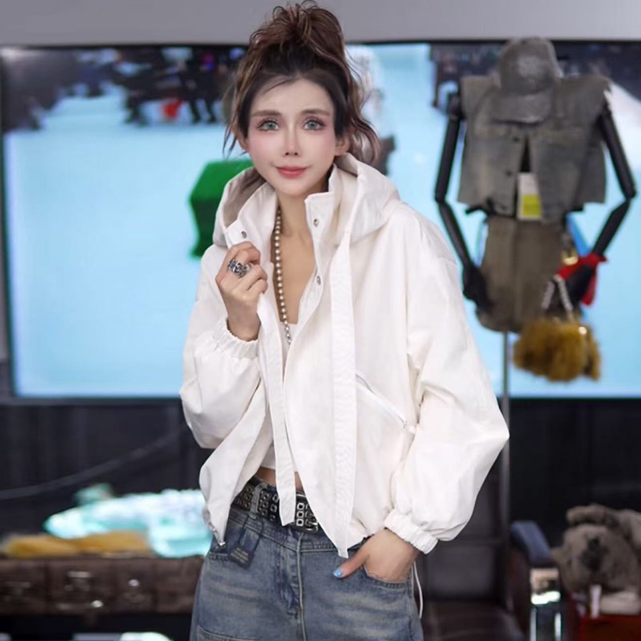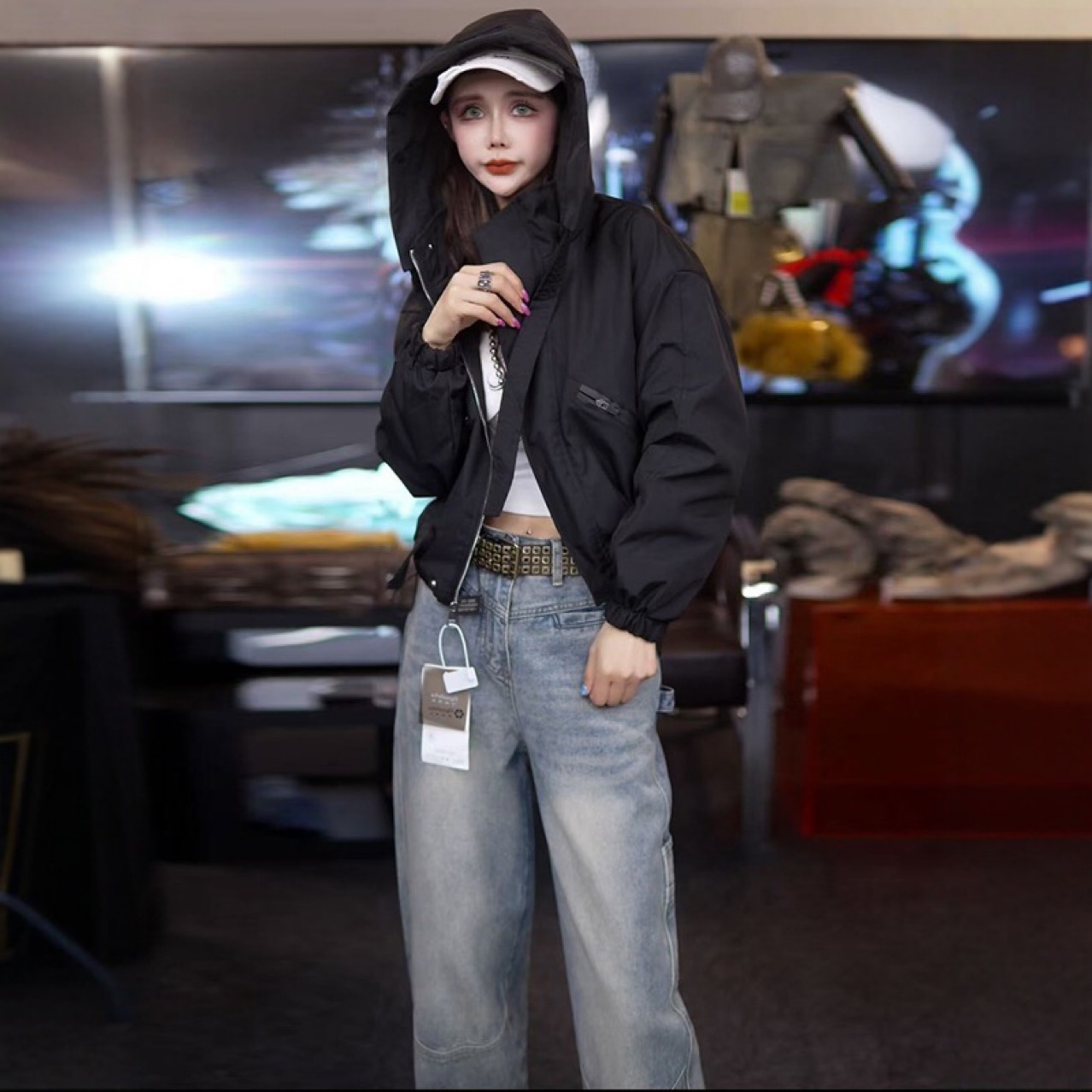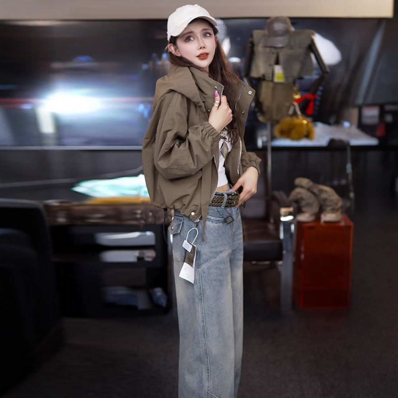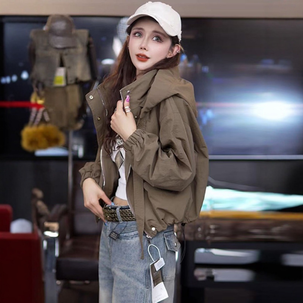 7646 아메리칸 스타일 후드 충전 의류 여성의 새로운 느슨한 지퍼 hem Drawstring 여성용 캐주얼 재킷 코트