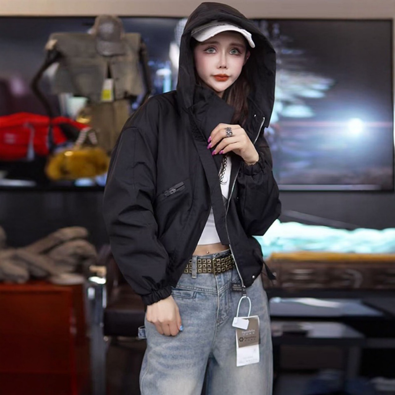 7646 아메리칸 스타일 후드 충전 의류 여성의 새로운 느슨한 지퍼 hem Drawstring 여성용 캐주얼 재킷 코트스토어 가기
