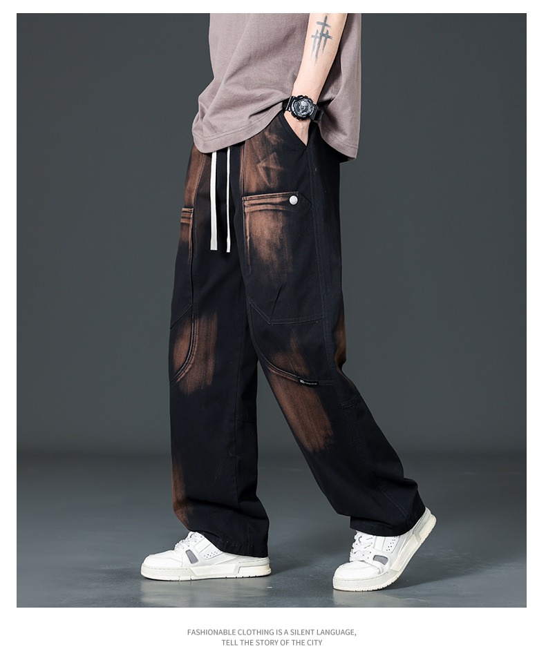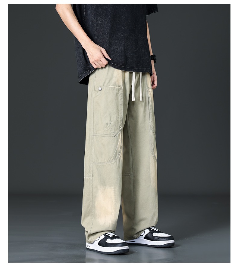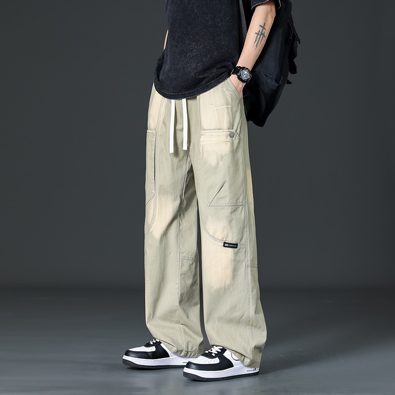아메리칸 스타일 트렌디 브랜드 퓨어 코튼 플러스 사이즈 오버롤 남성용 루즈 스트레이트-레그 팬츠 플러스 레이업 캐주얼 심플 와이드 레그 팬츠