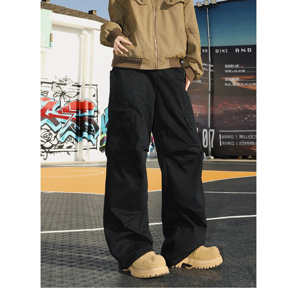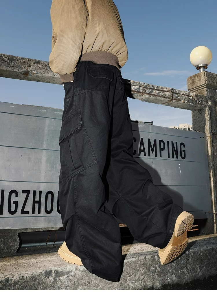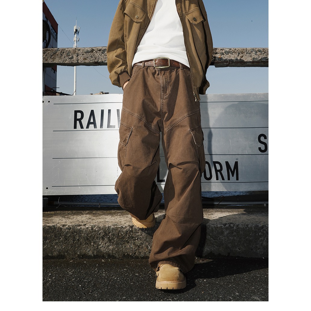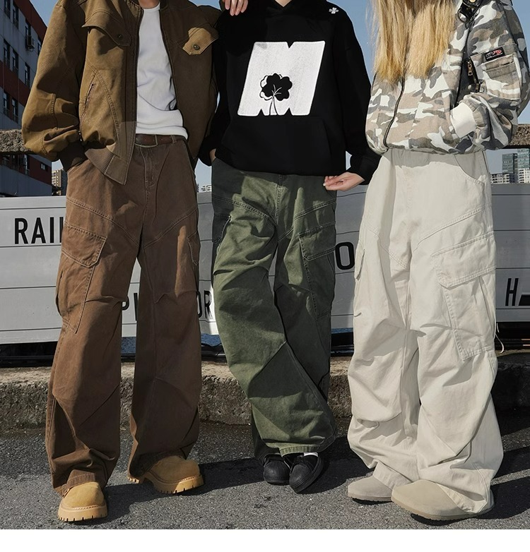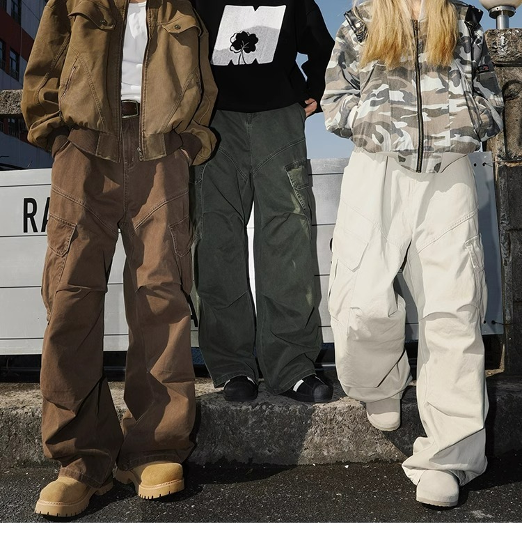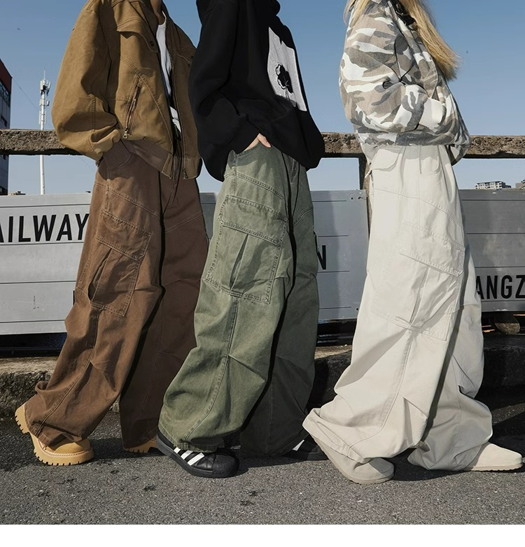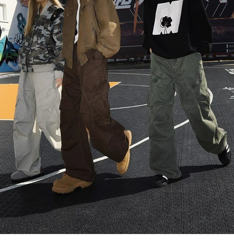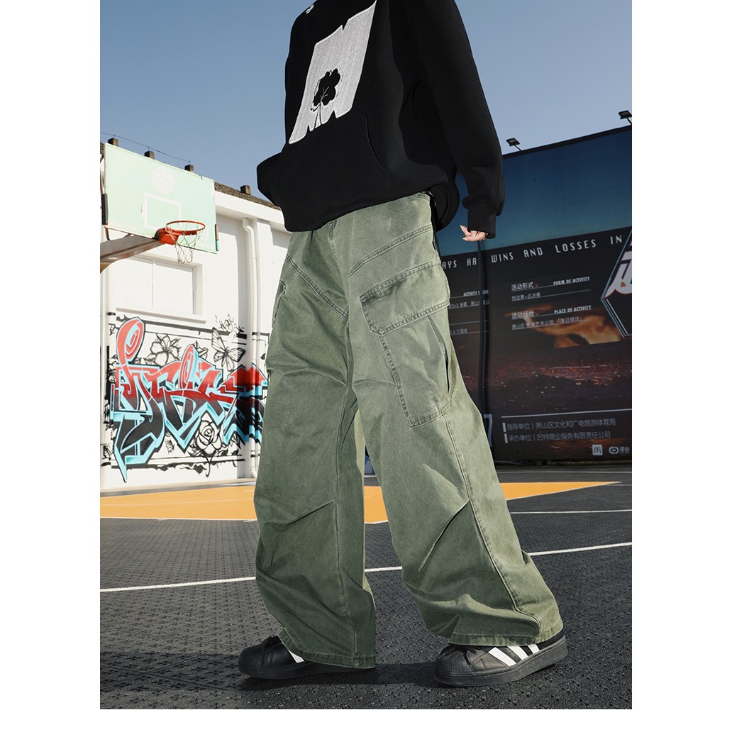일본 스타일 주름 낙하산 귀여운 바지 남자 봄 새로운 큰 포켓 유행 브랜드 레트로 하이 스트리트 느슨한 캐주얼 바지스토어 가기