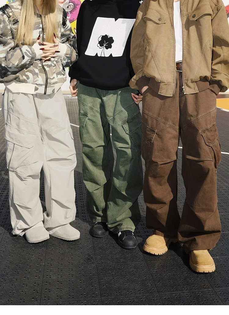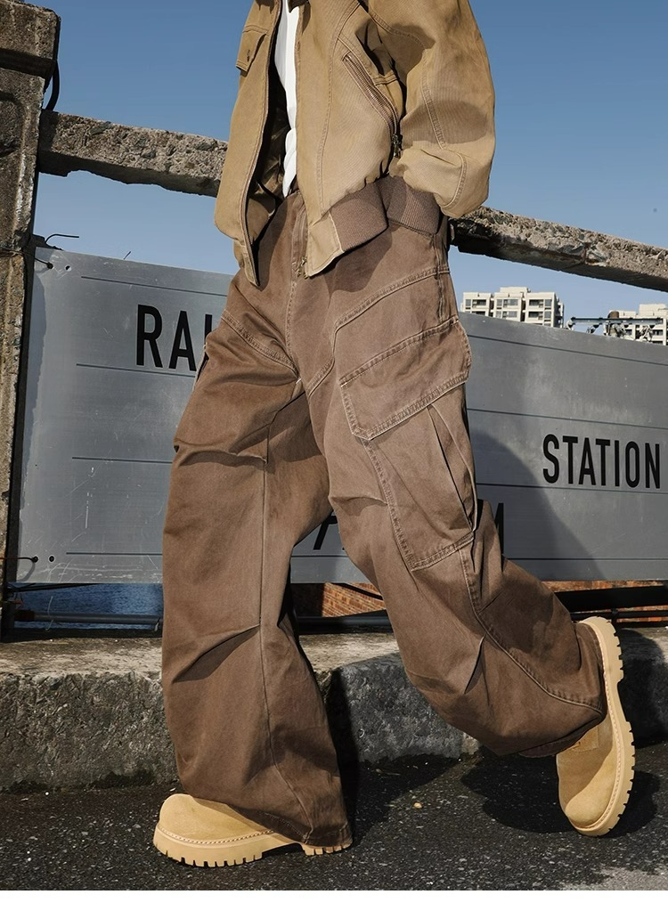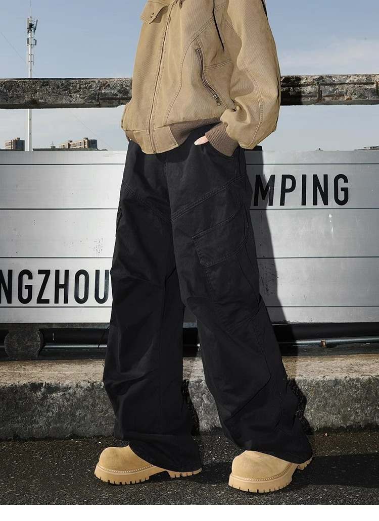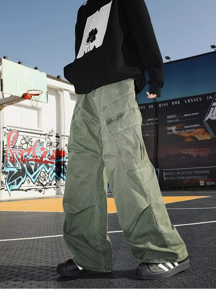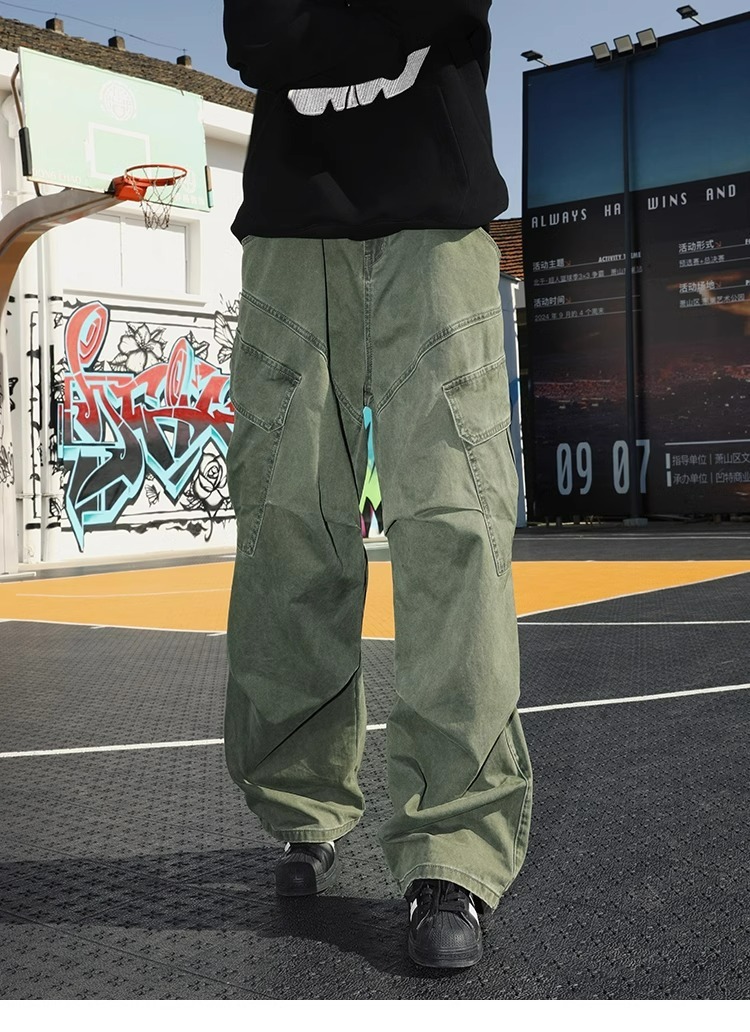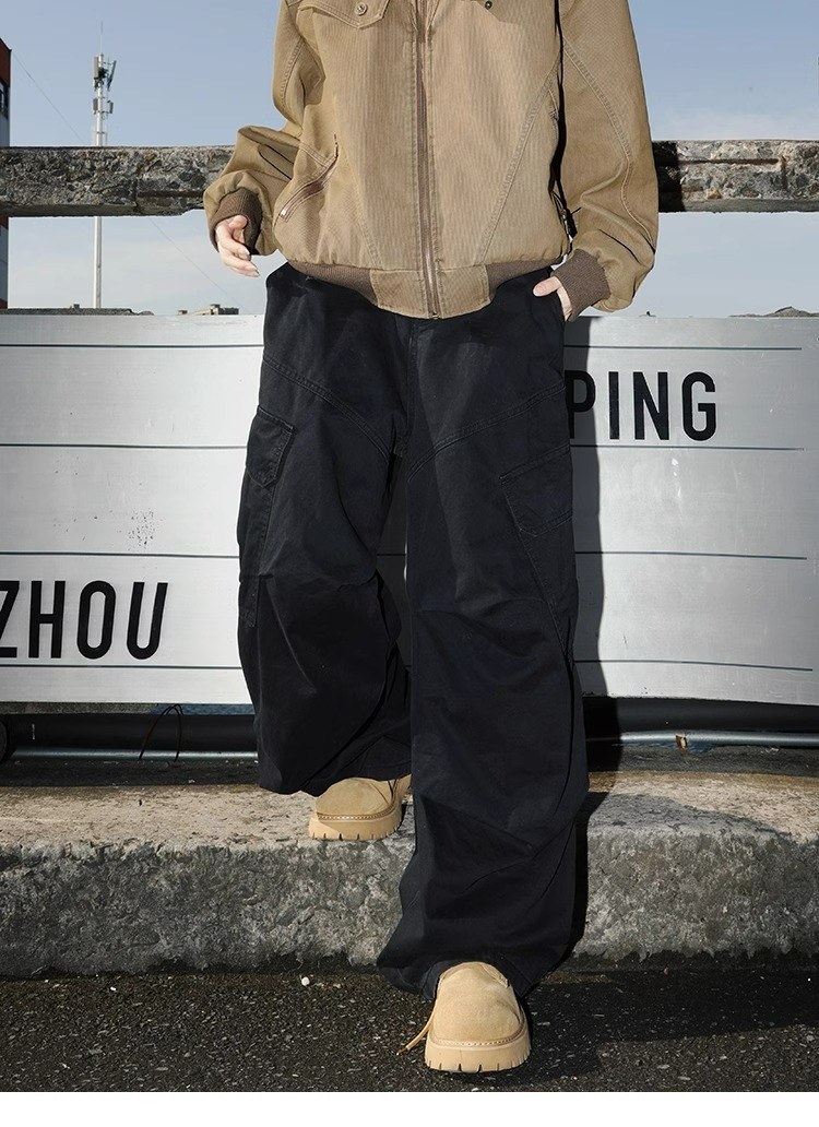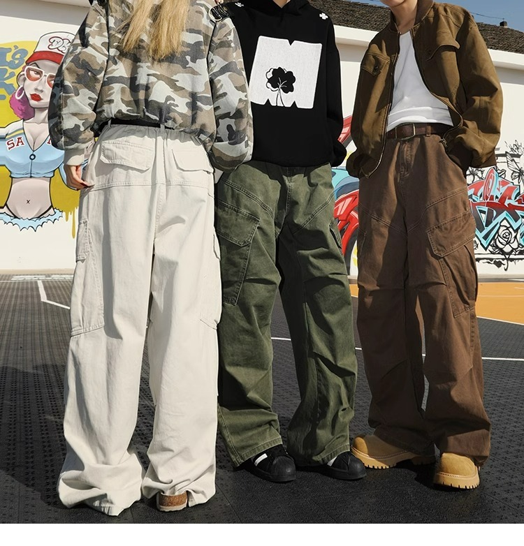 일본 스타일 주름 낙하산 귀여운 바지 남자 봄 새로운 큰 포켓 유행 브랜드 레트로 하이 스트리트 느슨한 캐주얼 바지스토어 가기
