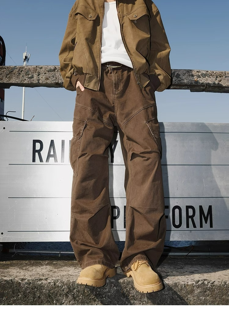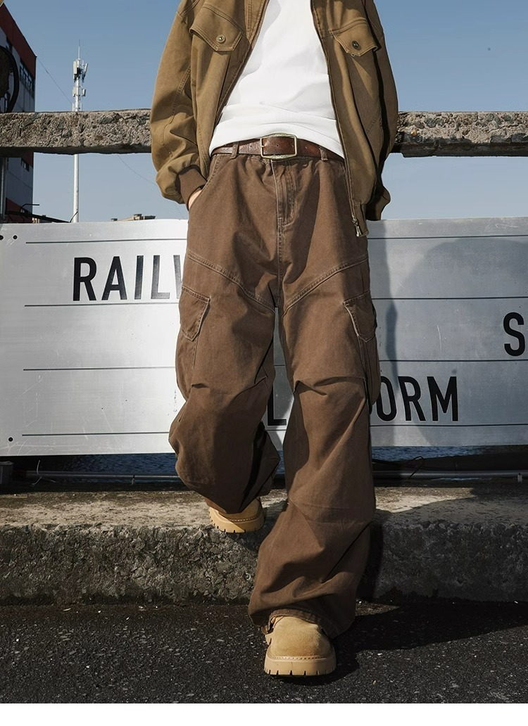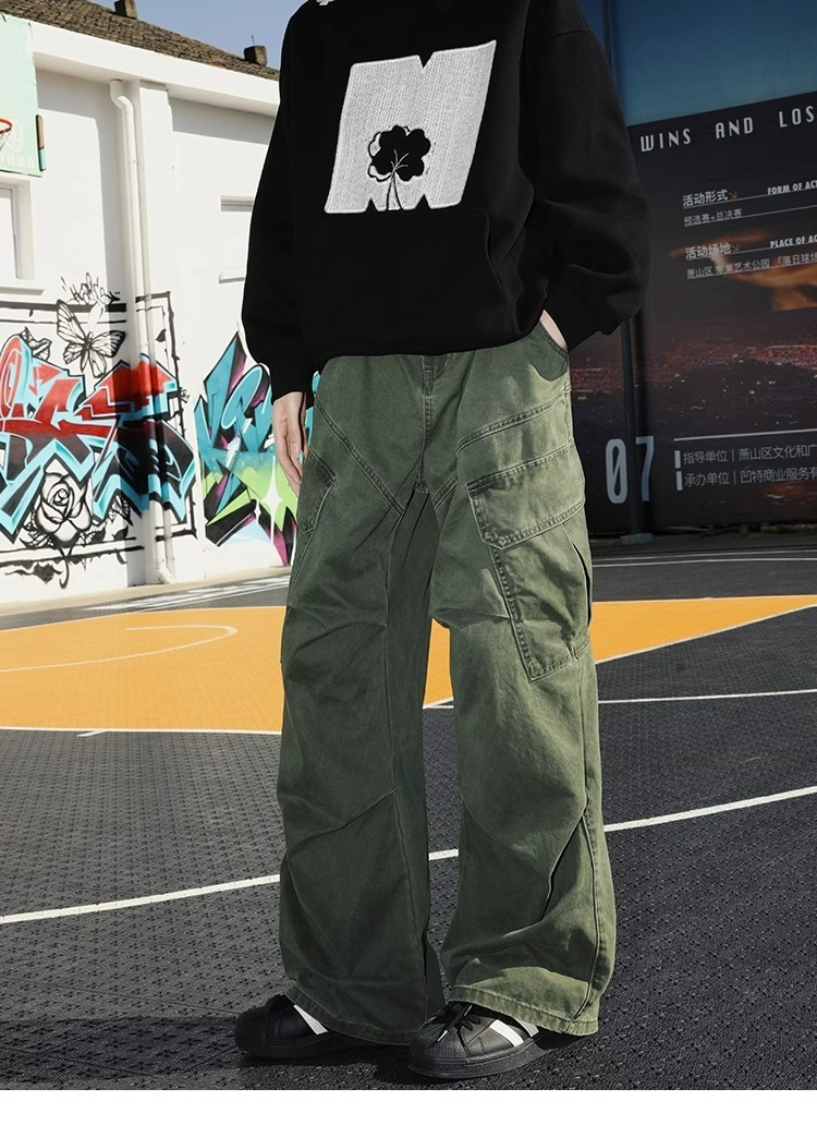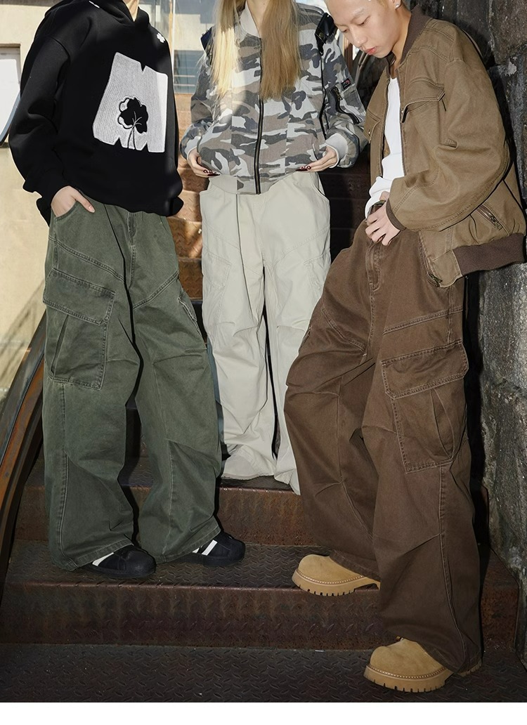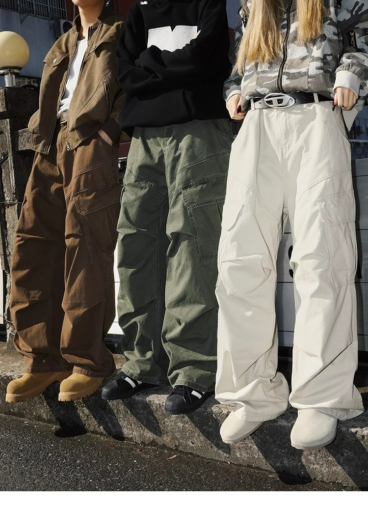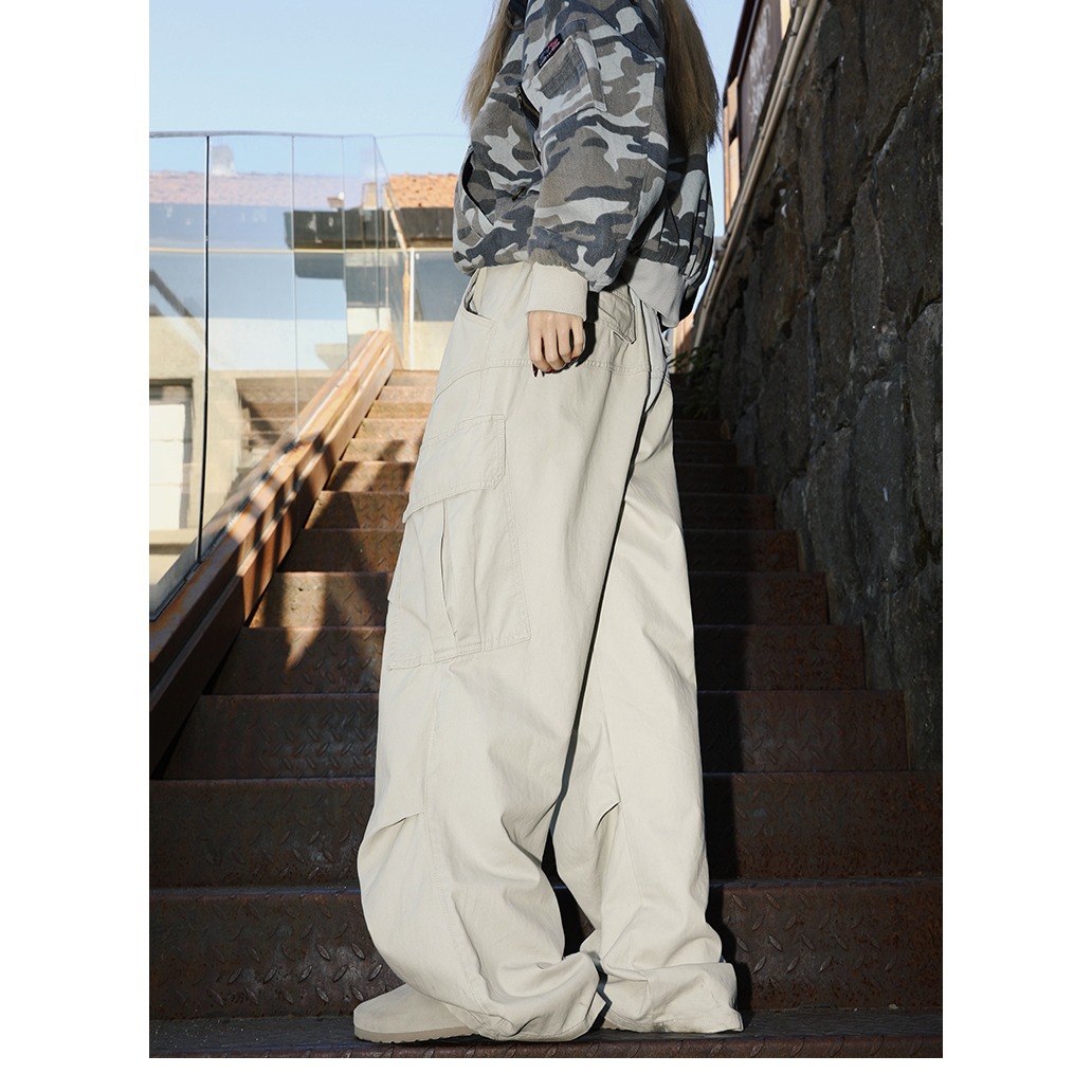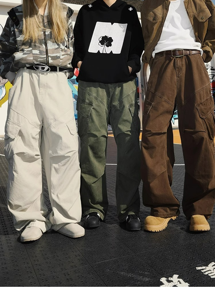 일본 스타일 주름 낙하산 귀여운 바지 남자 봄 새로운 큰 포켓 유행 브랜드 레트로 하이 스트리트 느슨한 캐주얼 바지스토어 가기