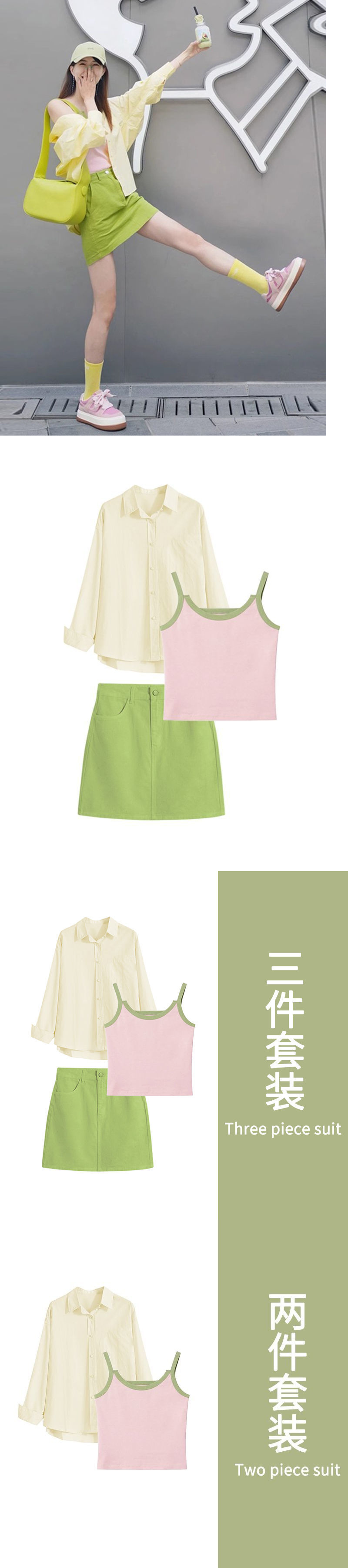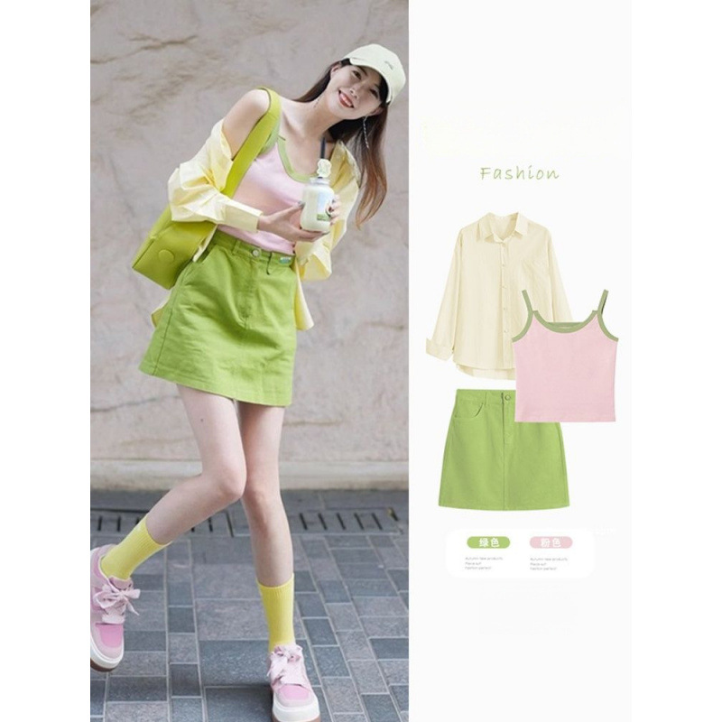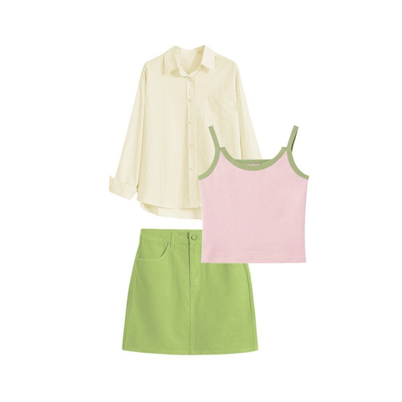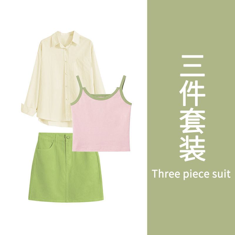도파민 착용 여름 세트 여성 2025 새로운 선 스크린 셔츠 카미 솔 슬림 핏 스커트 3 피스 세트