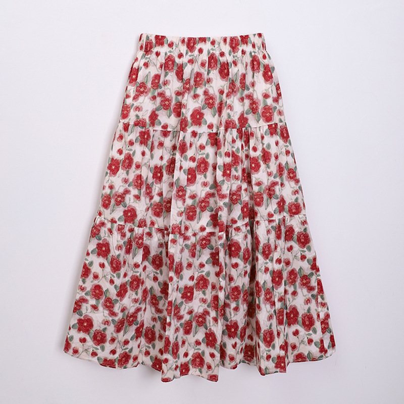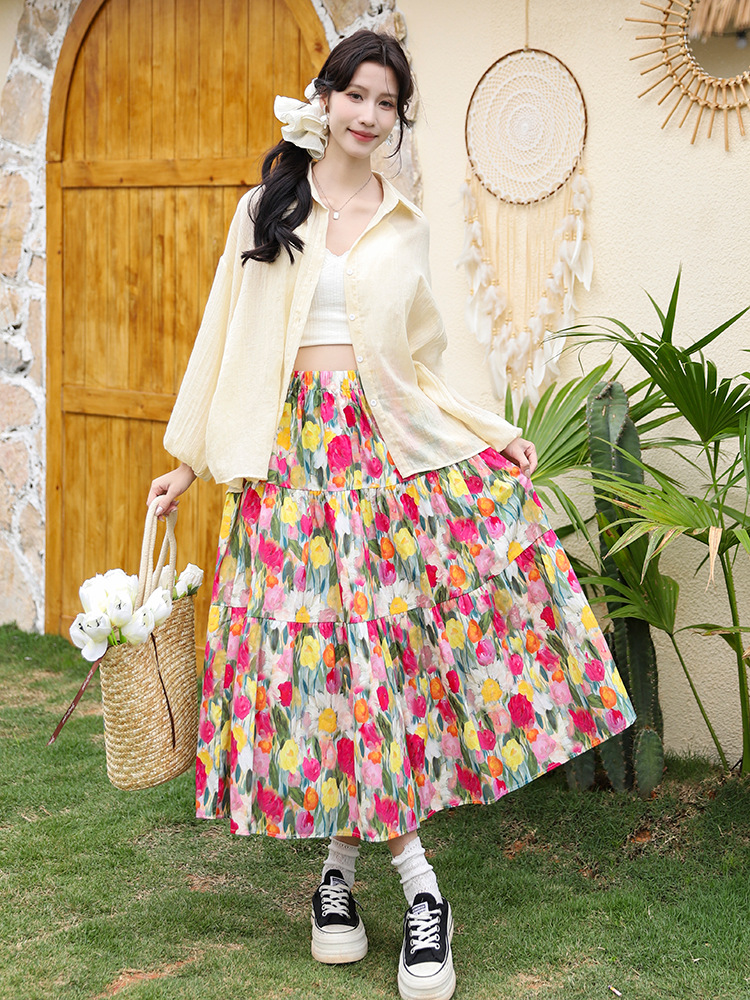여름 달콤한 목가적 인 스타일 모네 유화 인쇄 치마 여성의 높은 허리 꽃 A-라인 스커트 큰 스윙 느슨한 긴 스커트