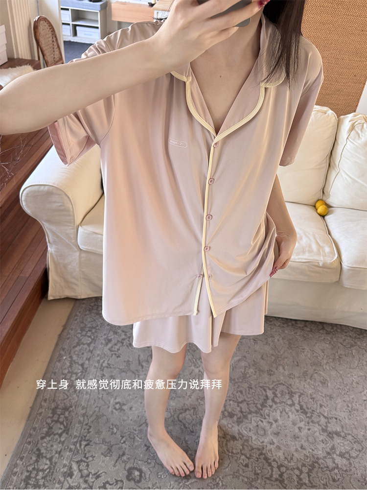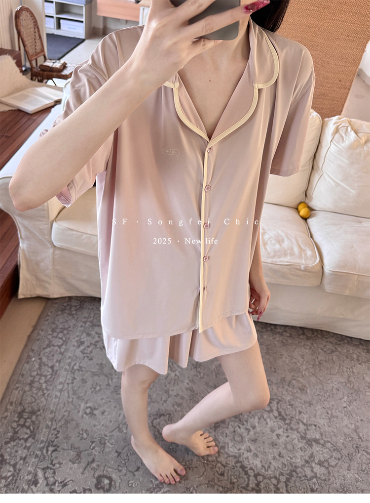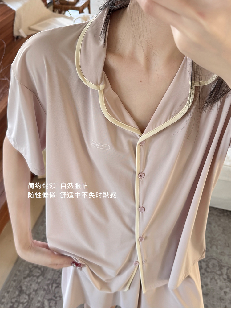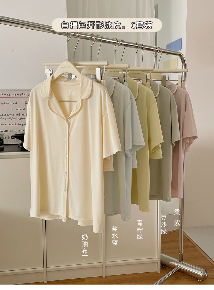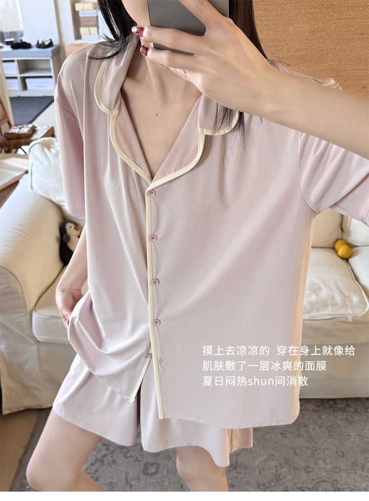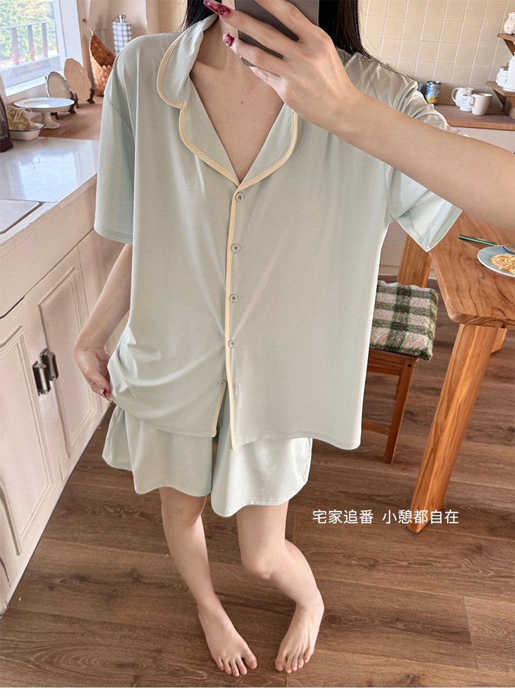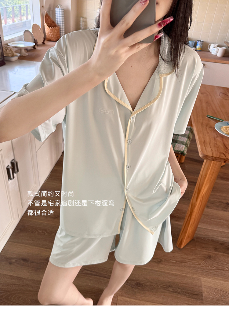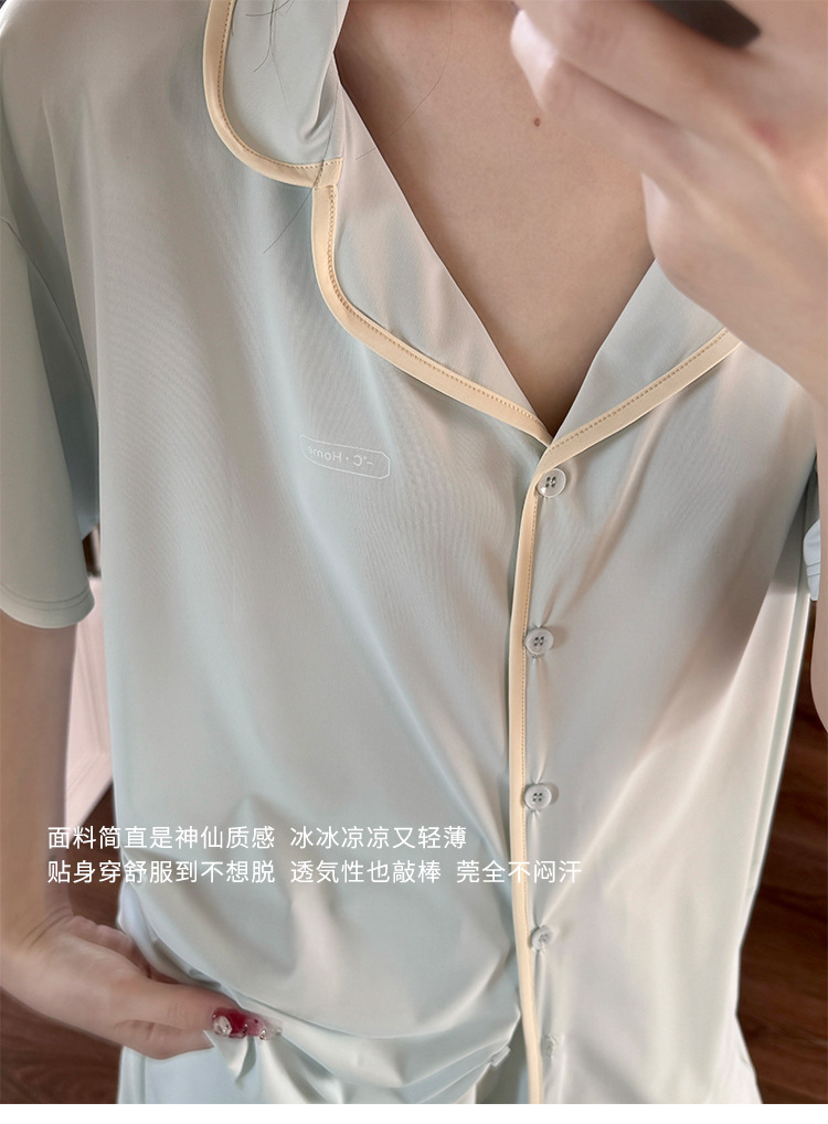 여름 새로운 대비 카디건 아이스 스킨 파자마 세트 느슨한 반팔 반바지 얇은 홈 의류 여성용 투피스 세트