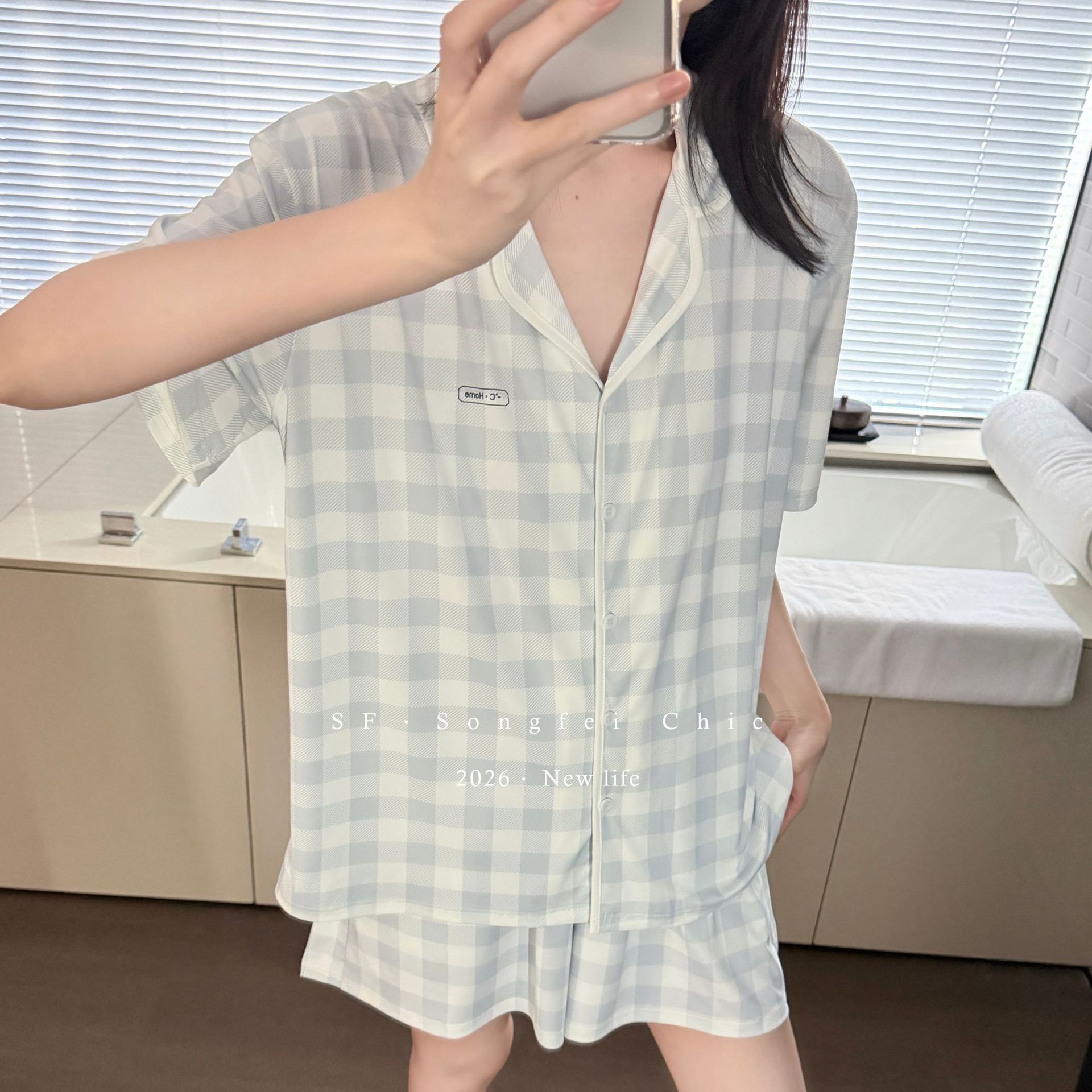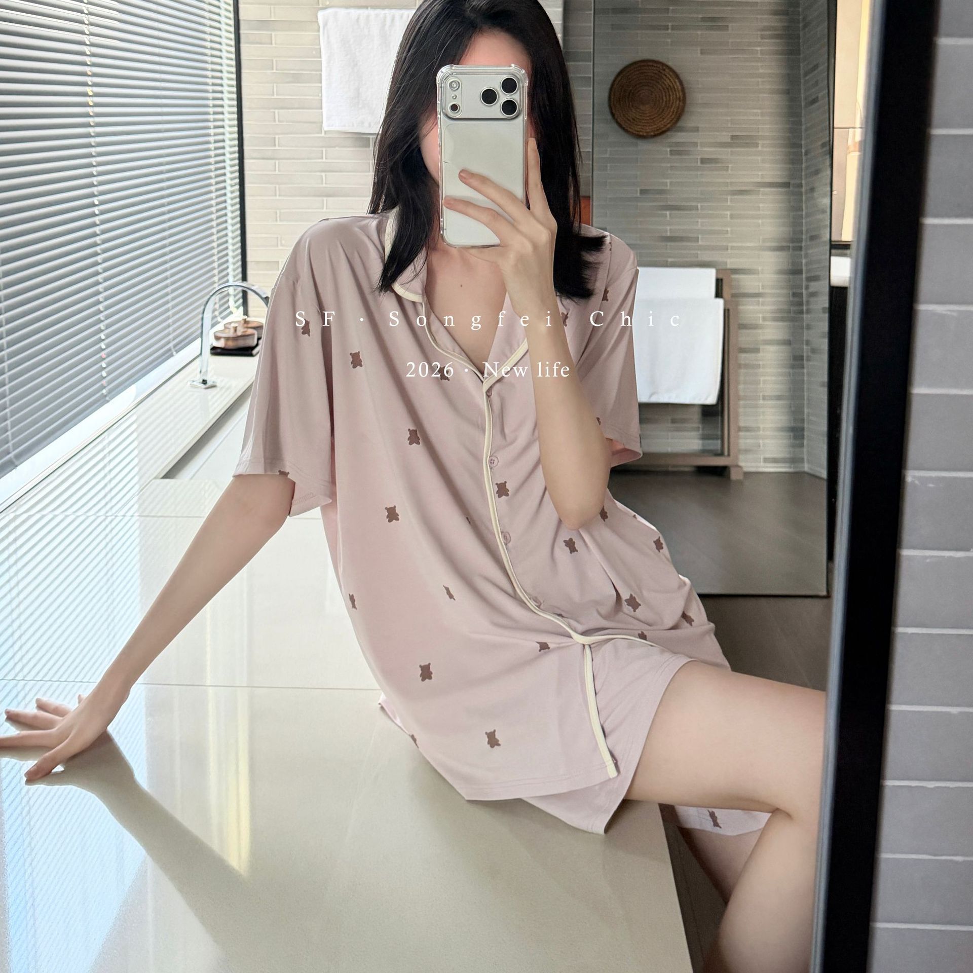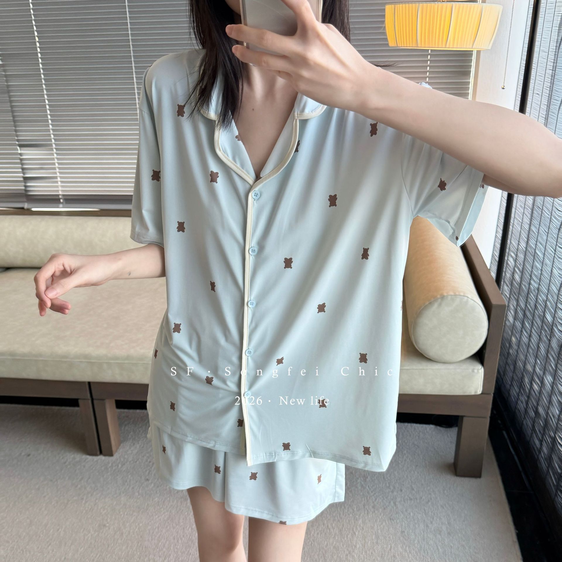 여름 새로운 대비 카디건 아이스 스킨 파자마 세트 느슨한 반팔 반바지 얇은 홈 의류 여성용 투피스 세트스토어 가기