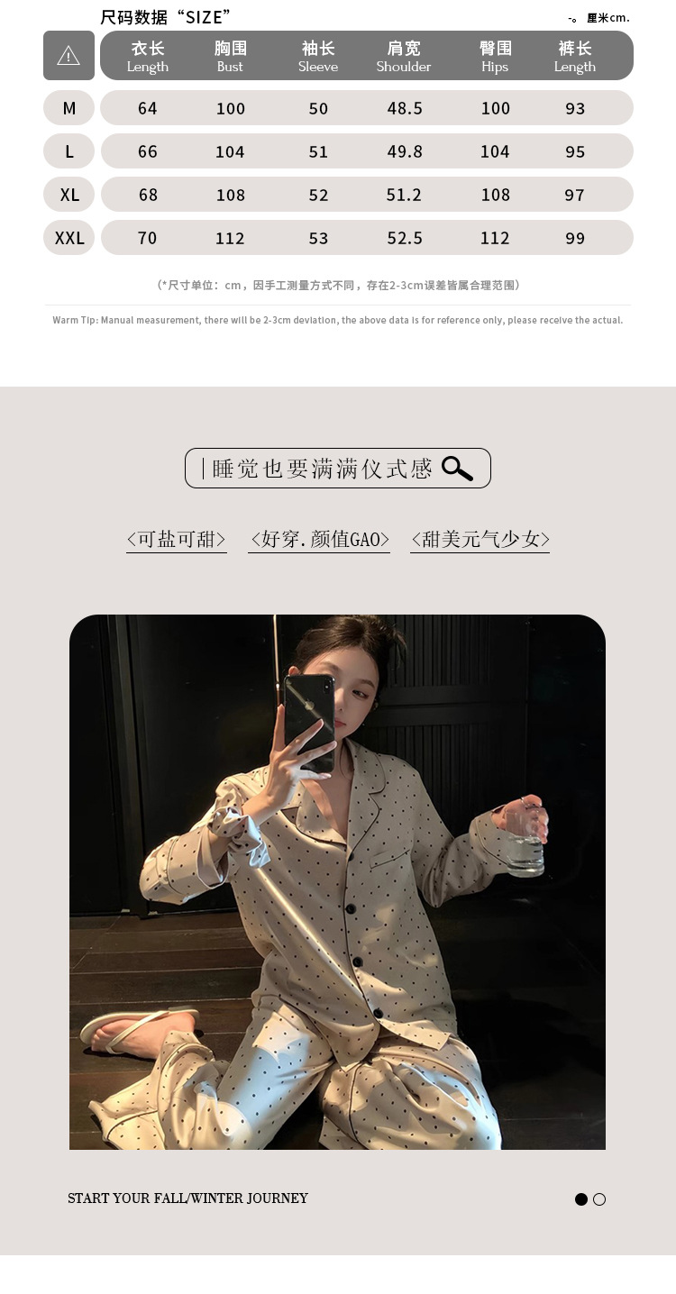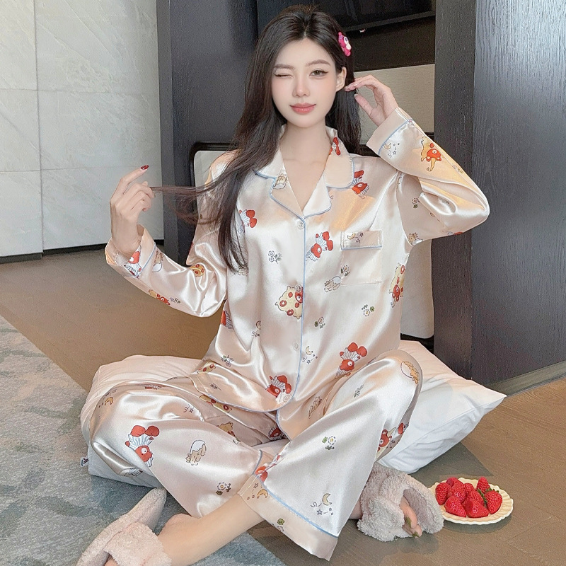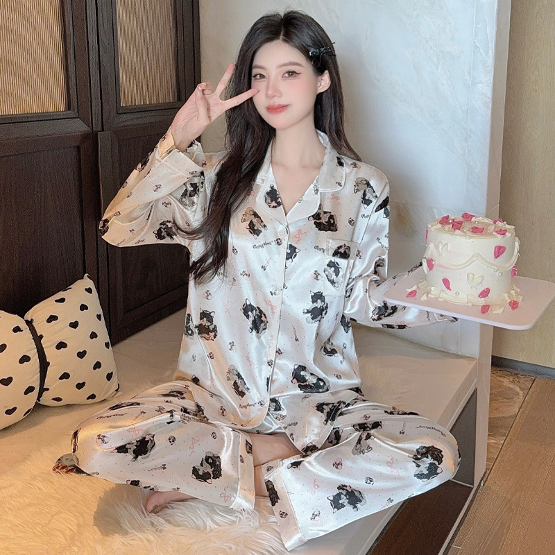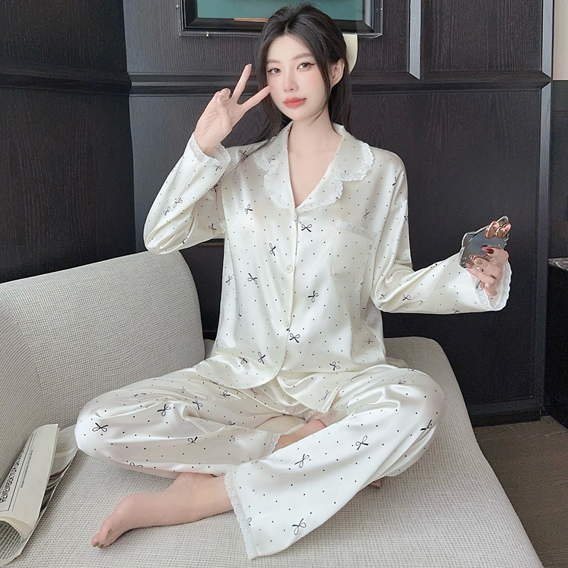 프랑스 나이를 줄이는 잠옷 여성의 봄과 가을 새로운 간단한 웨이브 도트 긴 소매 바지 아이스 실크 홈 의류 패션 세트 도매