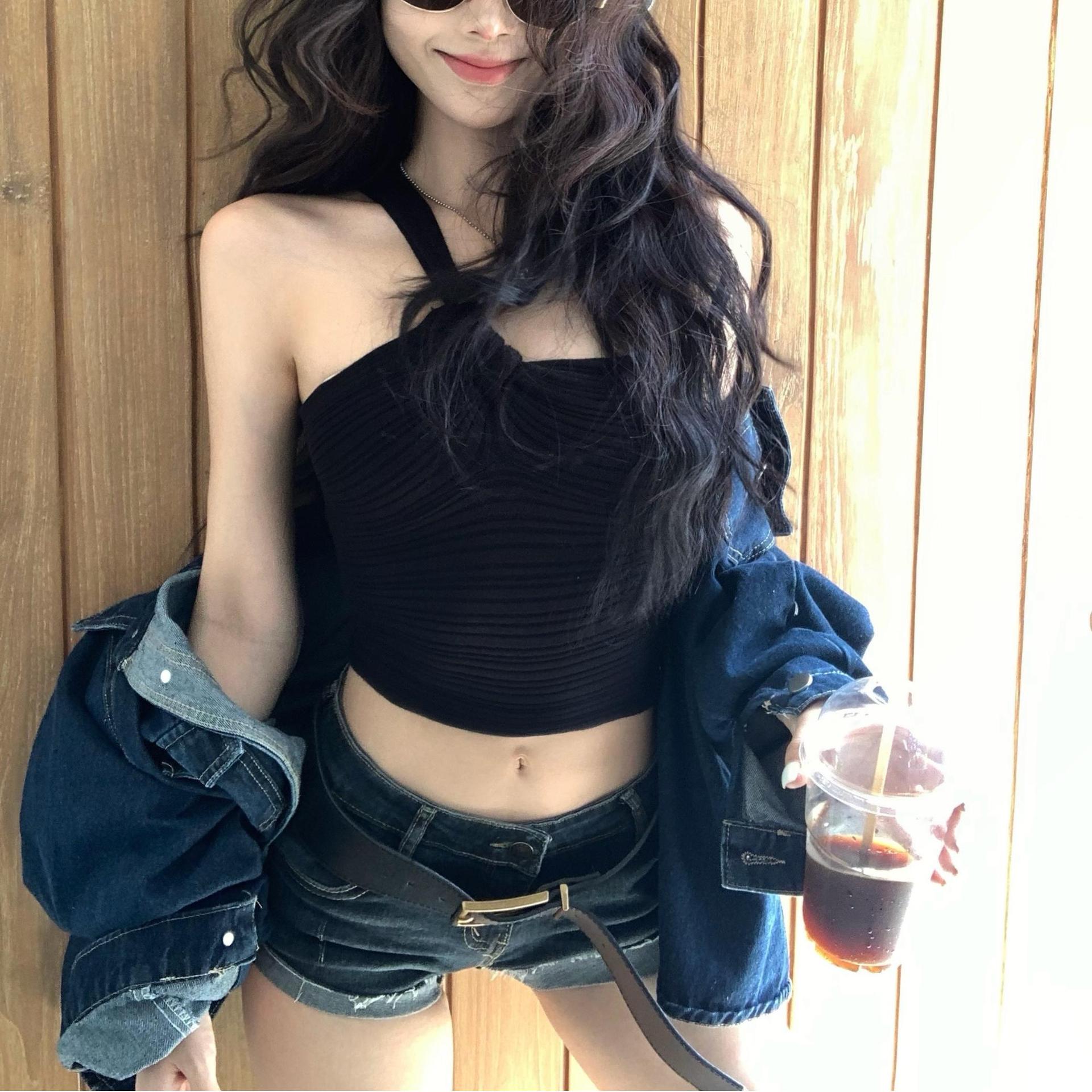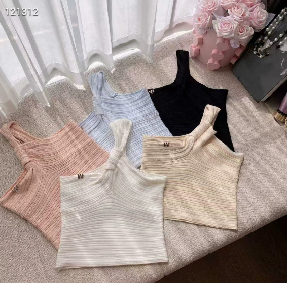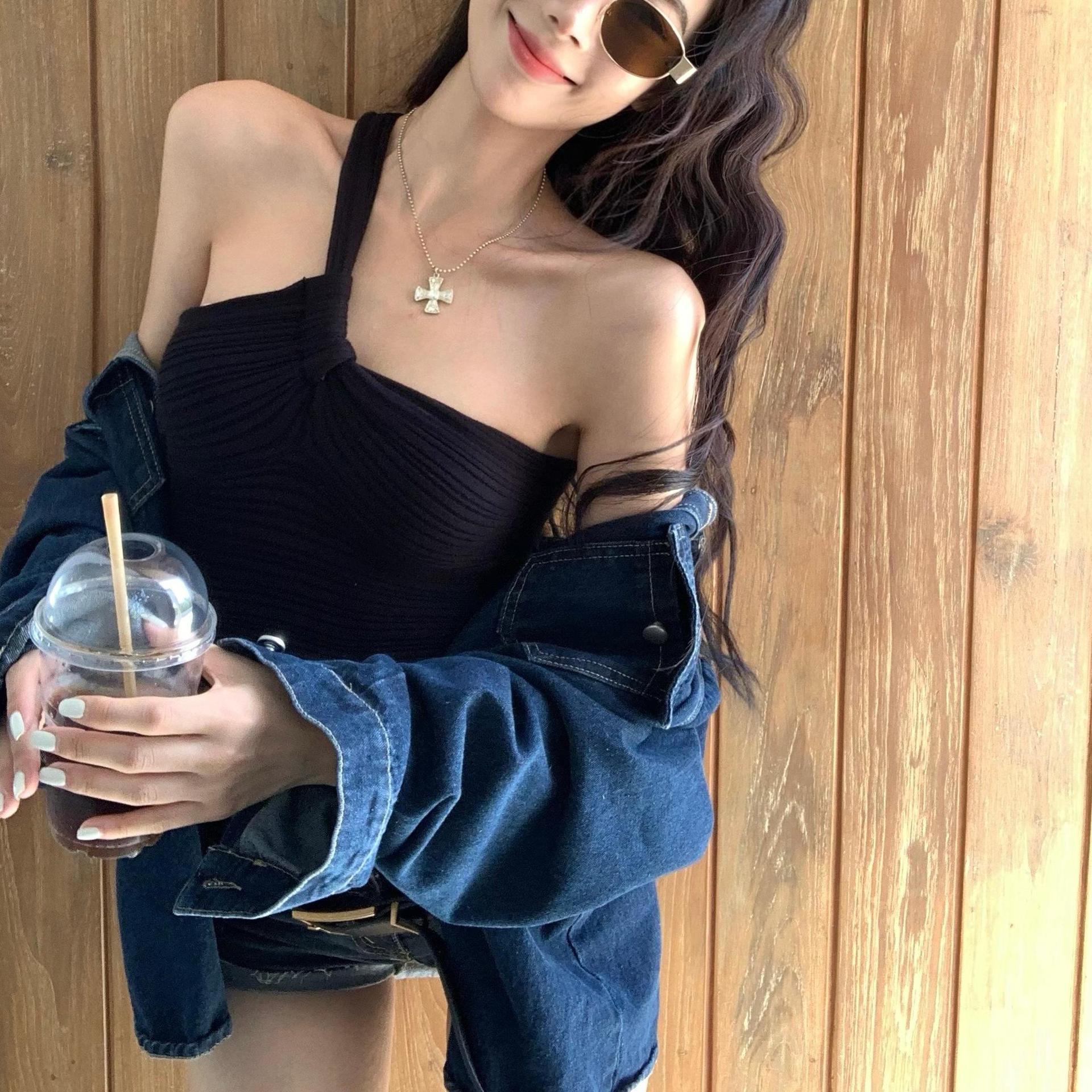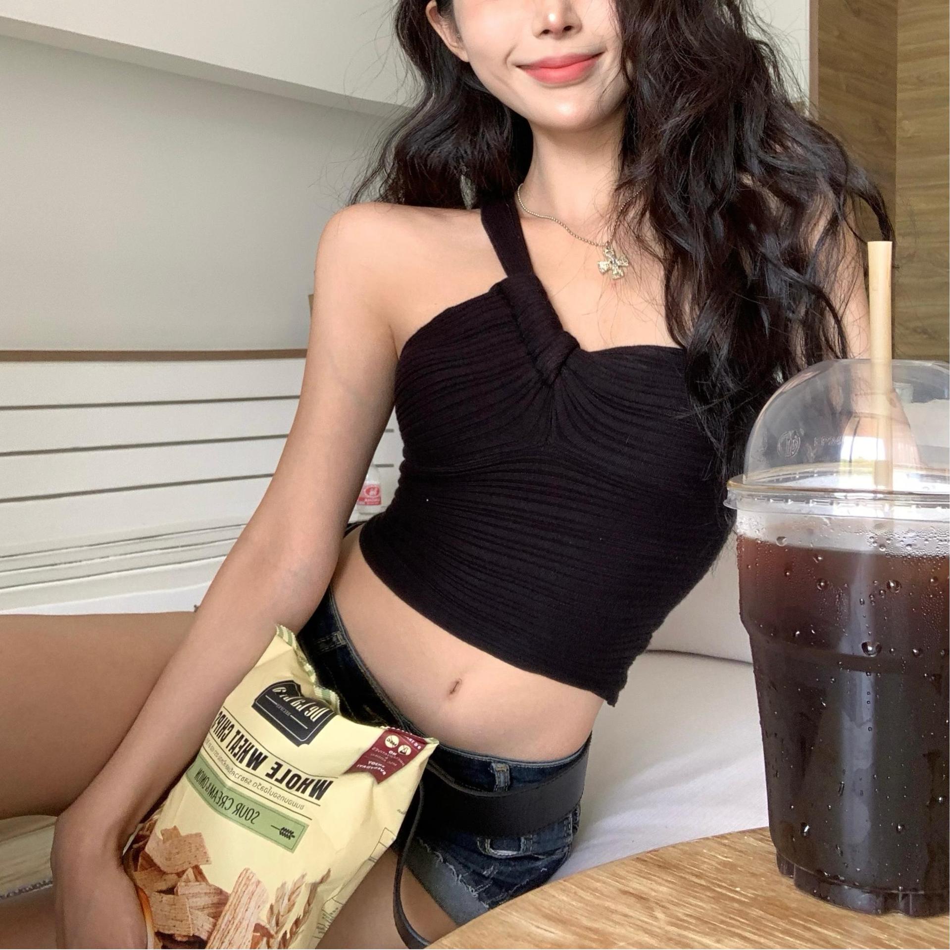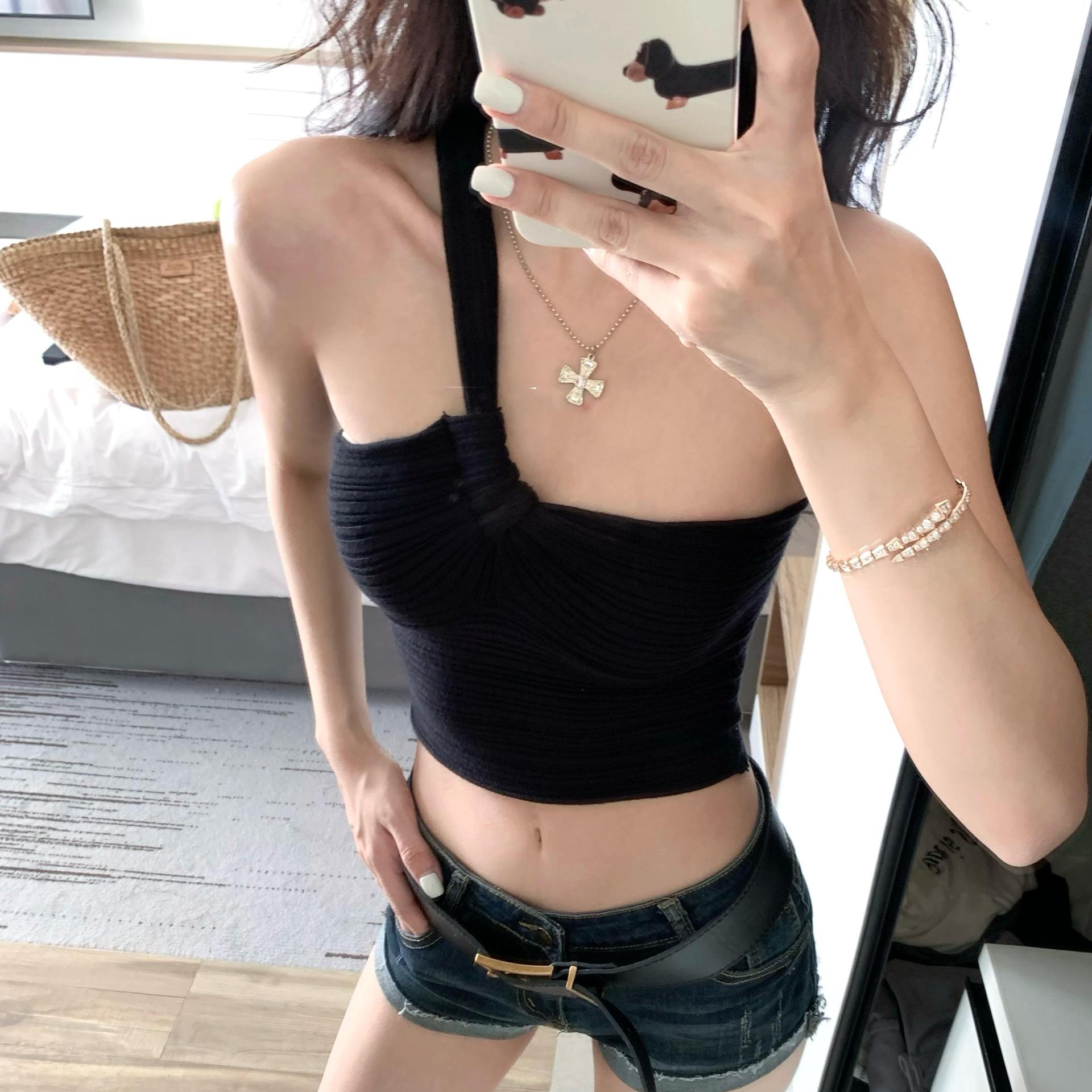 2025 여름 새로운 분홍색 디자인 섹시한 뜨거운 소녀 스타일 조끼 여성 어깨 슬리밍 짧은 니트 민소매 탑스토어 가기