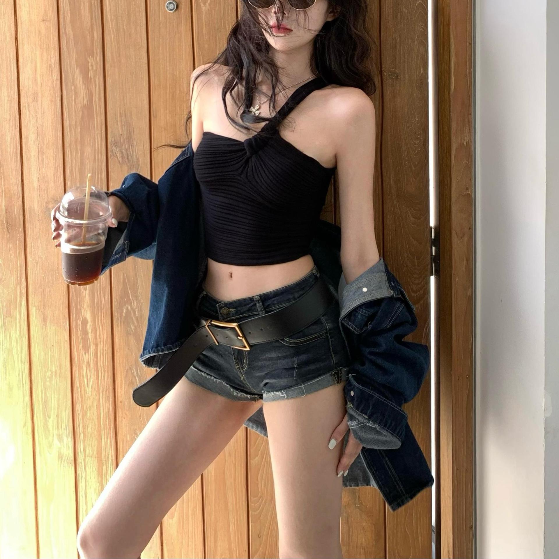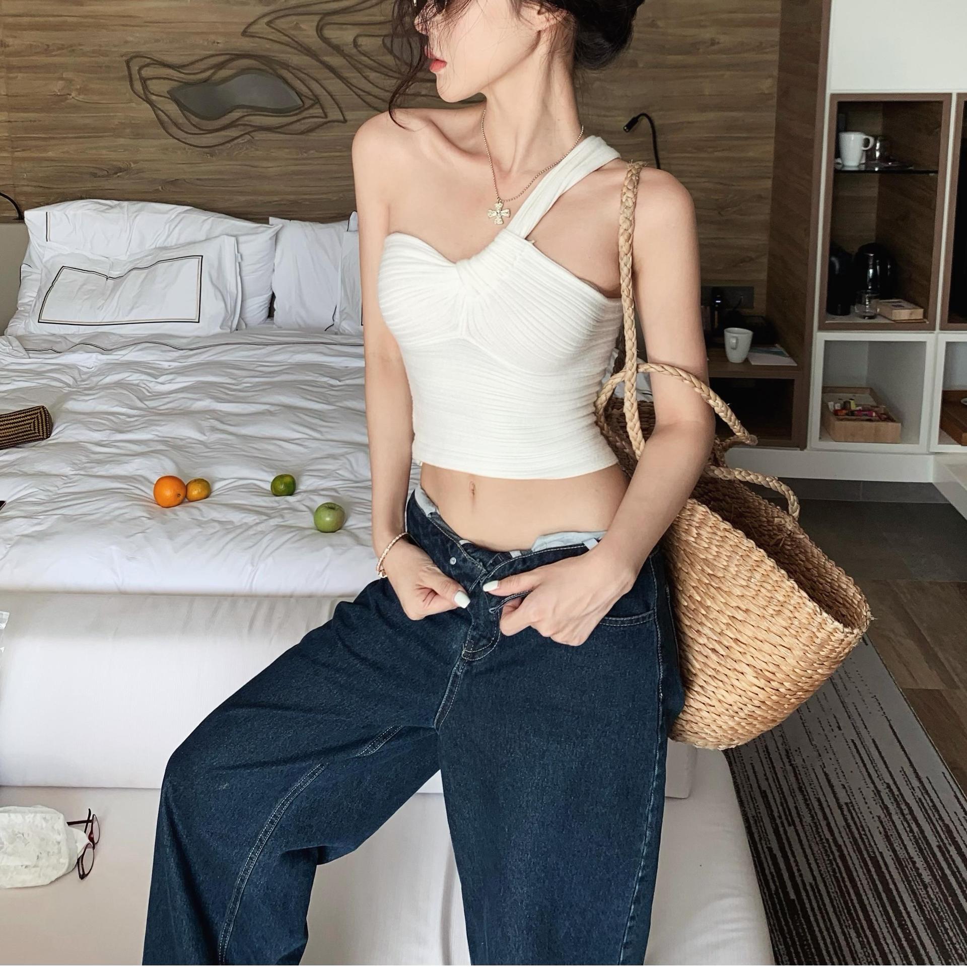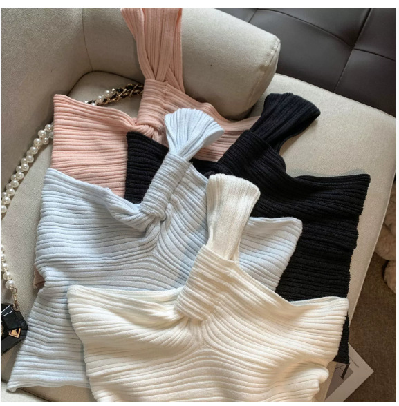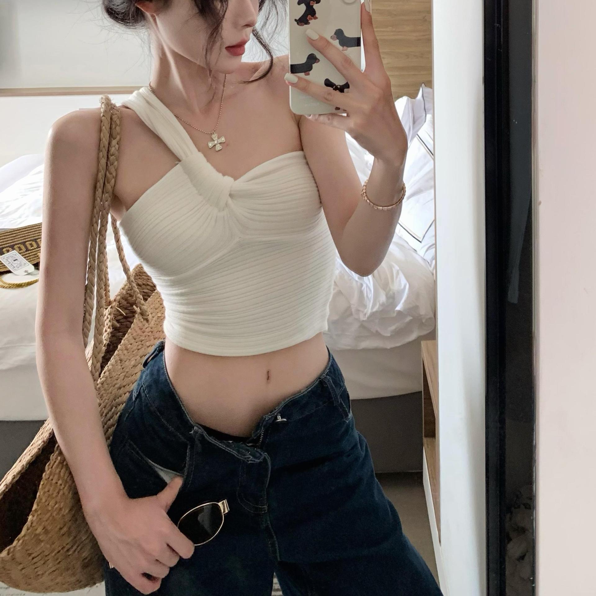 2025 여름 새로운 분홍색 디자인 섹시한 뜨거운 소녀 스타일 조끼 여성 어깨 슬리밍 짧은 니트 민소매 탑스토어 가기