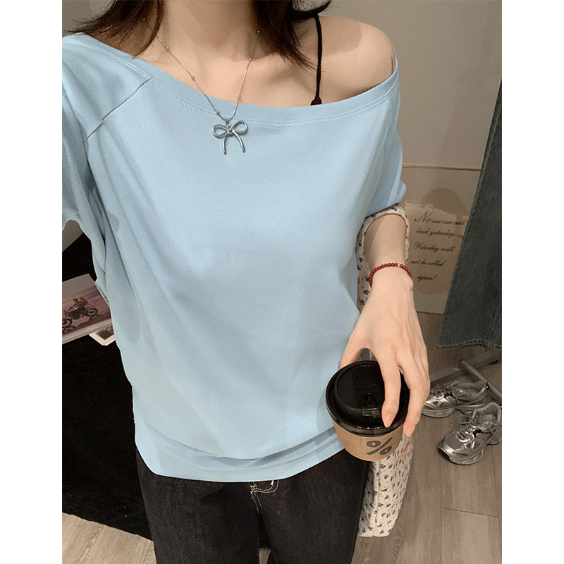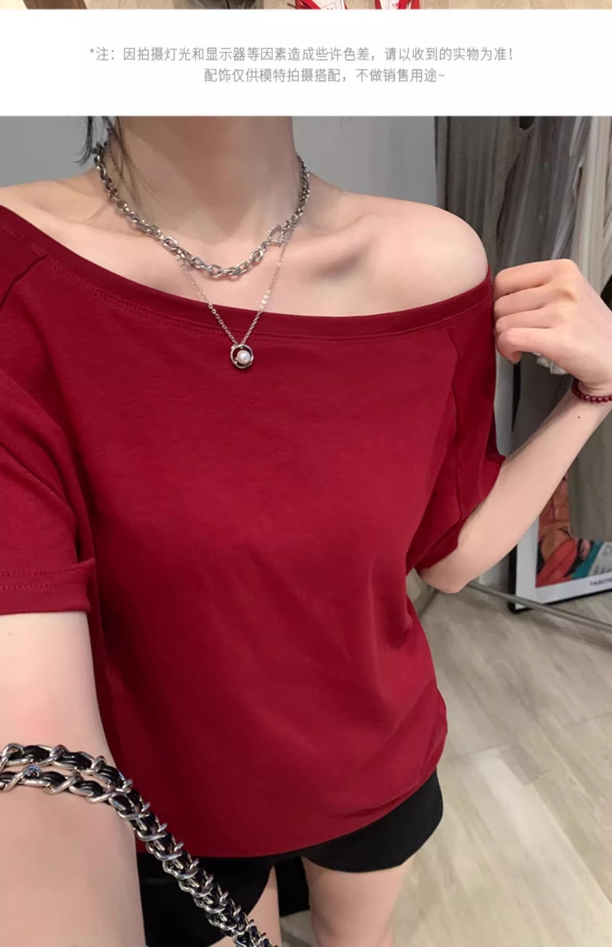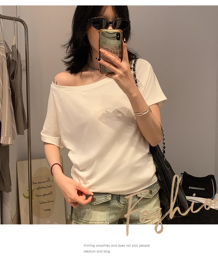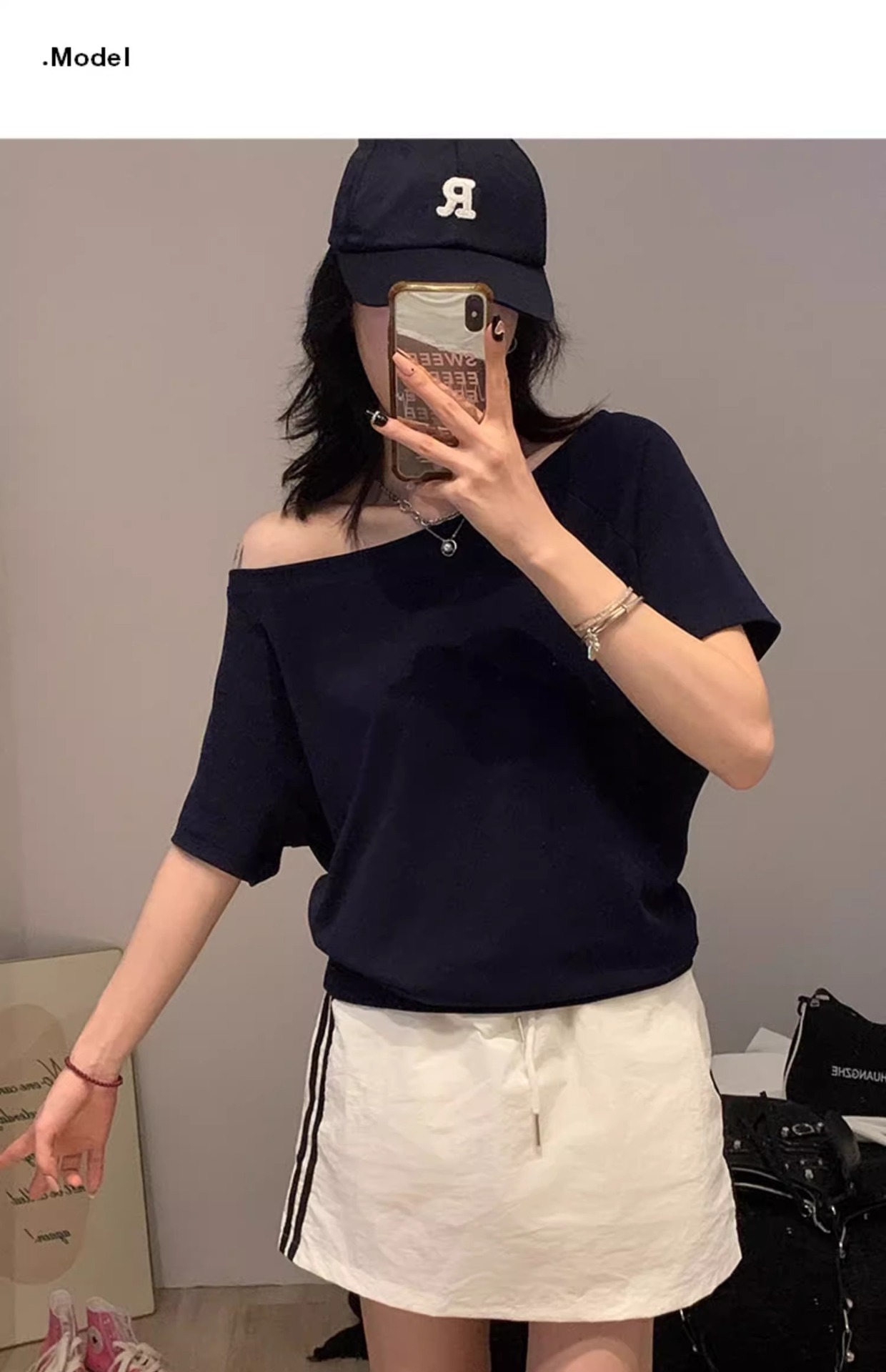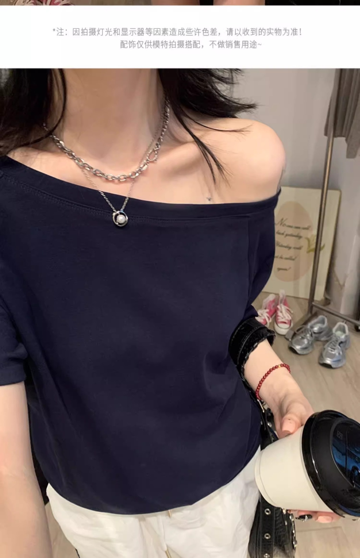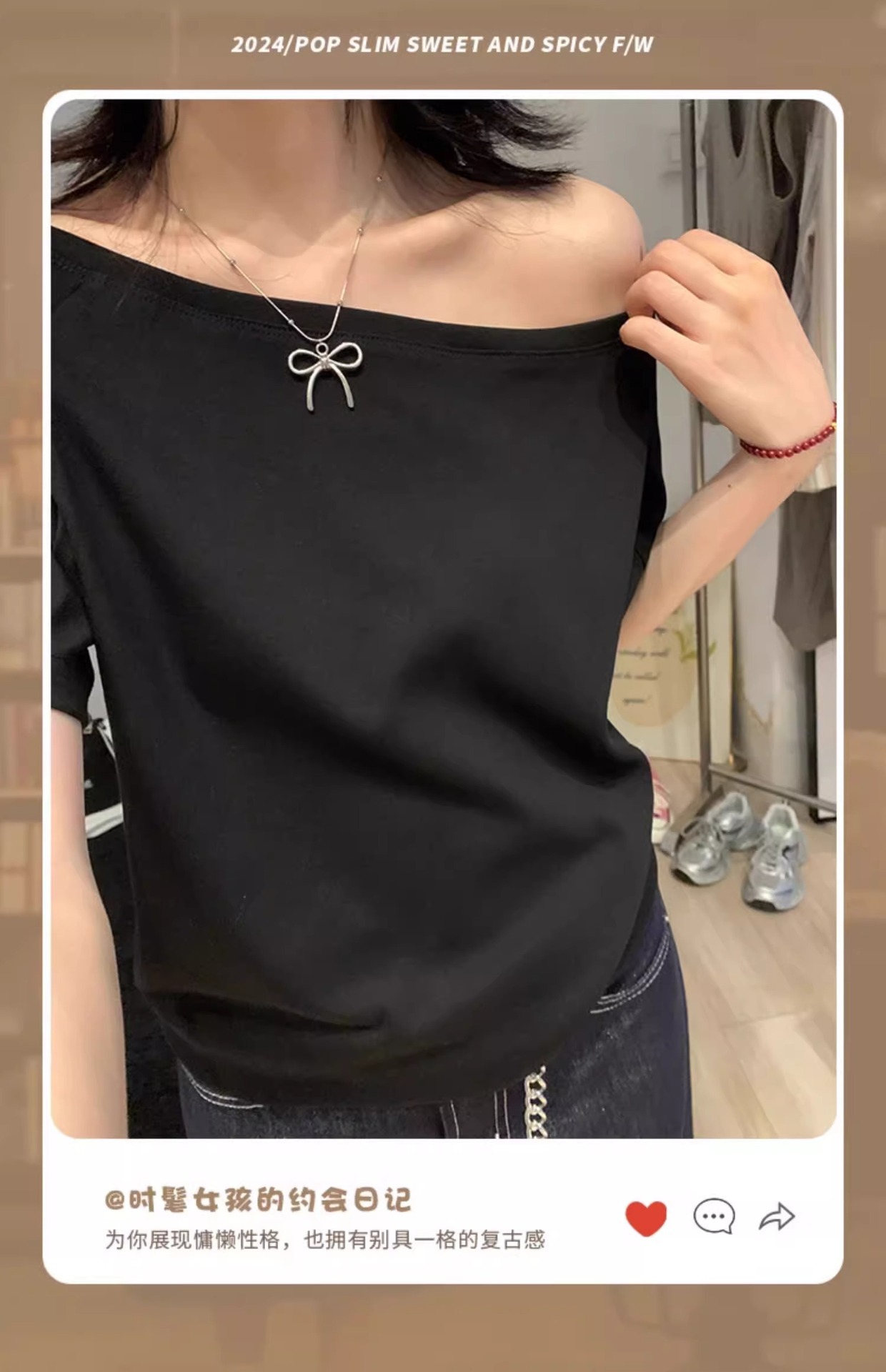 한 캐릭터 칼라 오프 숄더 디자인 편안한 솔리드 컬러 반팔 티셔츠 여성의 여름 2024 새로운 비스듬한 어깨 하이 엔드 탑스토어 가기