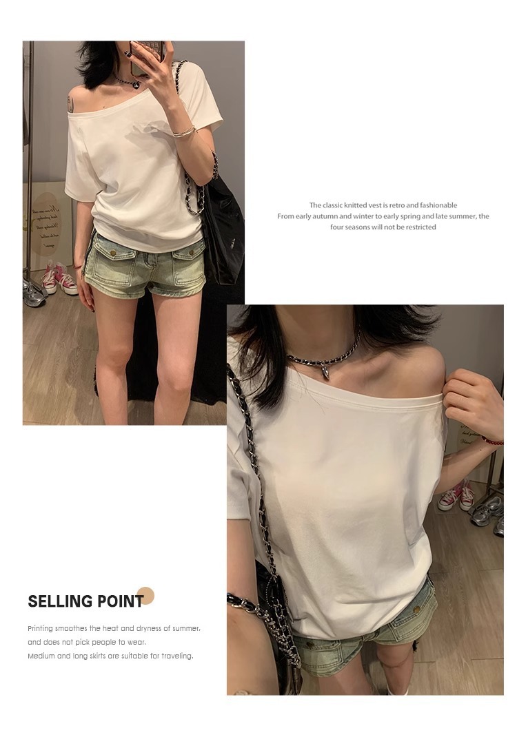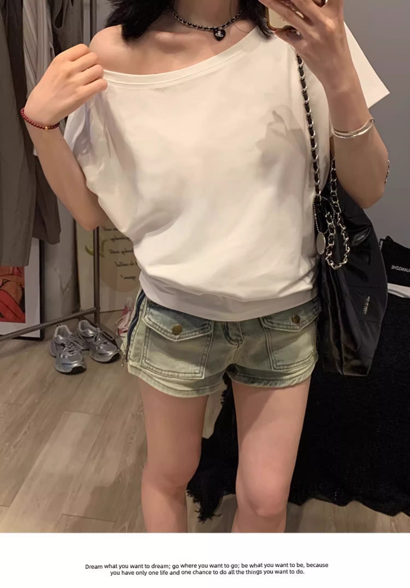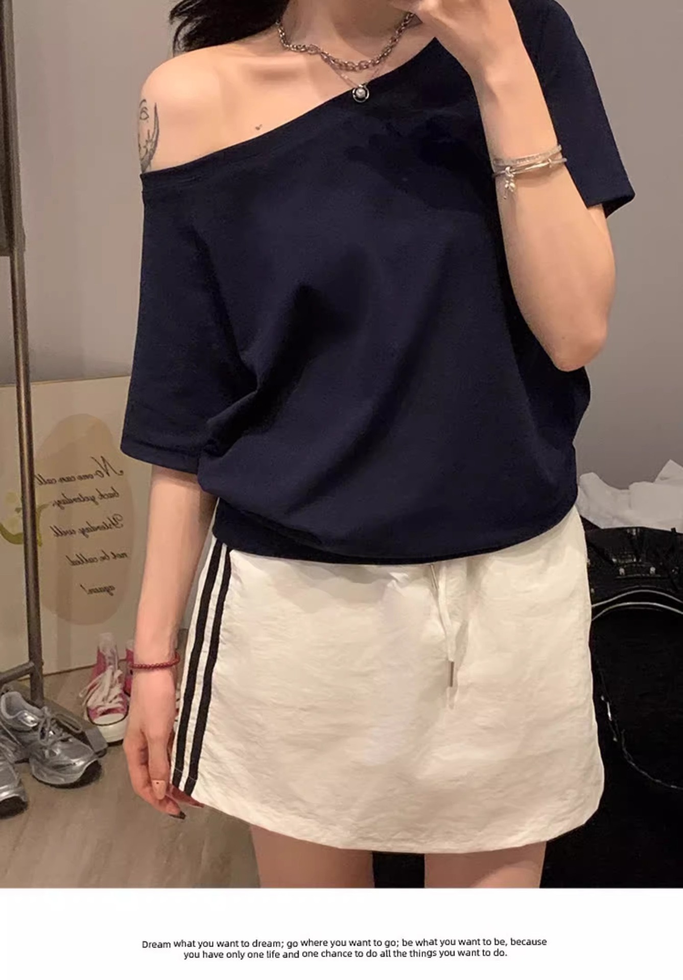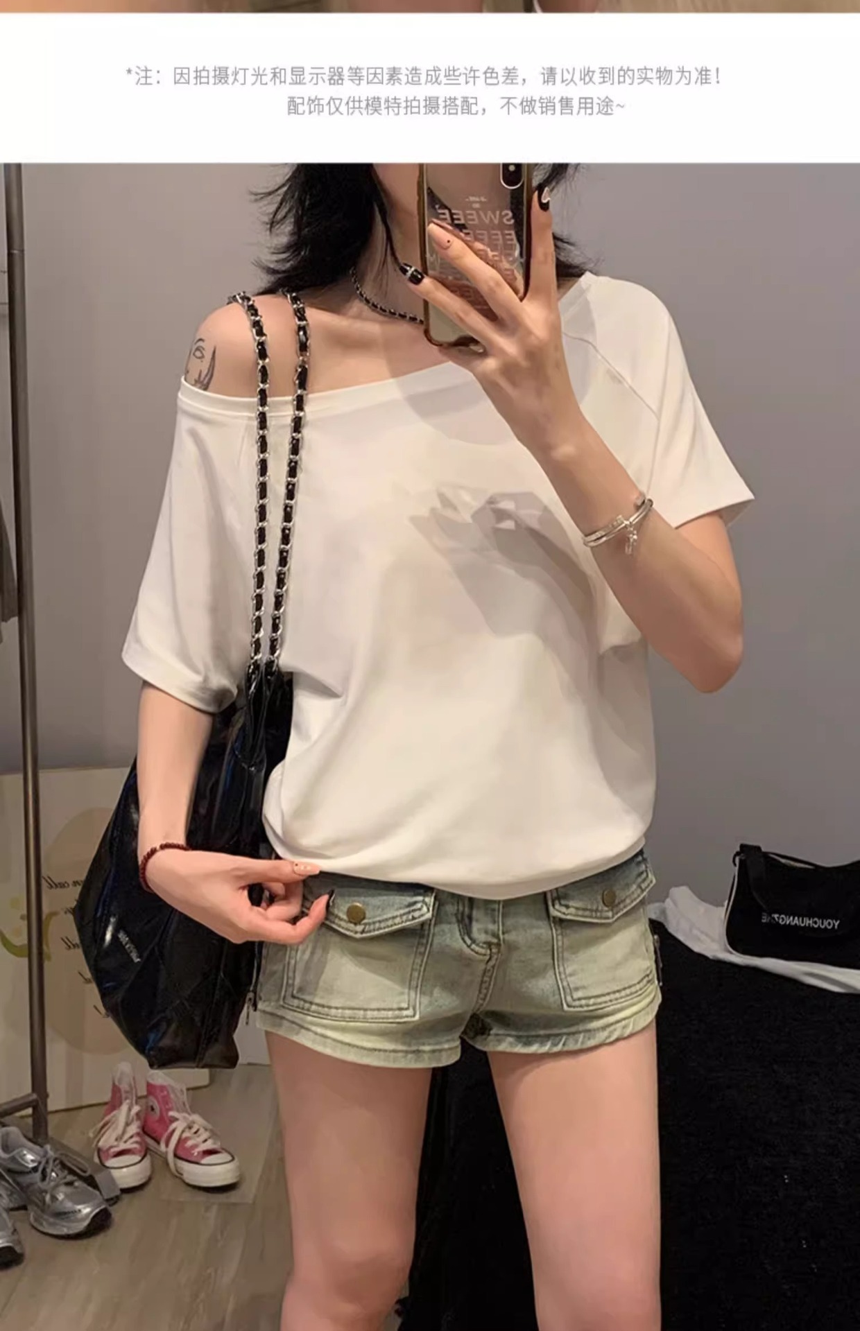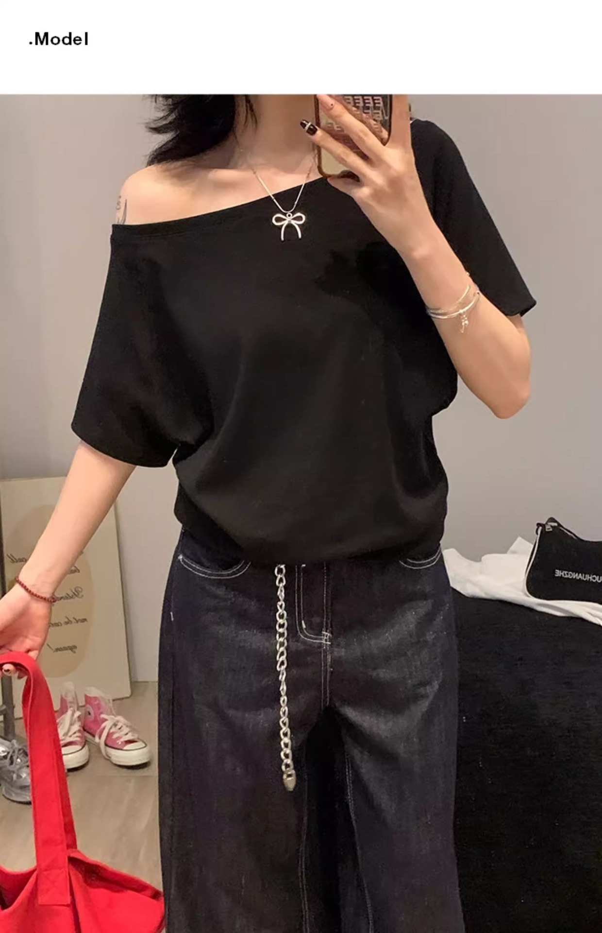 한 캐릭터 칼라 오프 숄더 디자인 편안한 솔리드 컬러 반팔 티셔츠 여성의 여름 2024 새로운 비스듬한 어깨 하이 엔드 탑스토어 가기