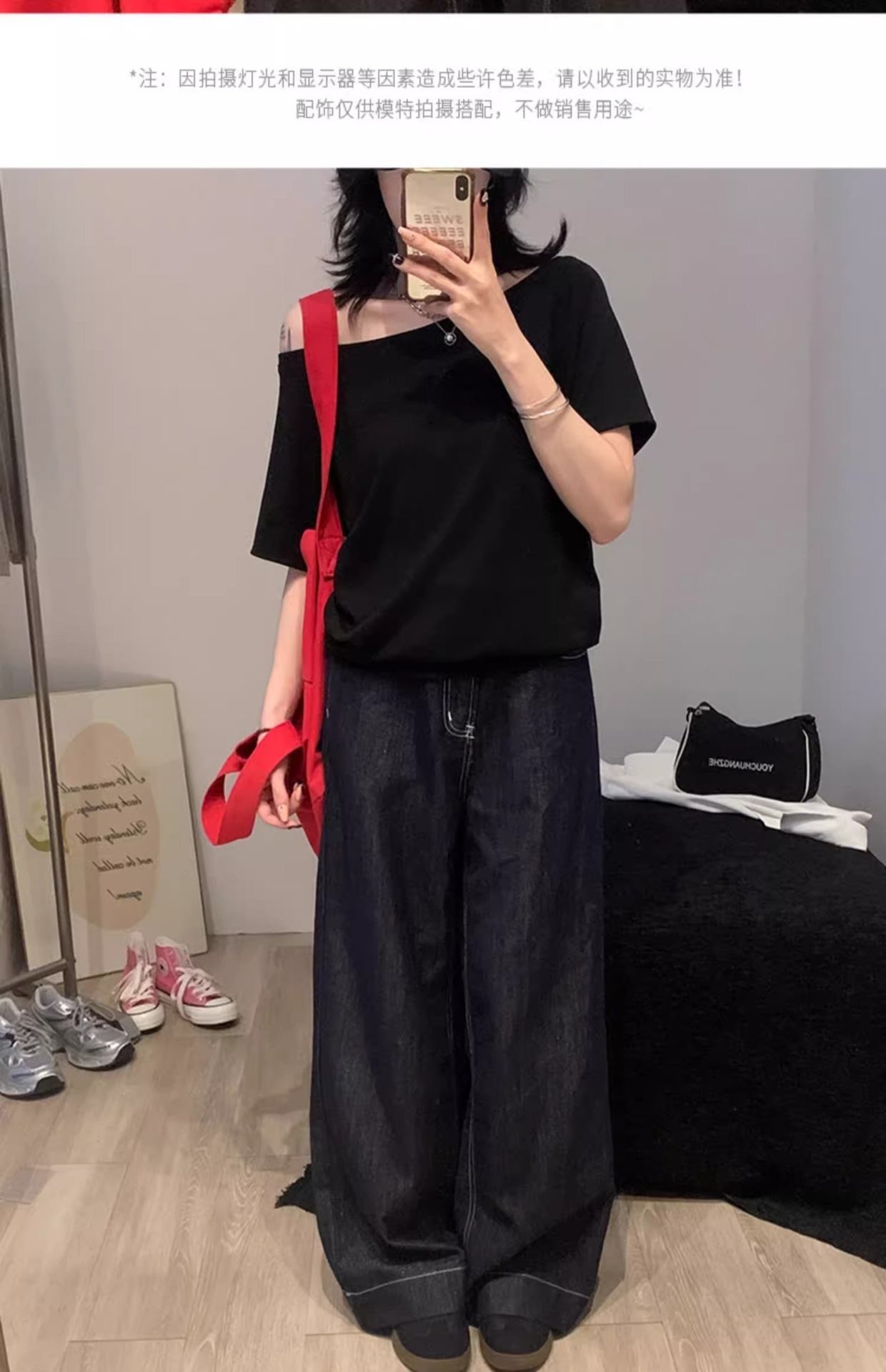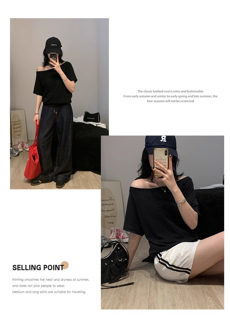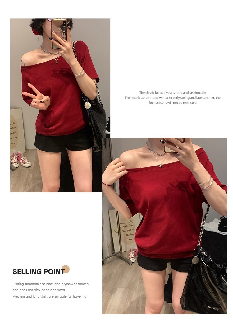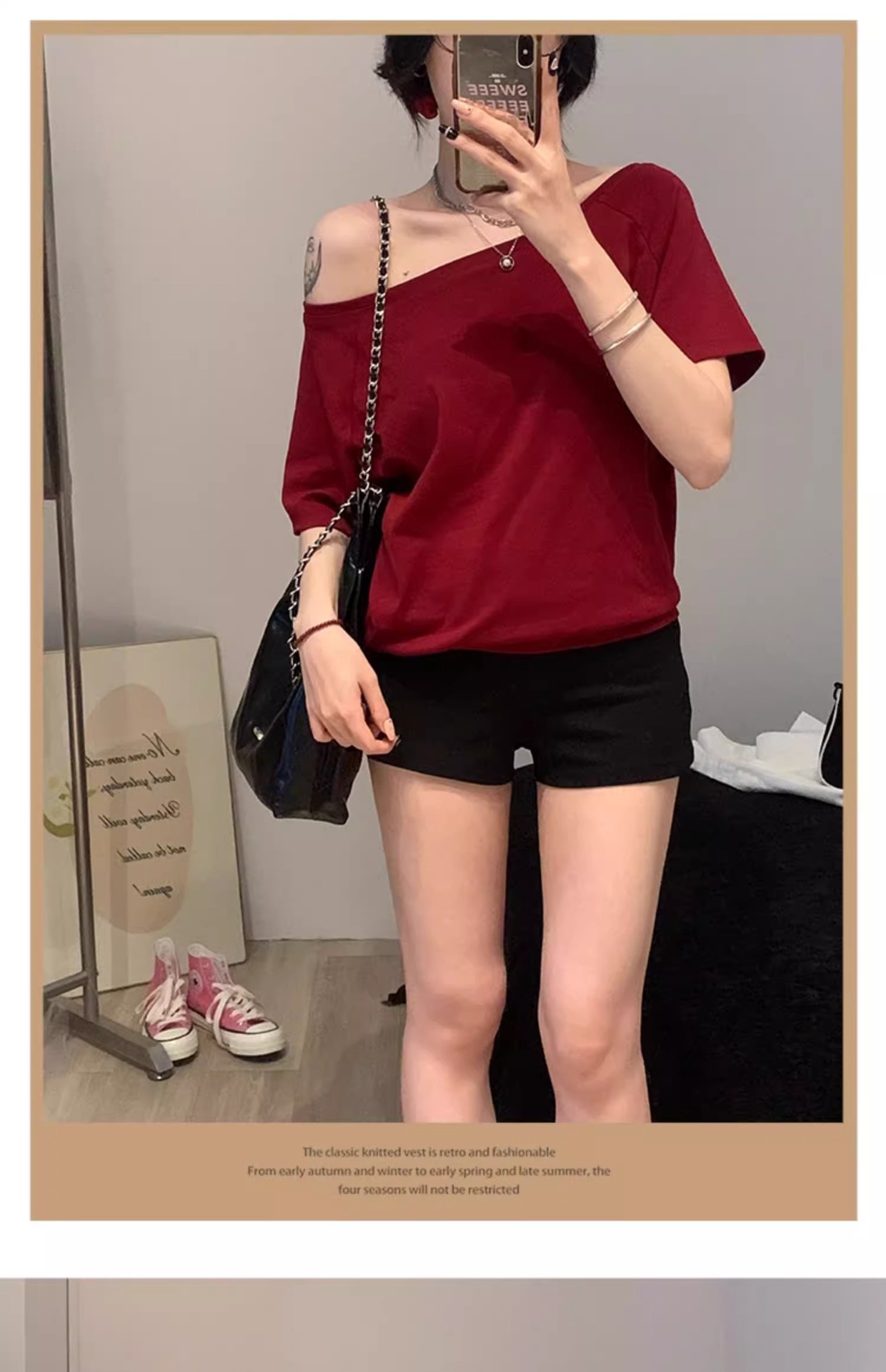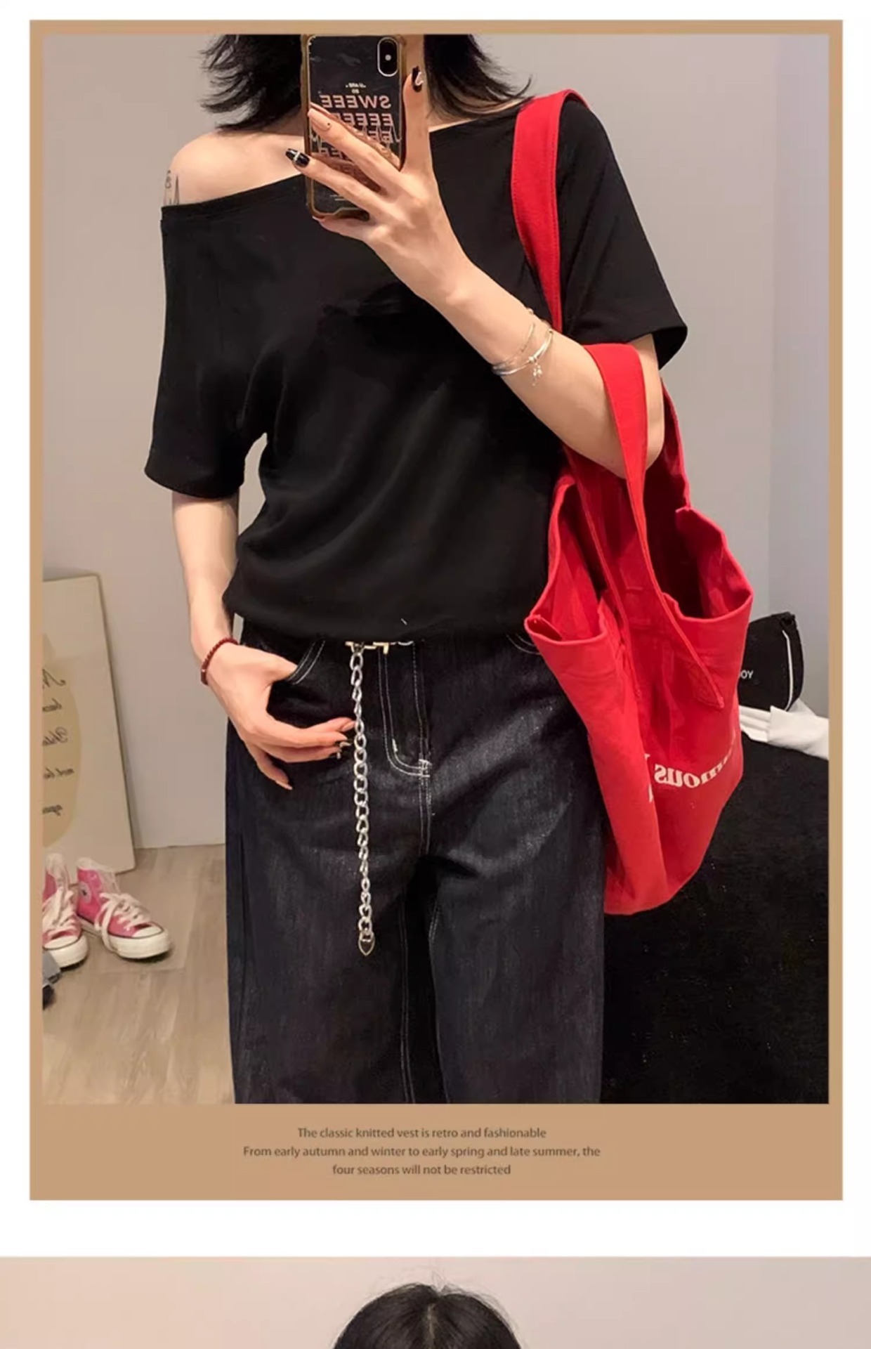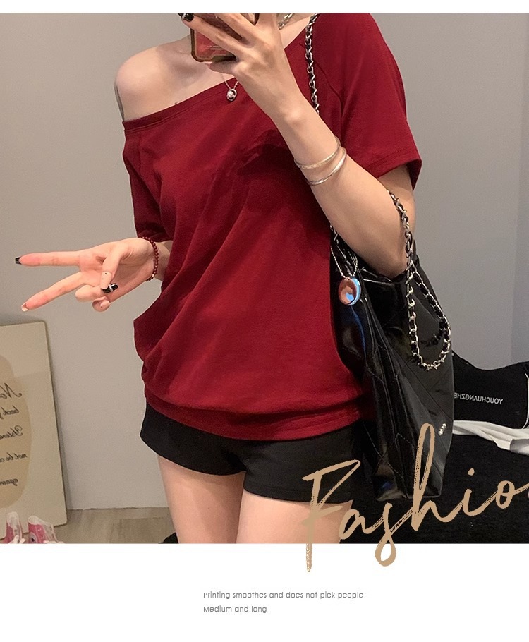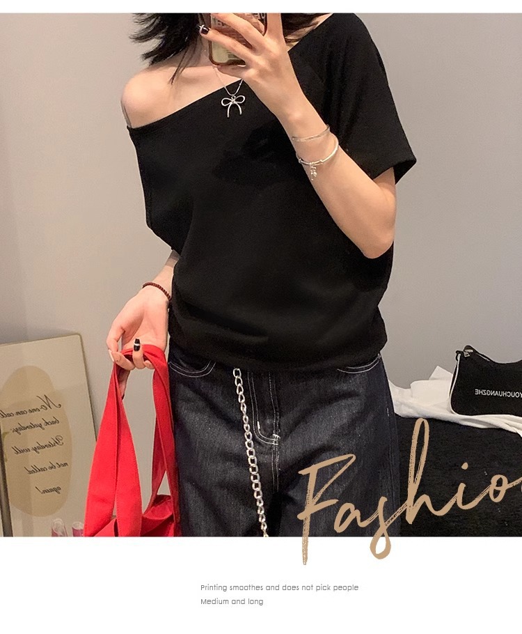 한 캐릭터 칼라 오프 숄더 디자인 편안한 솔리드 컬러 반팔 티셔츠 여성의 여름 2024 새로운 비스듬한 어깨 하이 엔드 탑스토어 가기