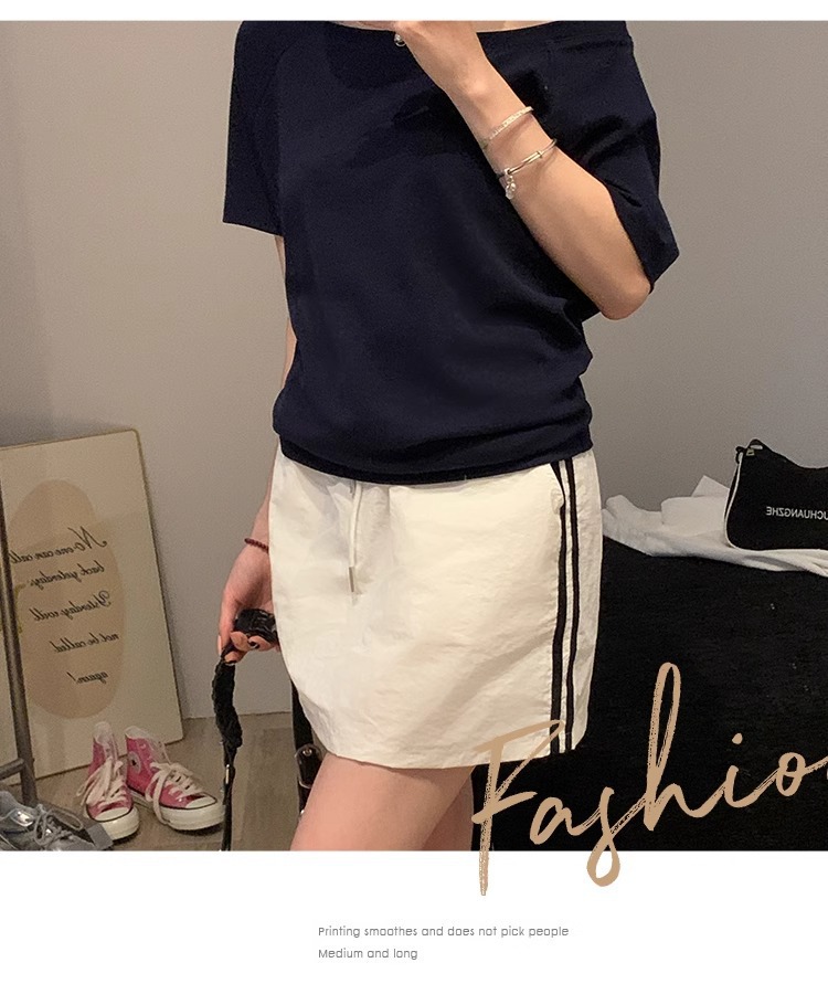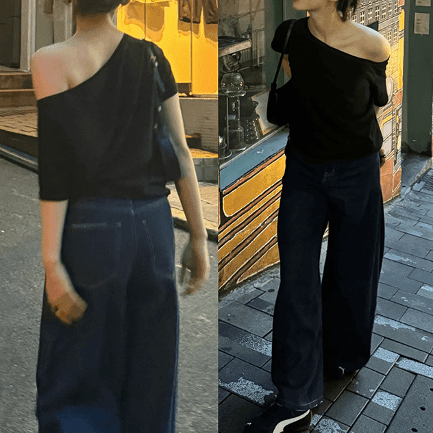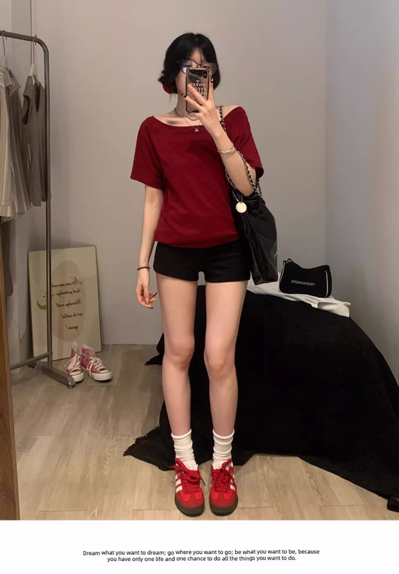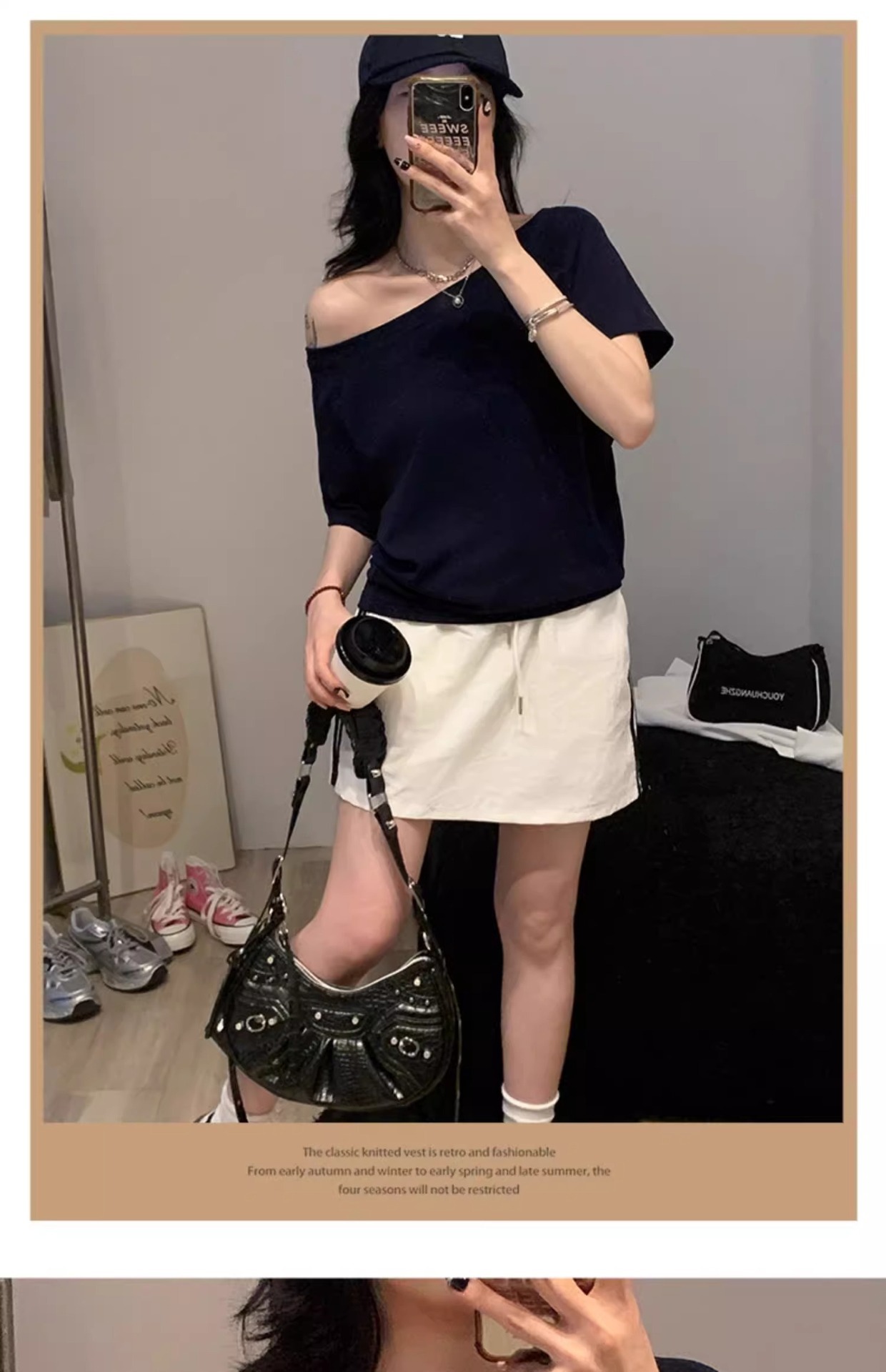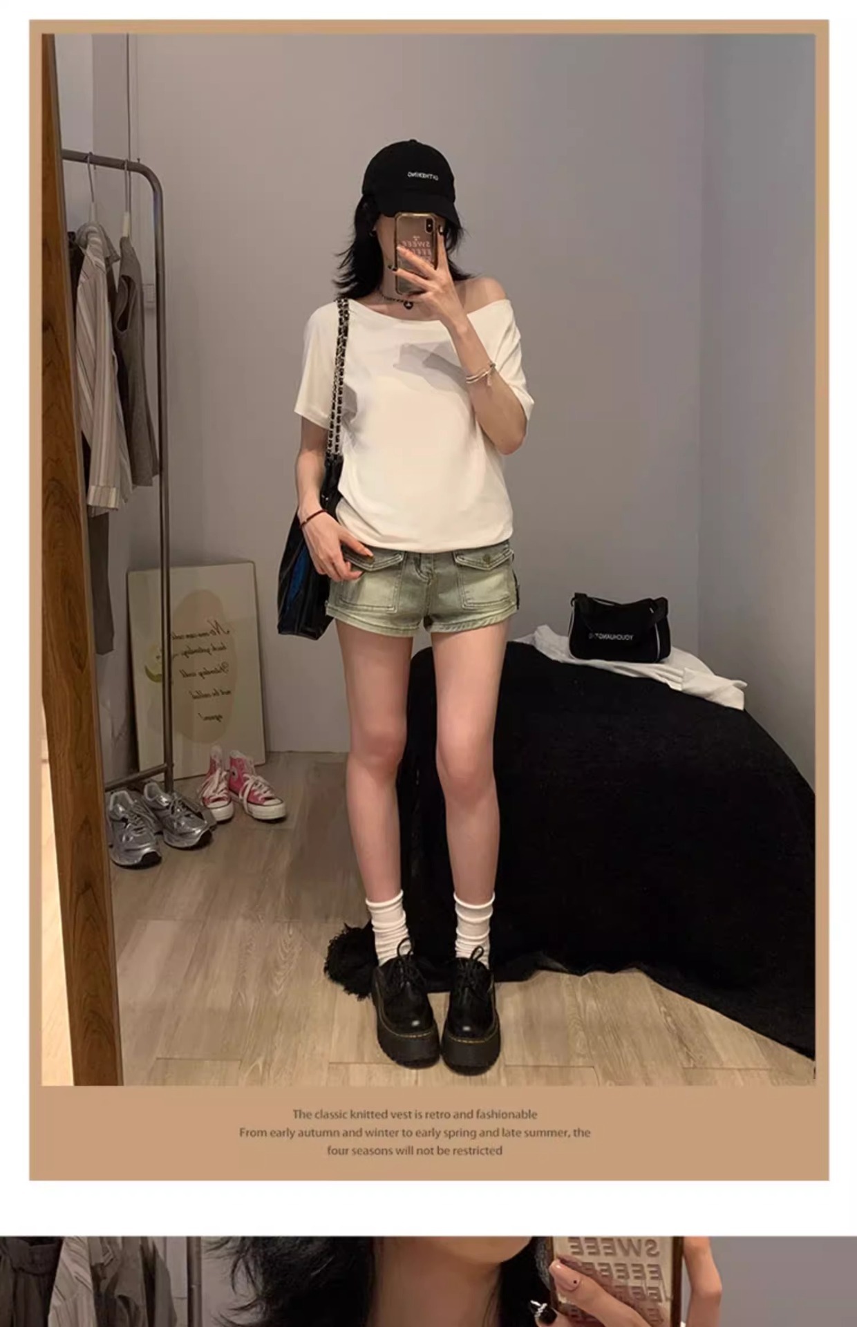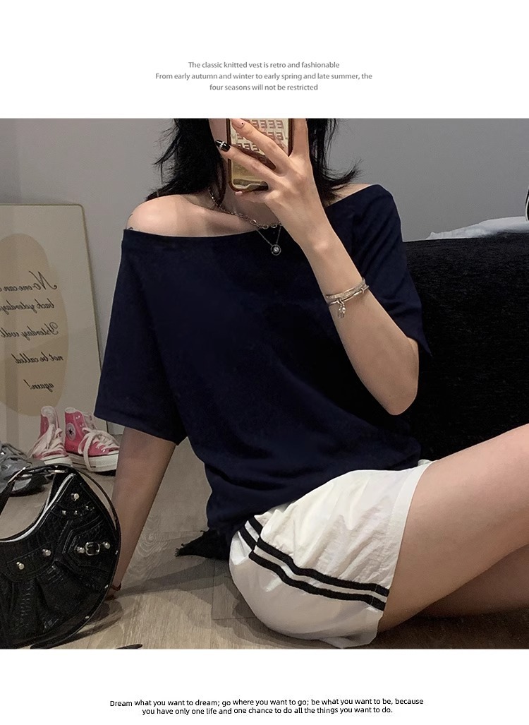 한 캐릭터 칼라 오프 숄더 디자인 편안한 솔리드 컬러 반팔 티셔츠 여성의 여름 2024 새로운 비스듬한 어깨 하이 엔드 탑스토어 가기