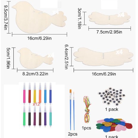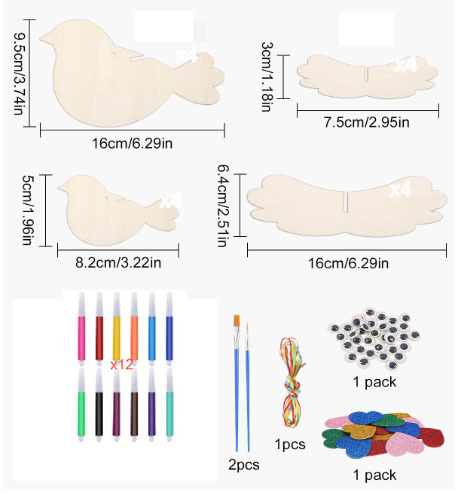 • 큰 새 6마리, 작은 새 6마리, 색펜 12개 팩, 붓 2개, 리본 16개, 눈 20개, 별 1팩, opp백 포장