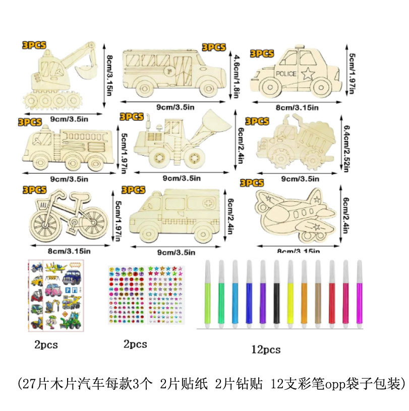 • 자동차용 우드칩 27개, 모델당 3개, 스티커 2개, 다이아몬드 스티커 2개, 컬러펜 12개, opp백 포장