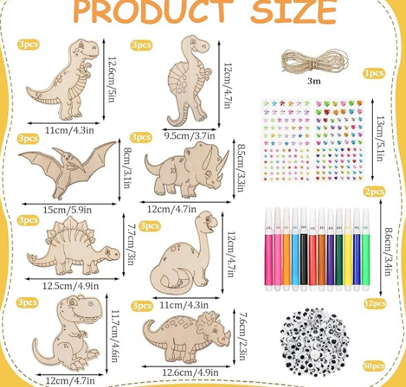 • 약 10cm 크기의 공룡 8마리 (각 4마리), 32조각, 색연필 12개, 다이아몬드 스티커 2개, 마 끈 32개, 눈알 50개, OPP 봉투 포장