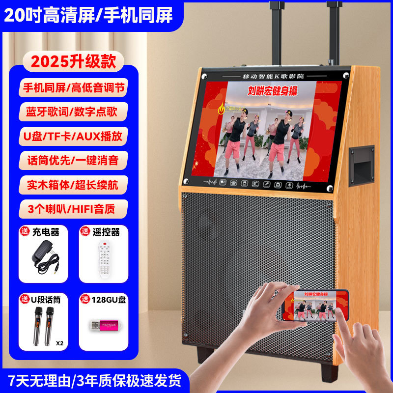• 20inch#HD 화면/휴대폰 동일 화면 버전 + 블루투스 가사/전문 음향 효과 3개 장치 + 무선 충전 마이크 2개 + 128GU 디스크 + 스탠드