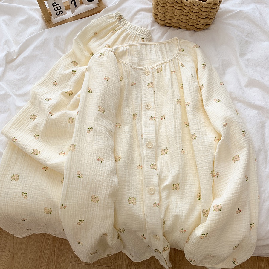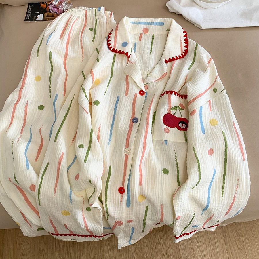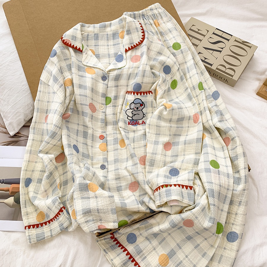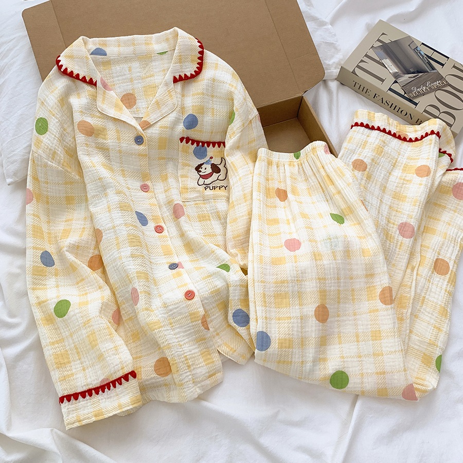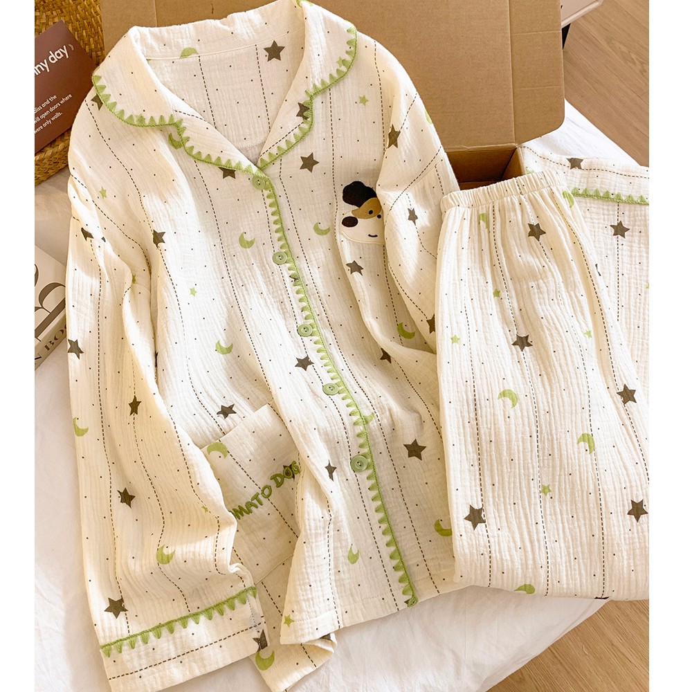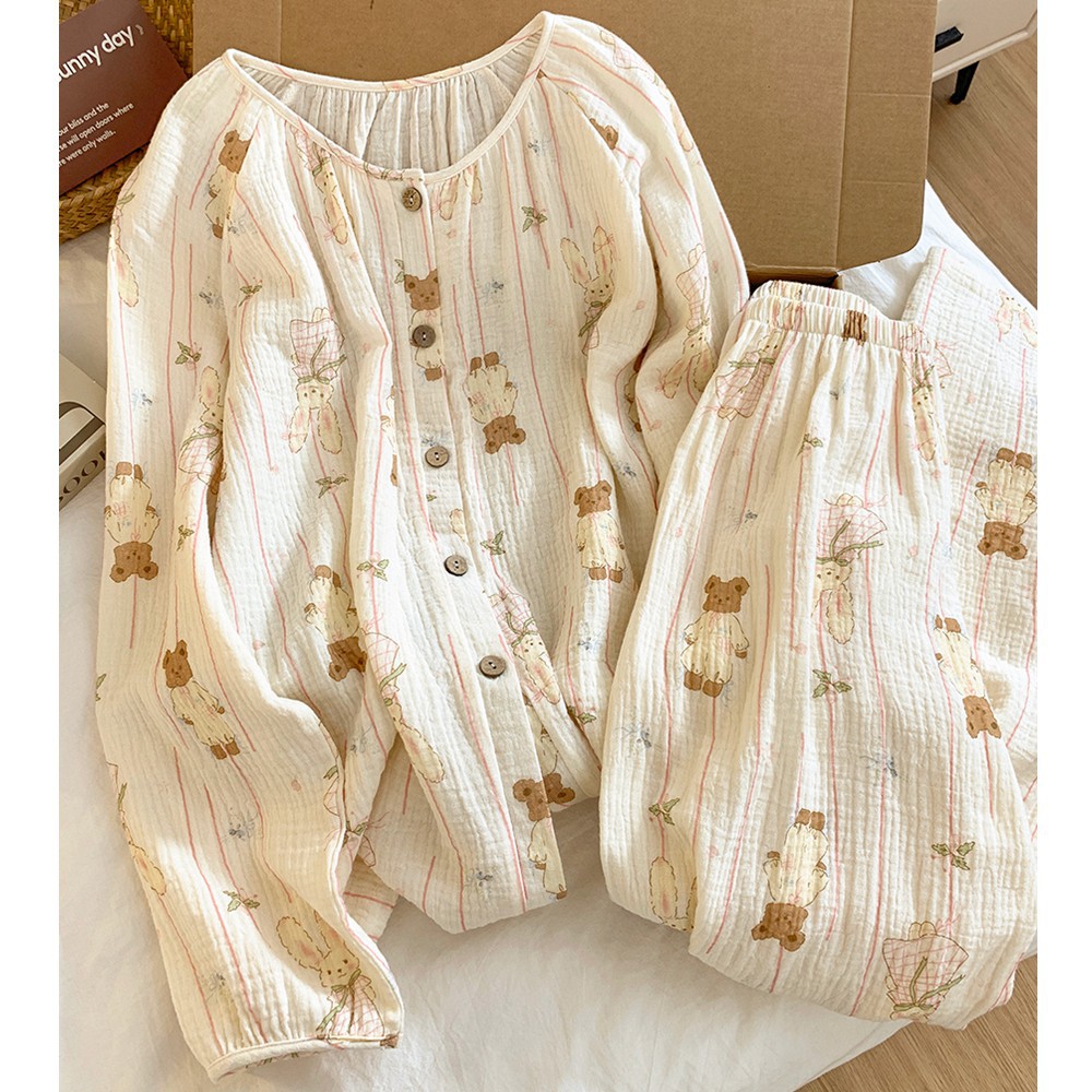 여성을위한 더블 레이어 면화 거즈 잠옷 100% 면 가을 긴팔 바지 여름 귀여운 소녀 홈웨어 세트 도매스토어 가기