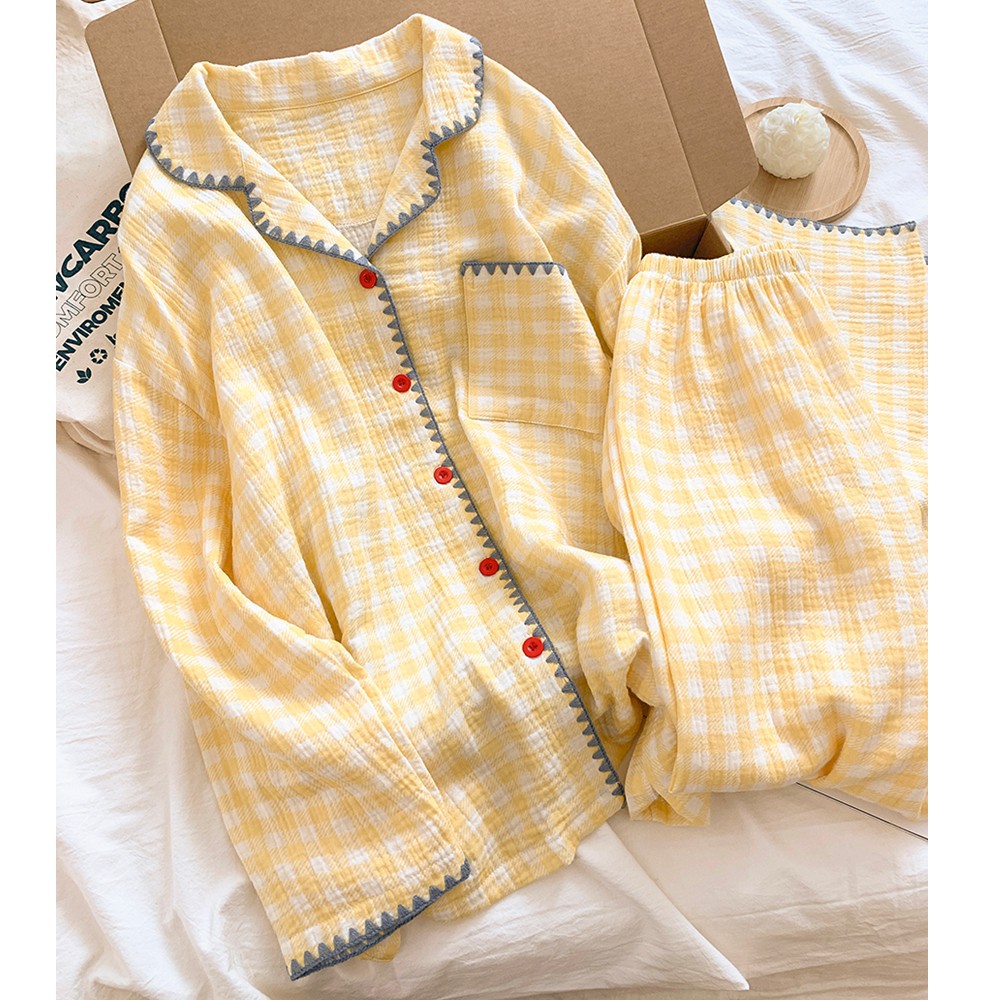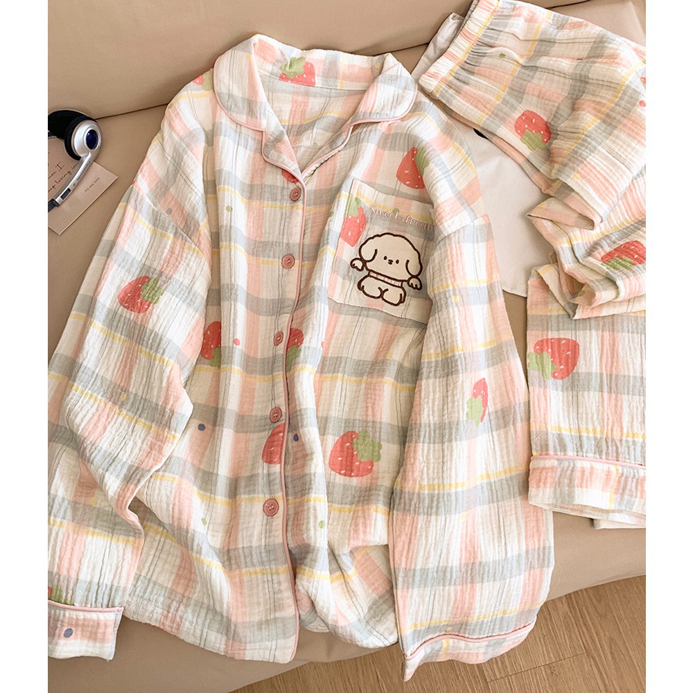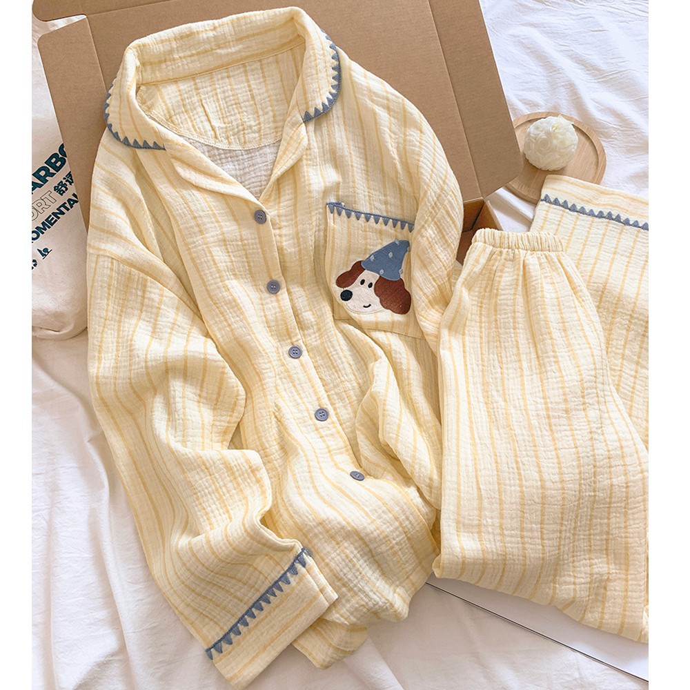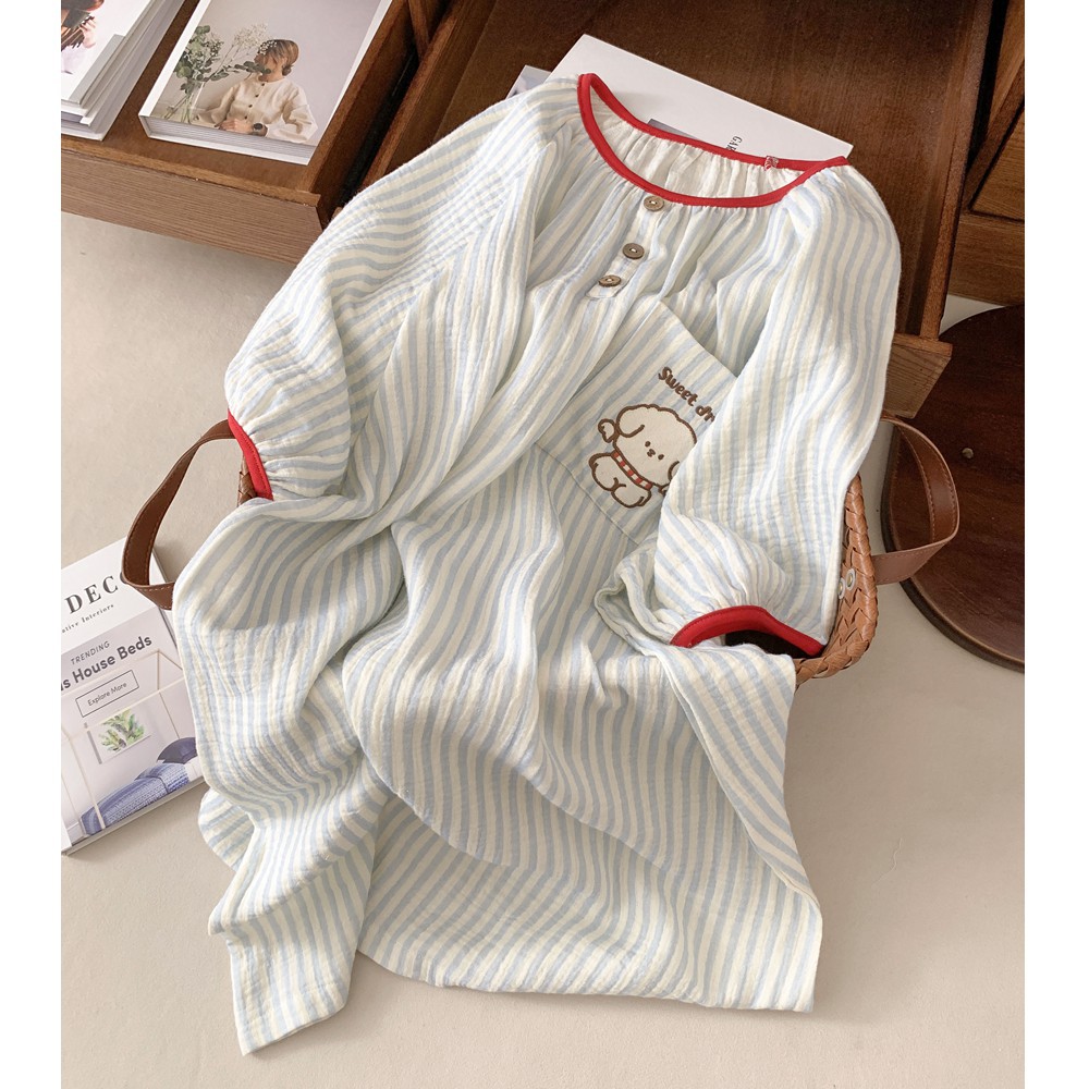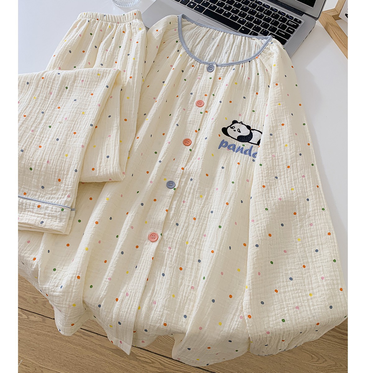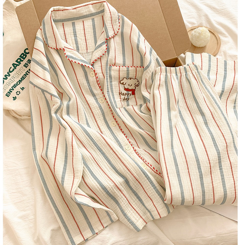 여성을위한 더블 레이어 면화 거즈 잠옷 100% 면 가을 긴팔 바지 여름 귀여운 소녀 홈웨어 세트 도매스토어 가기