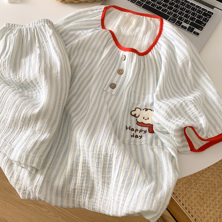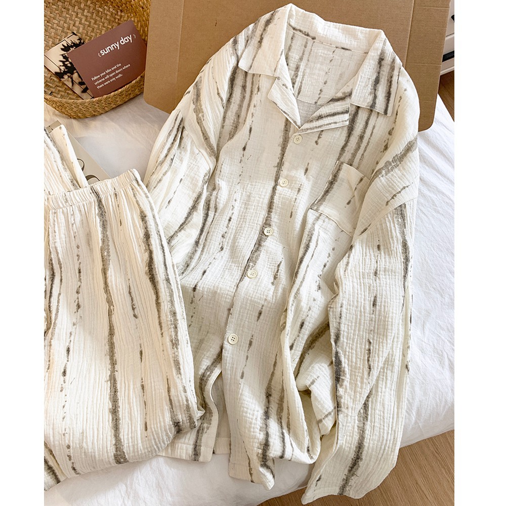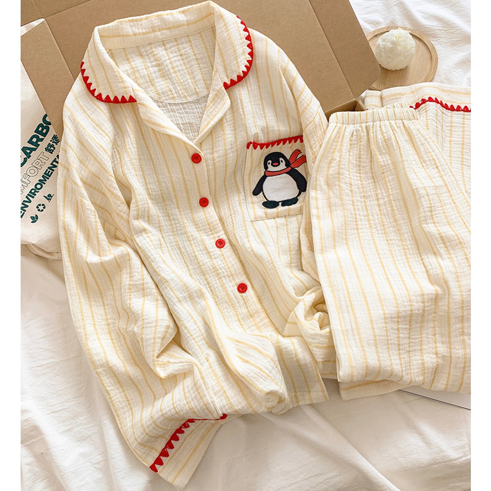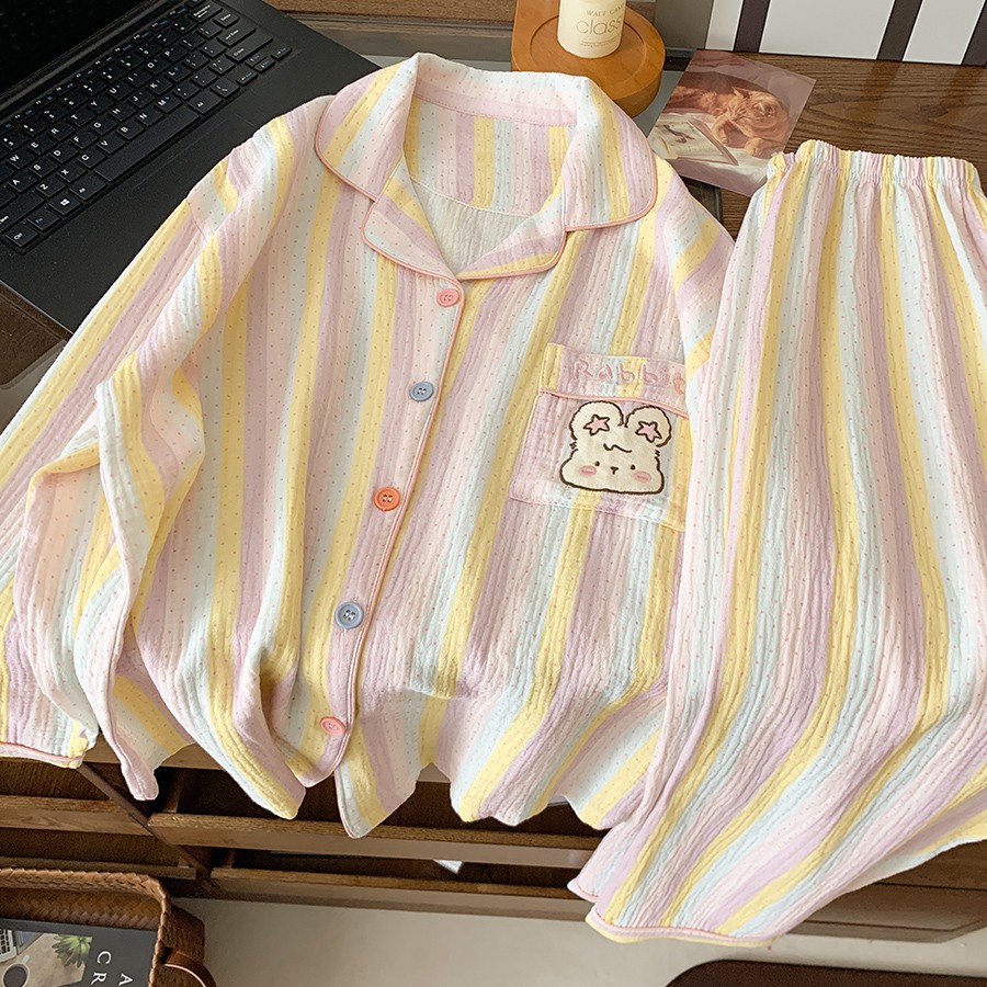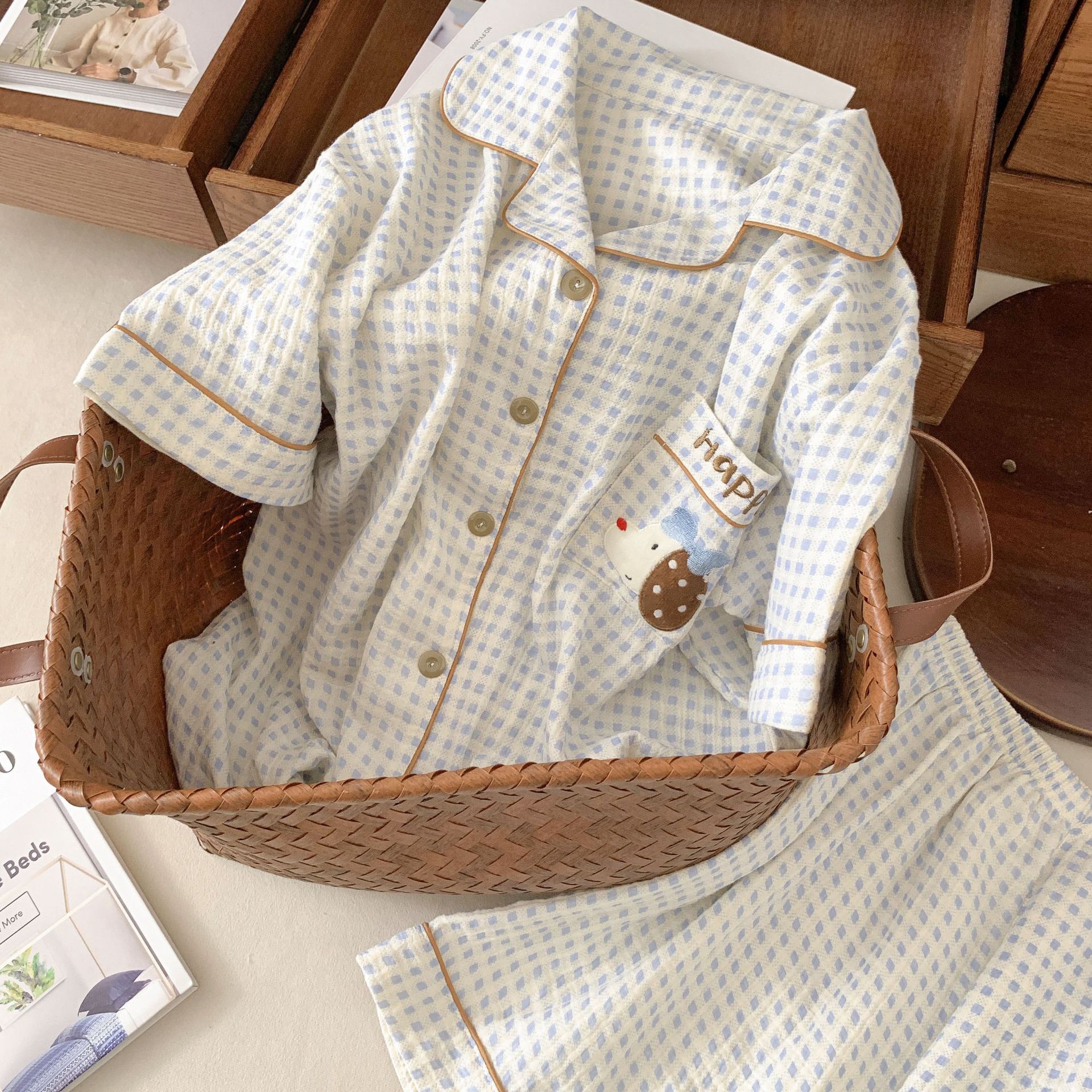 여성을위한 더블 레이어 면화 거즈 잠옷 100% 면 가을 긴팔 바지 여름 귀여운 소녀 홈웨어 세트 도매스토어 가기