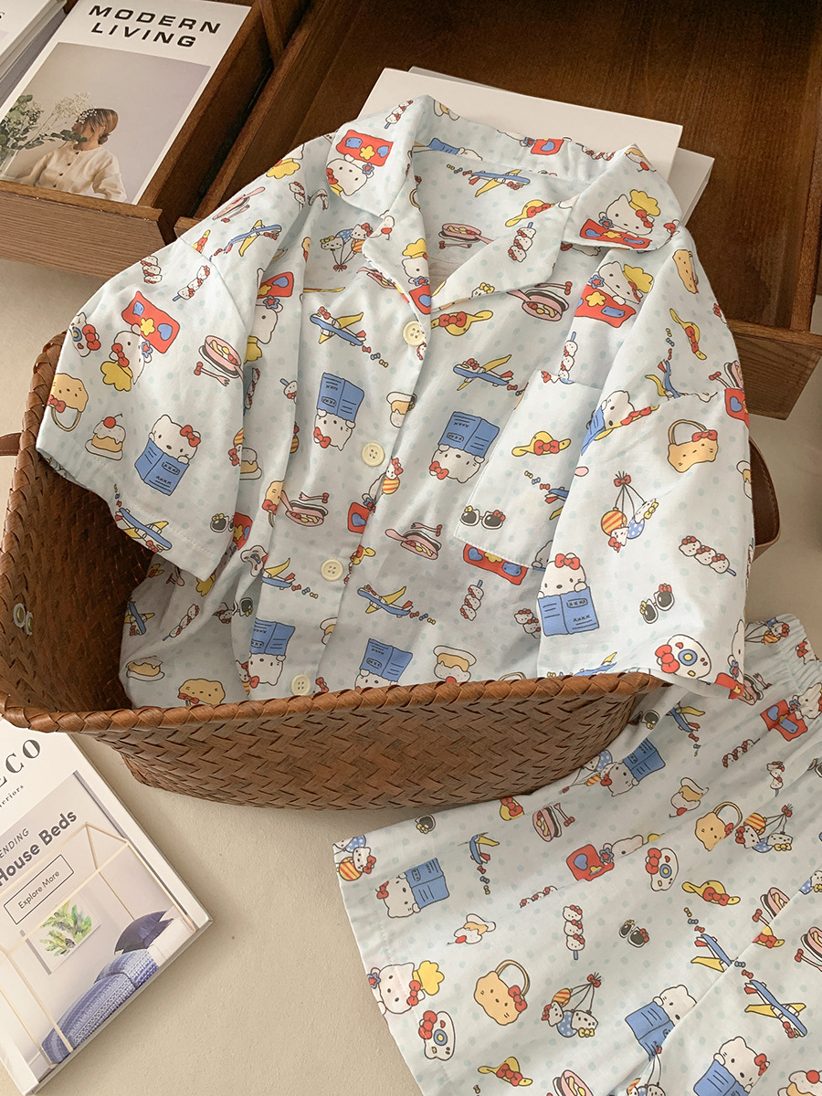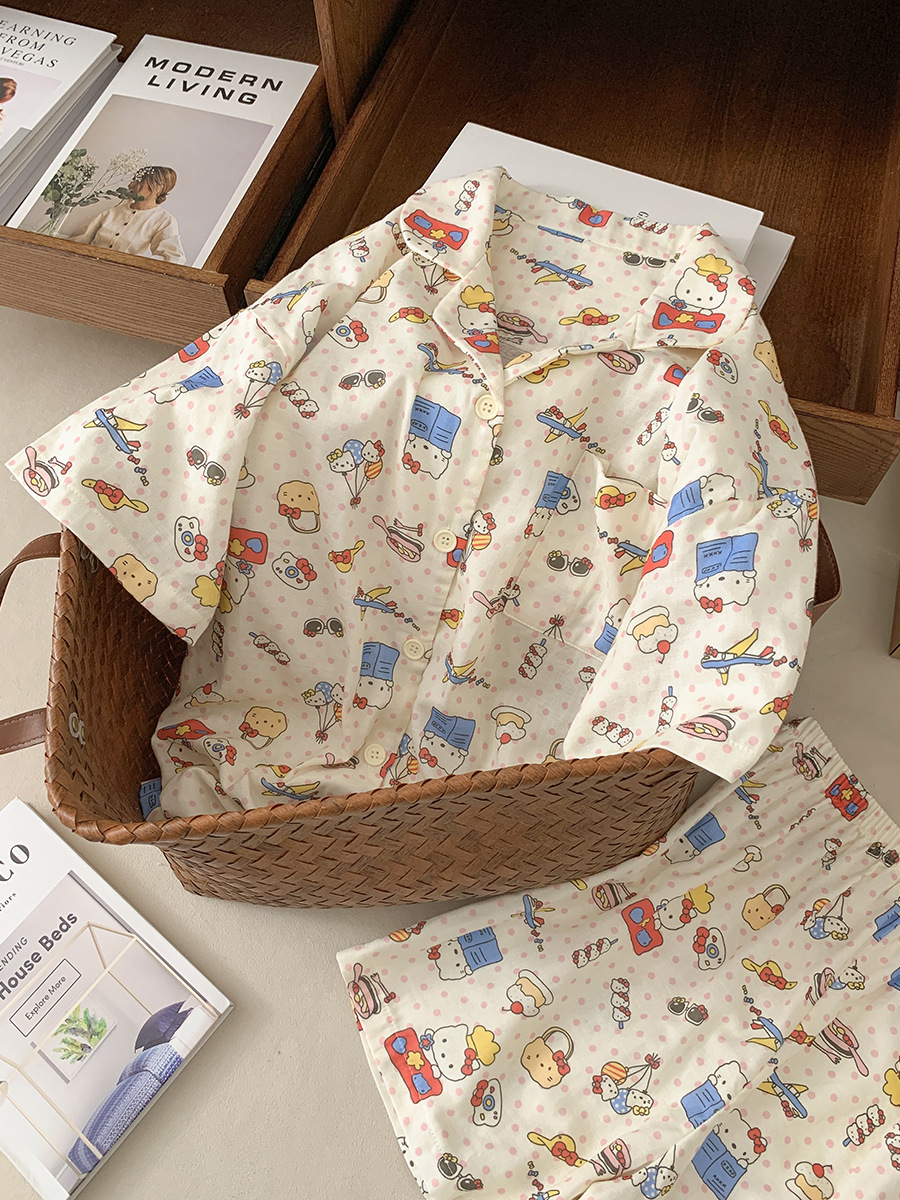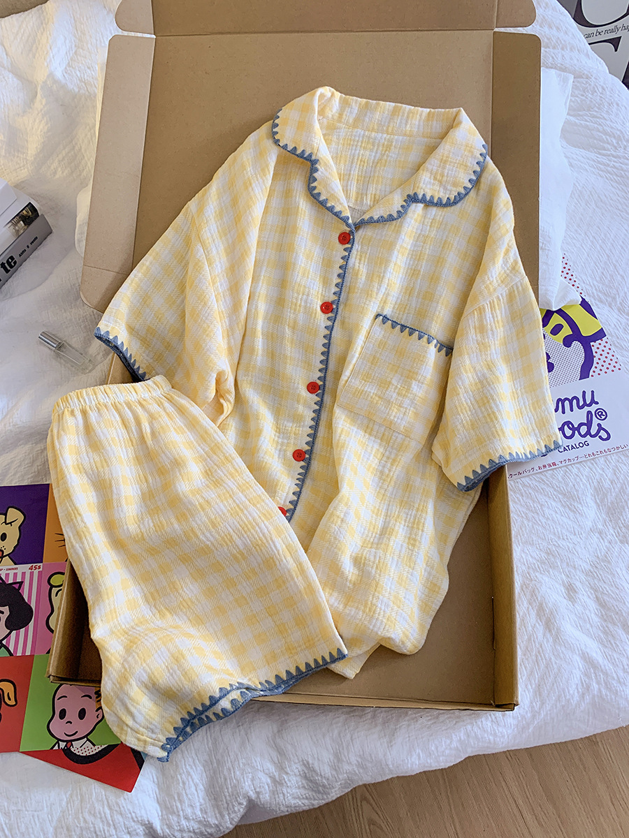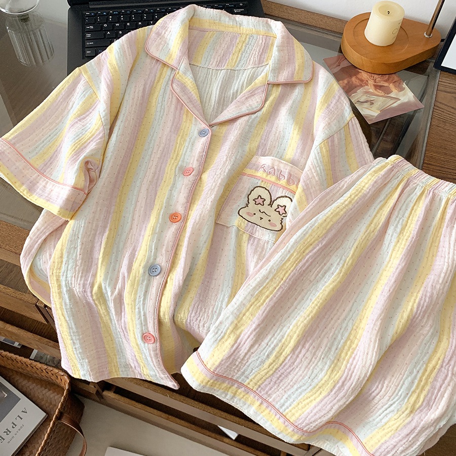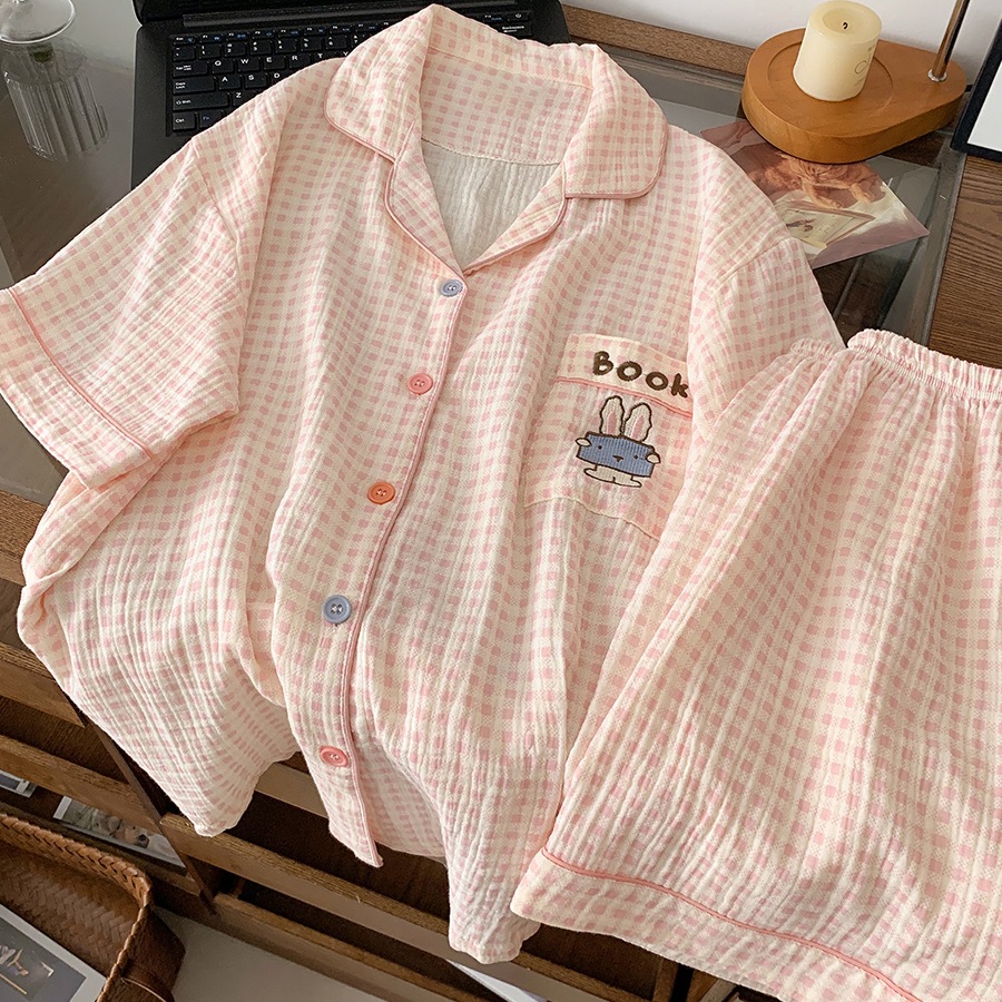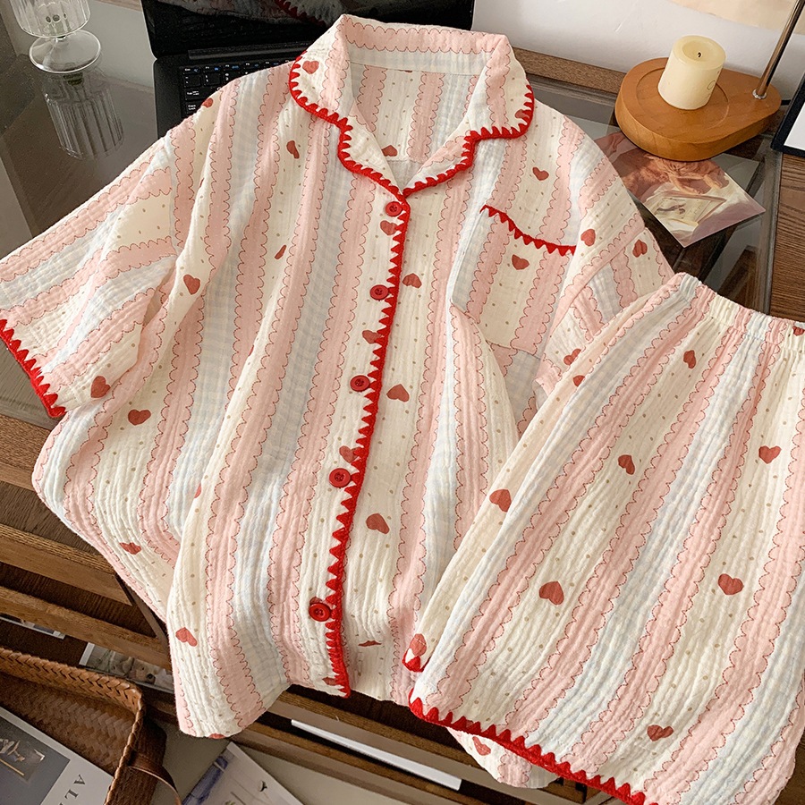 여성을위한 더블 레이어 면화 거즈 잠옷 100% 면 가을 긴팔 바지 여름 귀여운 소녀 홈웨어 세트 도매스토어 가기