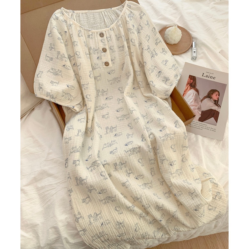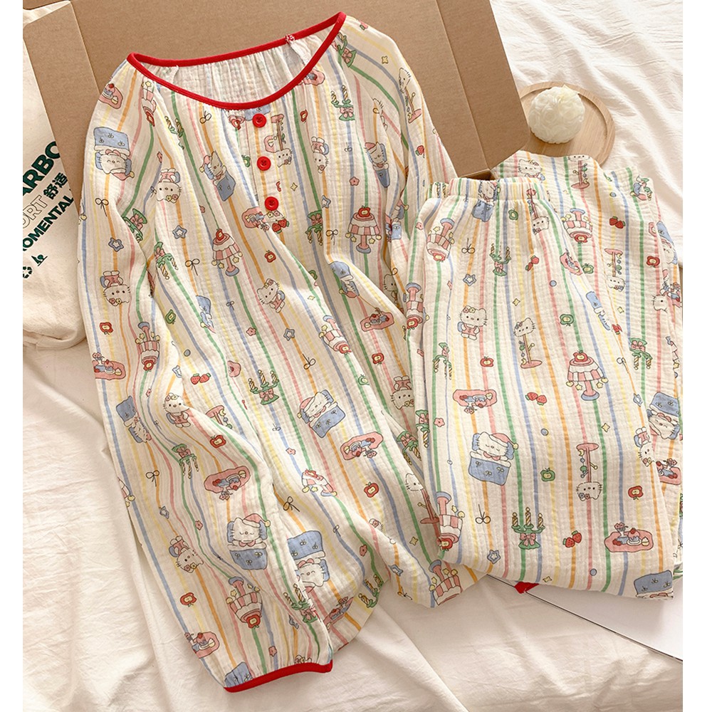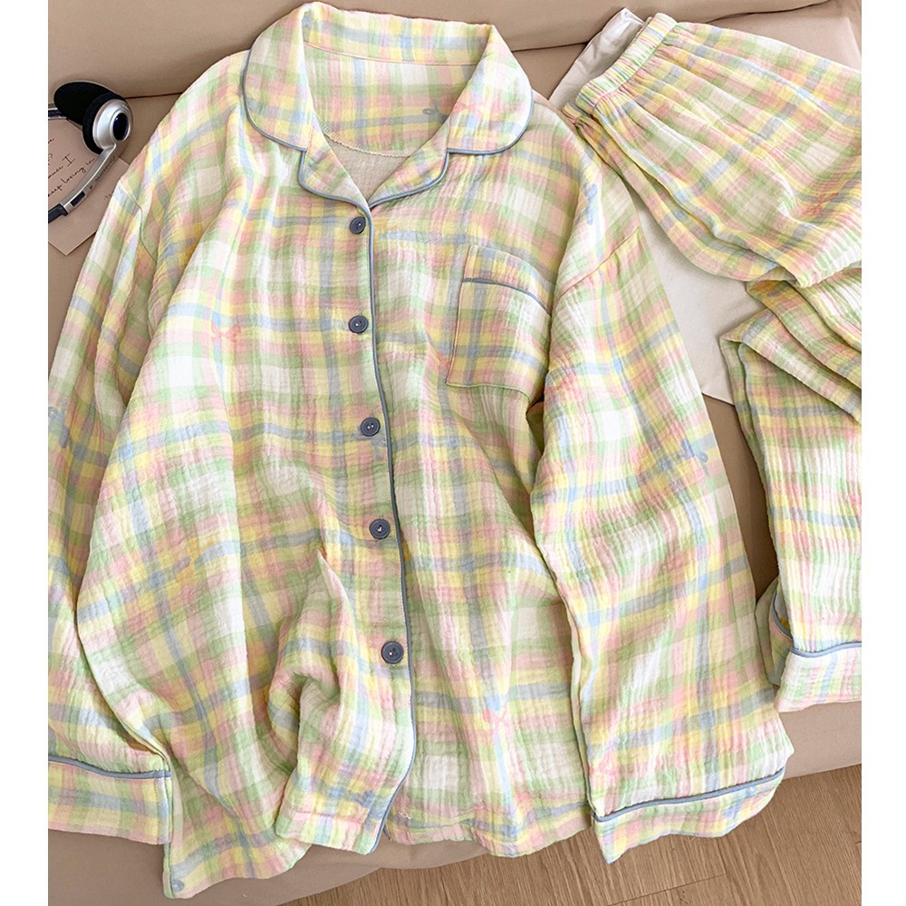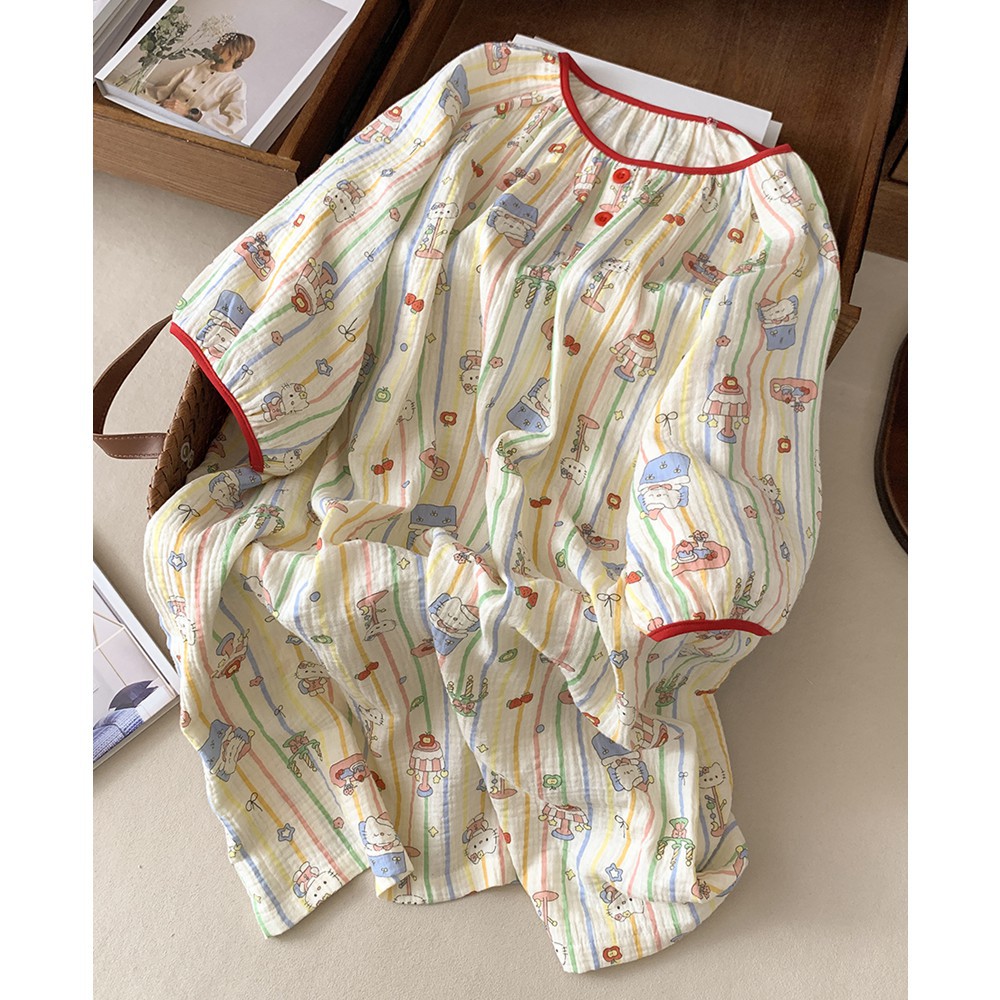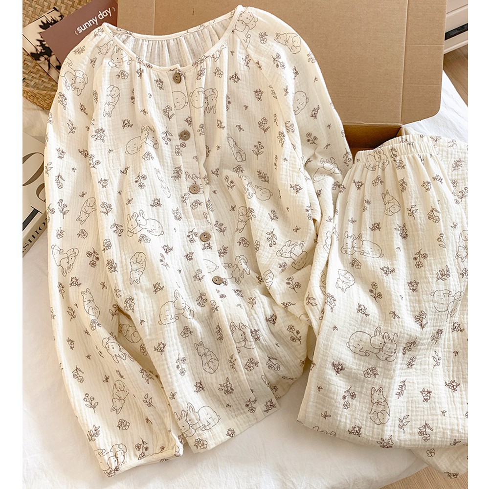 여성을위한 더블 레이어 면화 거즈 잠옷 100% 면 가을 긴팔 바지 여름 귀여운 소녀 홈웨어 세트 도매