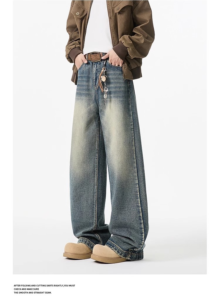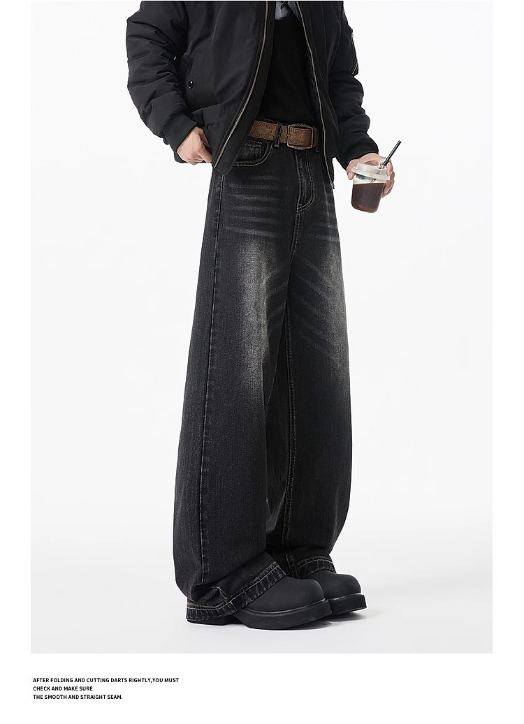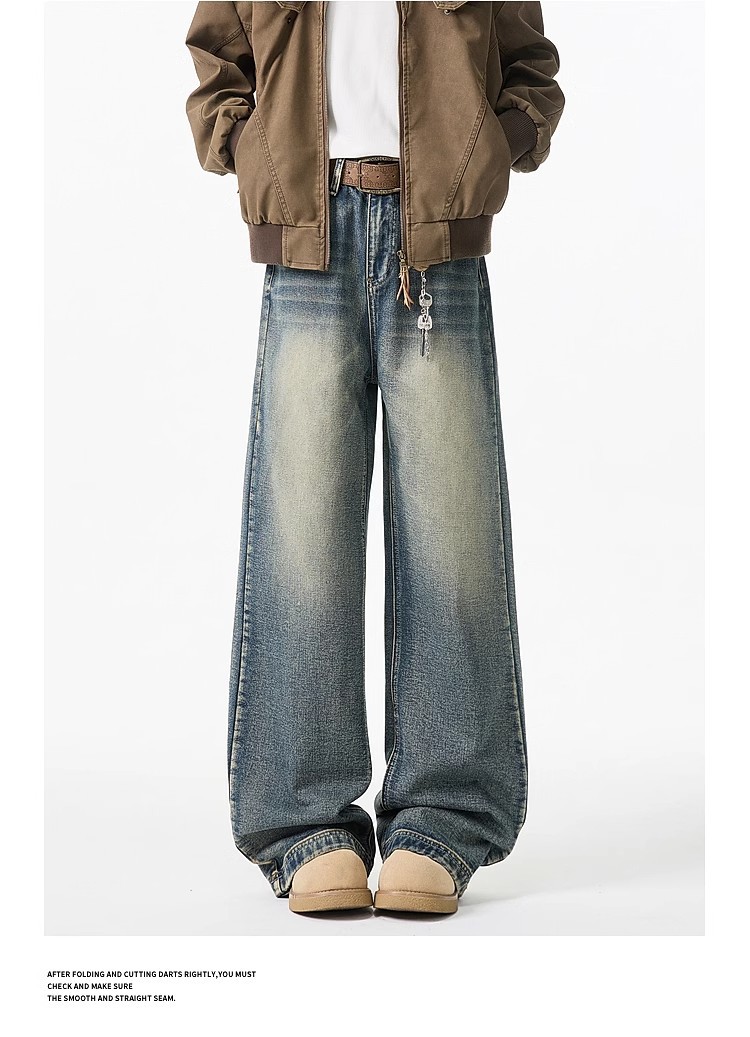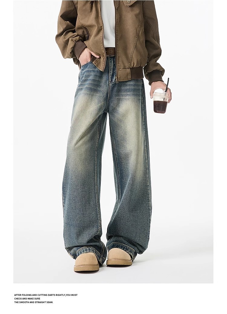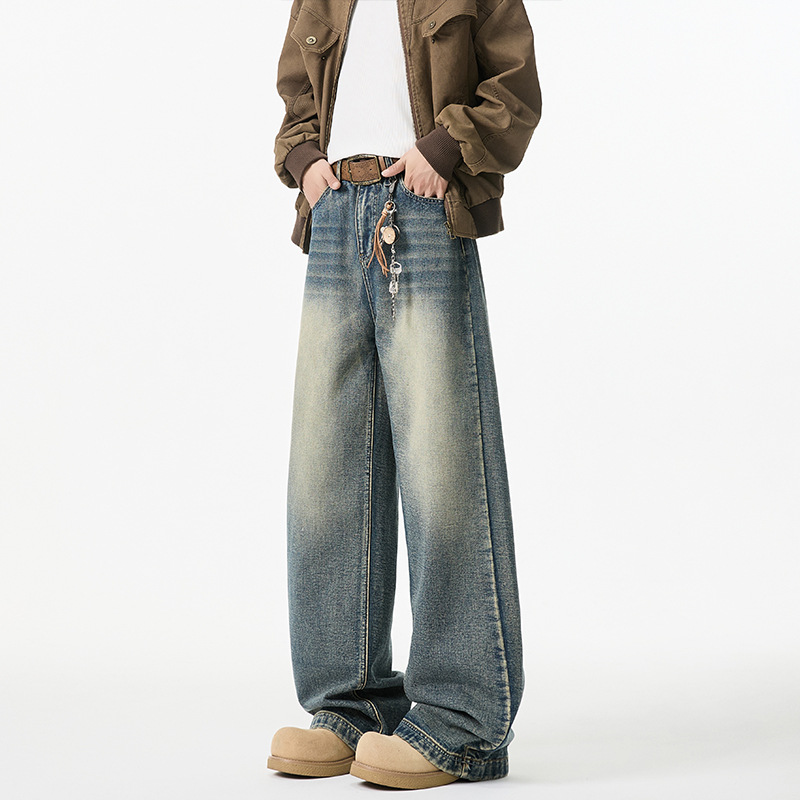 청바지 남성용 클린 핏 미국식 하이 스트리트 고양이는 구식 루즈 스트레이트 시미 터 와이드 레그 팬츠를 씻어야합니다.스토어 가기