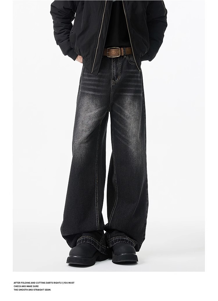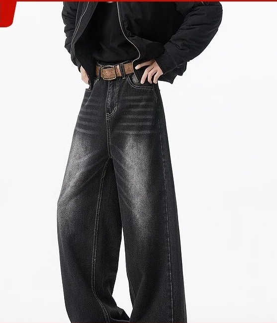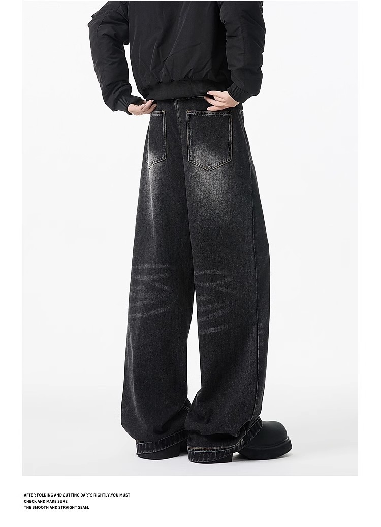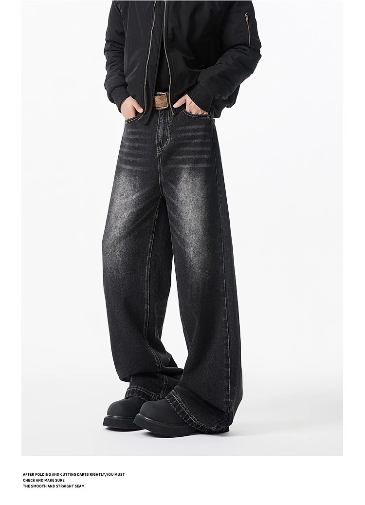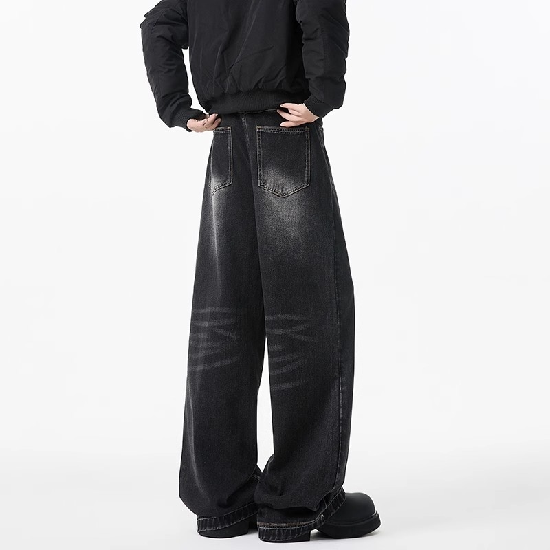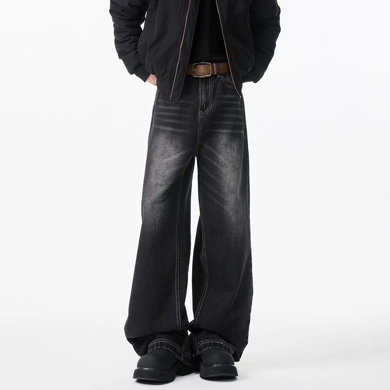 청바지 남성용 클린 핏 미국식 하이 스트리트 고양이는 구식 루즈 스트레이트 시미 터 와이드 레그 팬츠를 씻어야합니다.스토어 가기