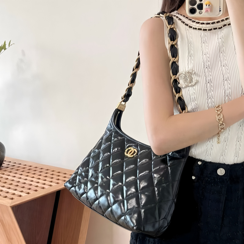 작은 향기로운 스타일 탑 레이어 Cowhide Hobo Underarm Bag 여성용 고급 Rhomboid 체인 어깨 토트 백 블랙 가죽 가방스토어 가기