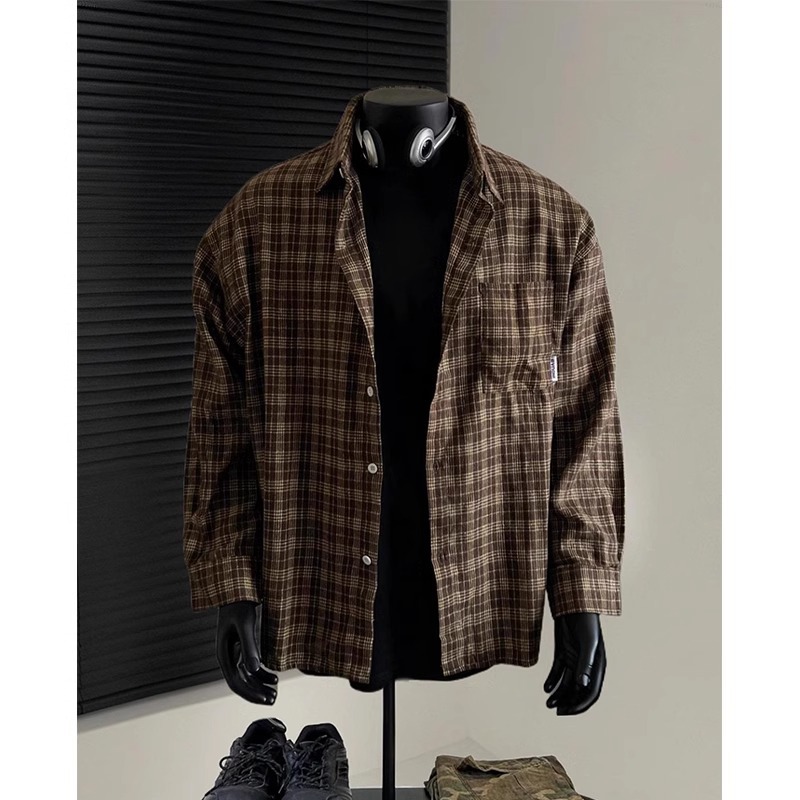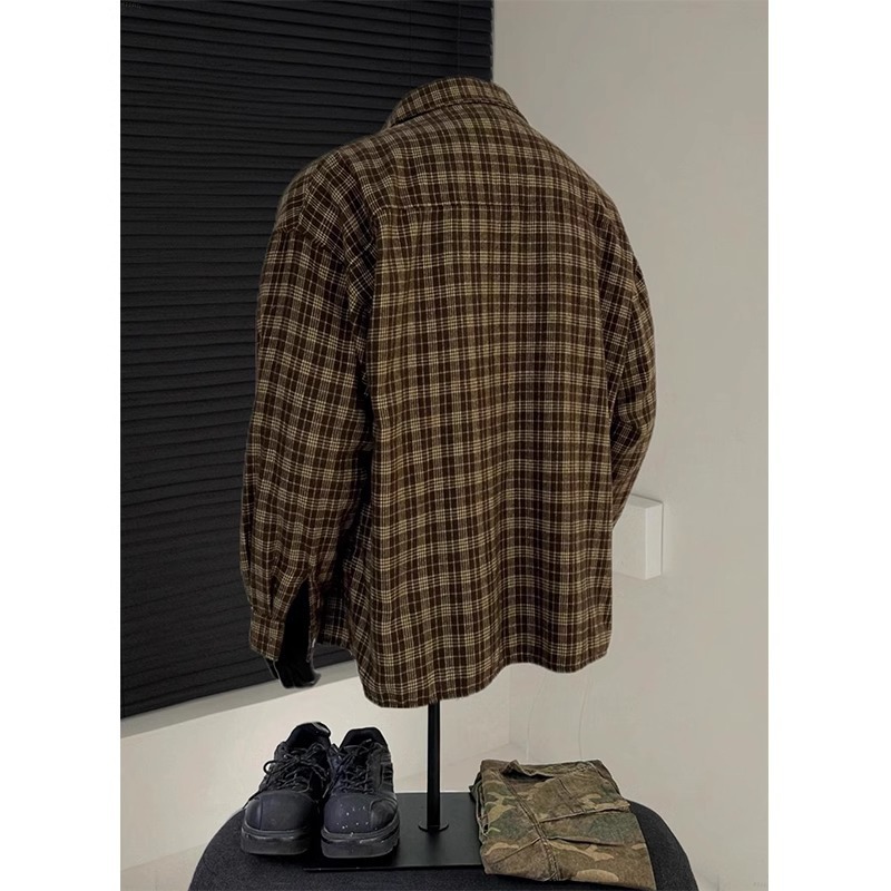 아메리칸 스타일 레트로 다크 브라운 격자 무늬 셔츠 남성용 봄과 가을 마일러드 코튼 샌딩 긴 소매 셔츠 내부 재킷스토어 가기