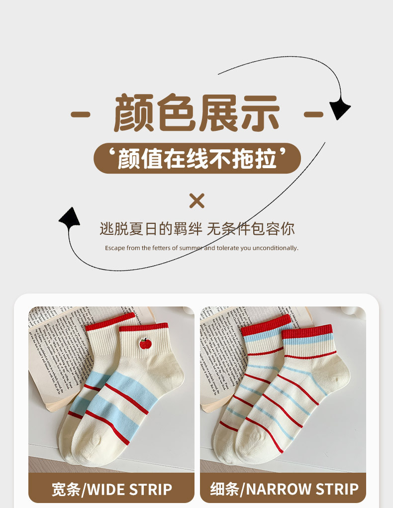 봄과 여름 귀여운 만화 자수 애플 짧은 튜브 면 여성 양말 모든 경기 컬러 대비 웨이브 도트 일본 대학 스타일 보트 양말