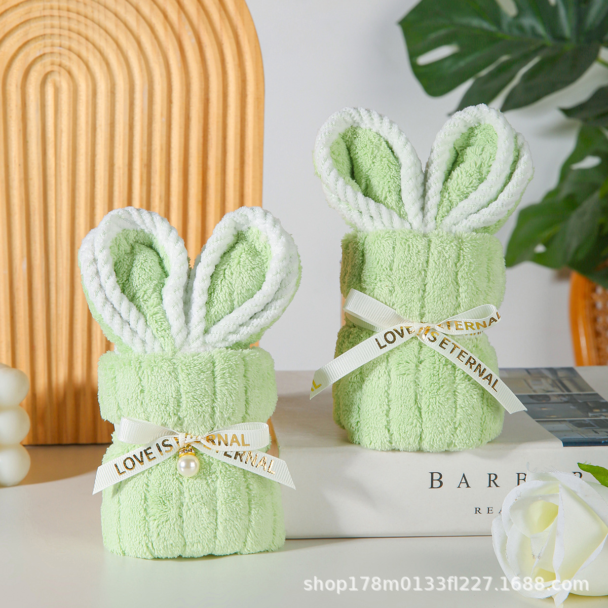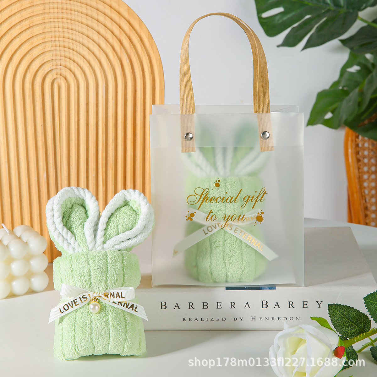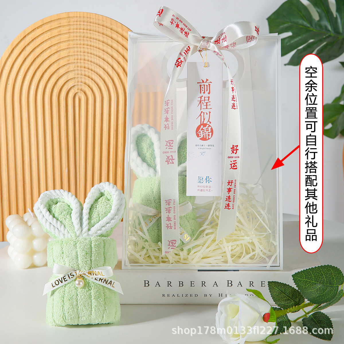 • 녹색 토끼 수건 + PVC 가방 + 엘리베이터 + 리본 + 라피아