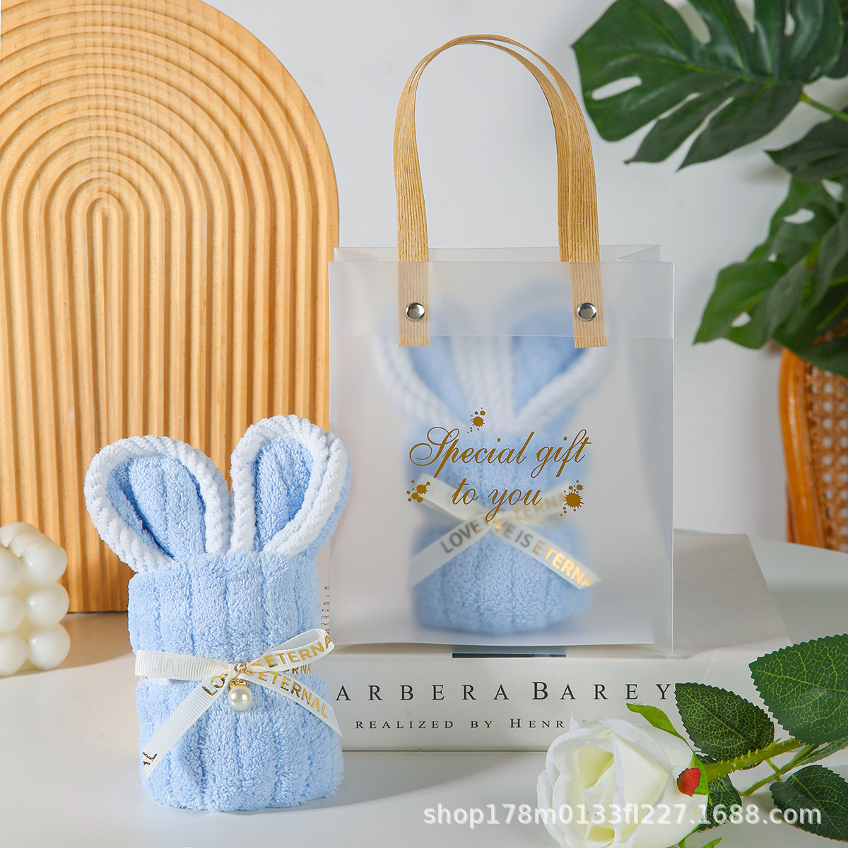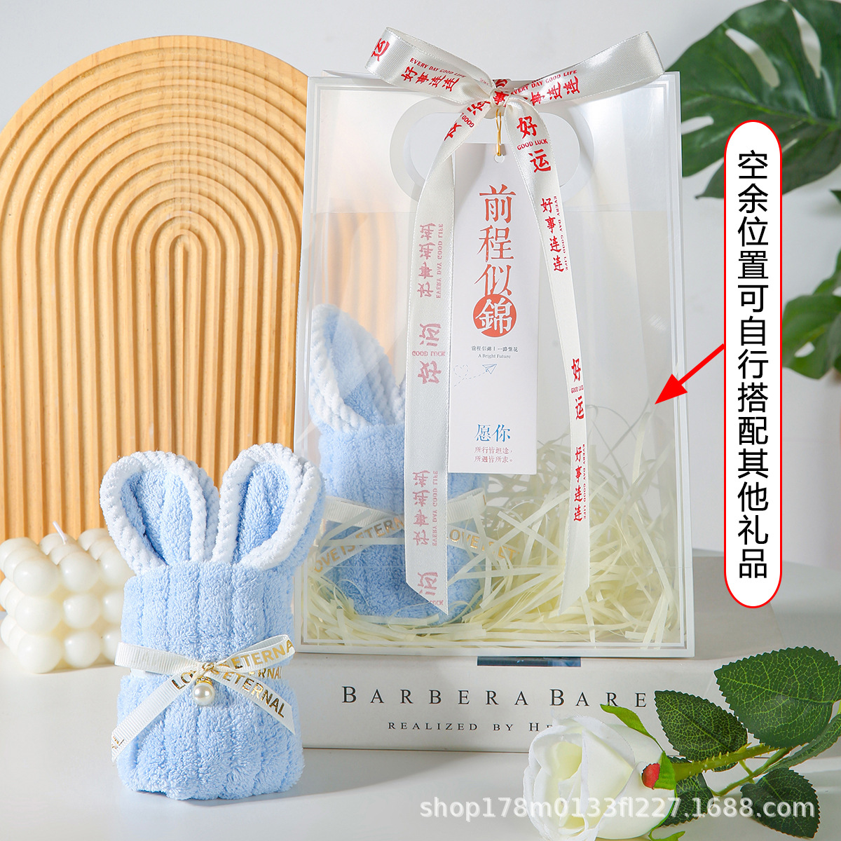 • 파란 토끼 수건 + PVC 가방 + 엘리베이터 + 리본 + 라피아