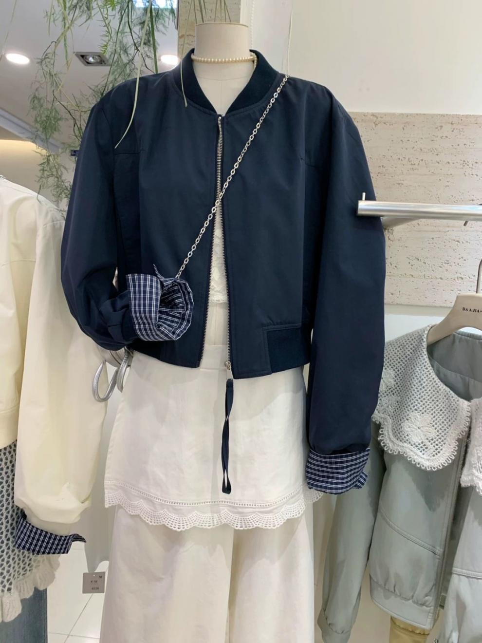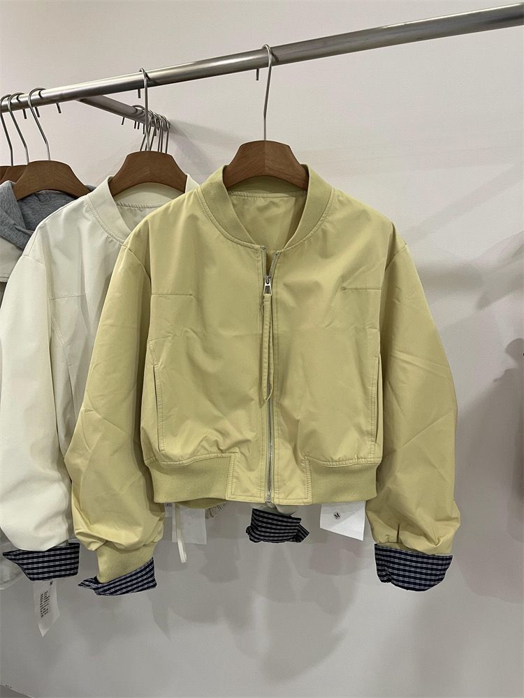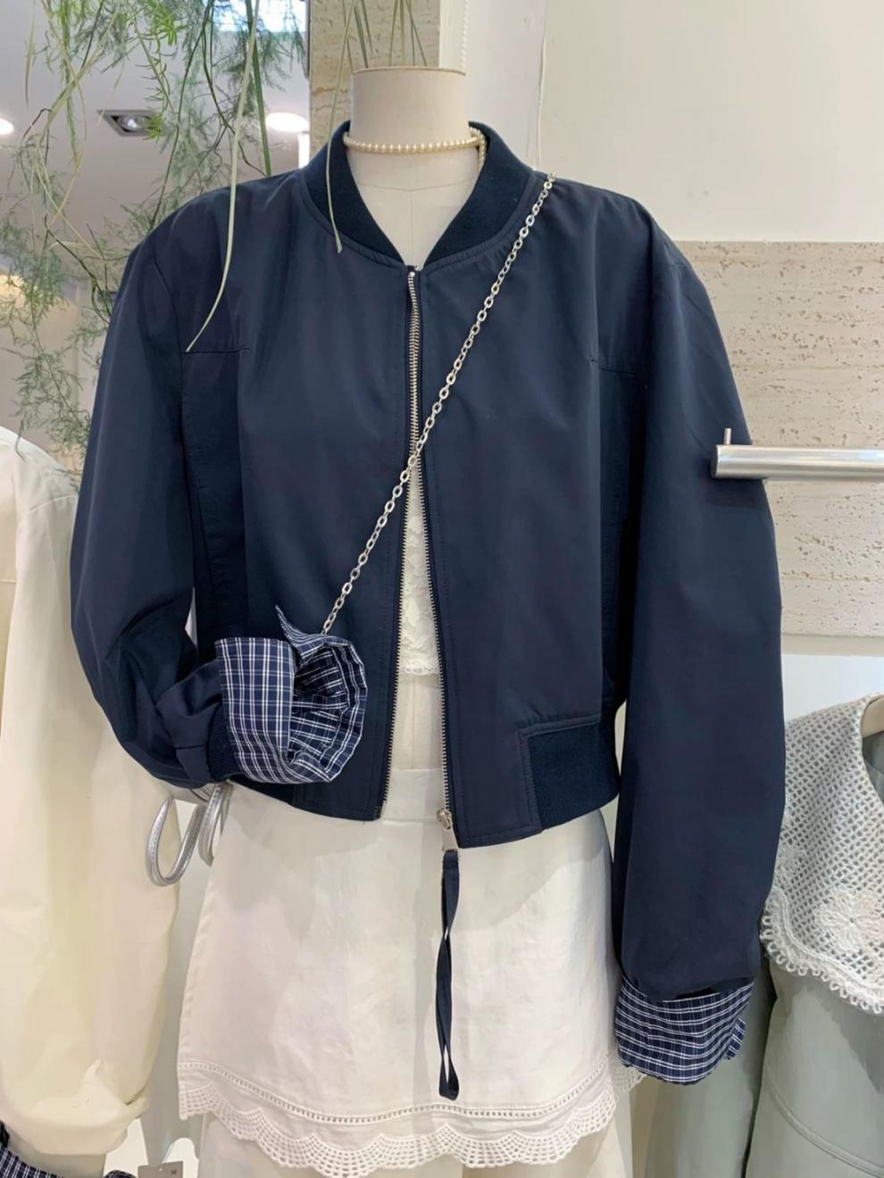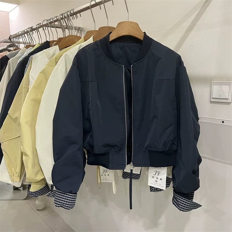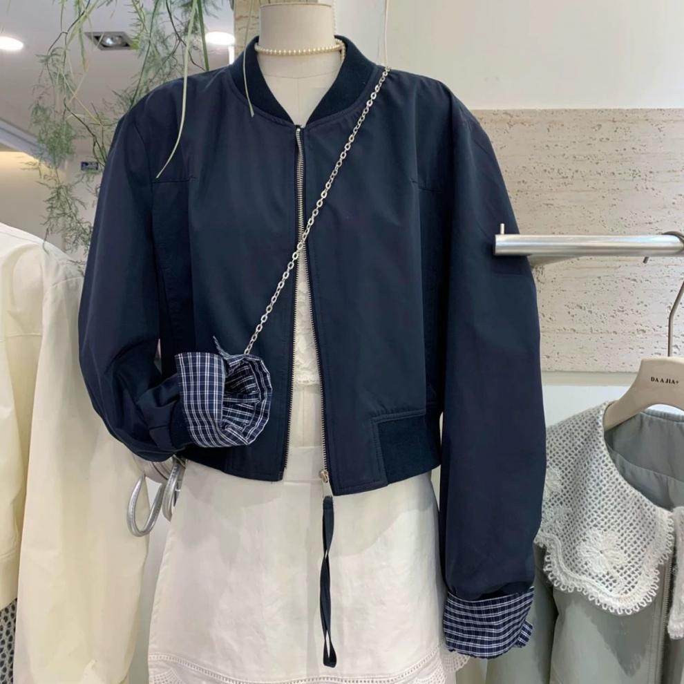 탑 작은 2025 여성 자켓 수직 칼라 스프링 자켓 느슨한 스티칭 슬리브 플레이드 한국 짧은 새 스타일스토어 가기