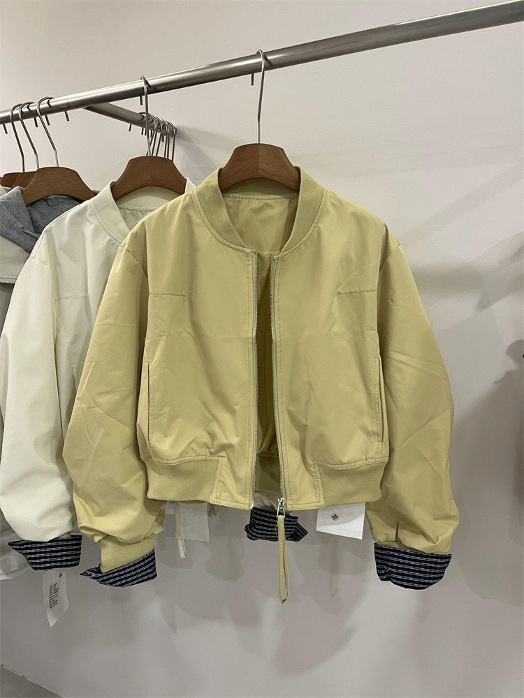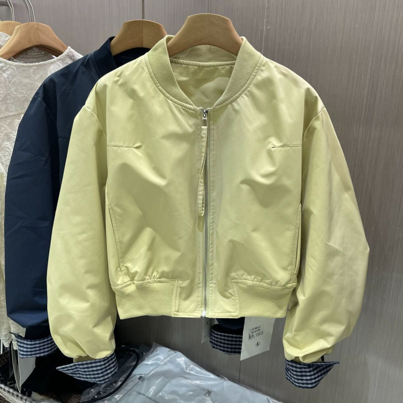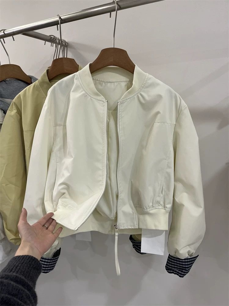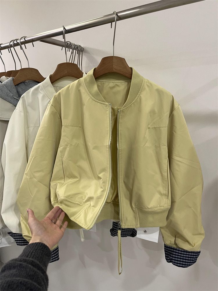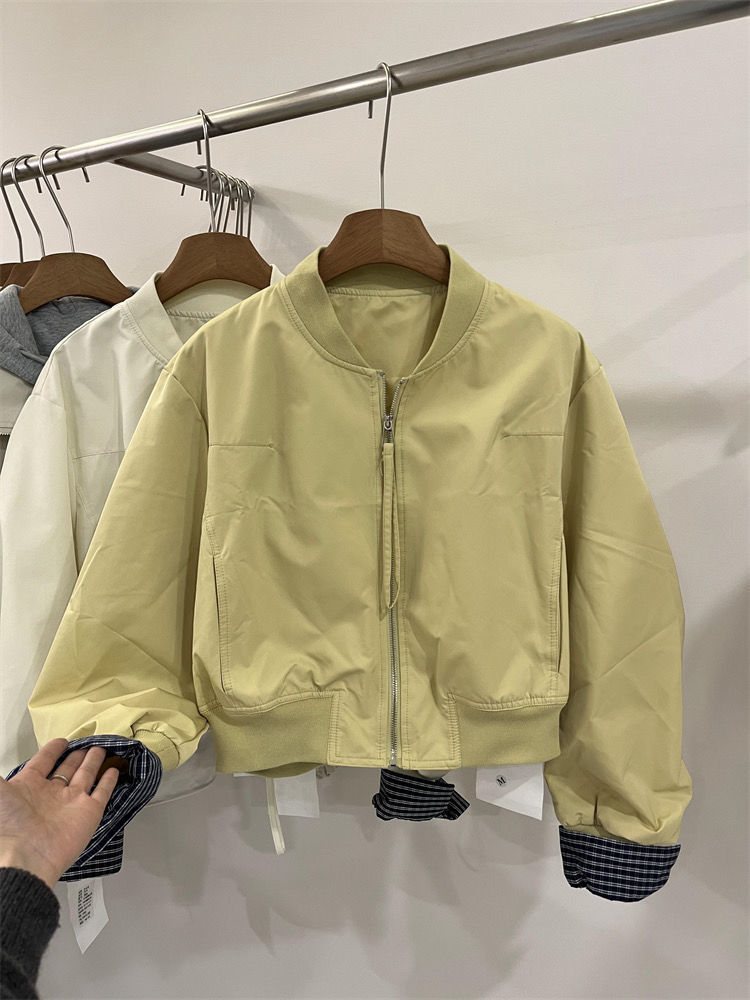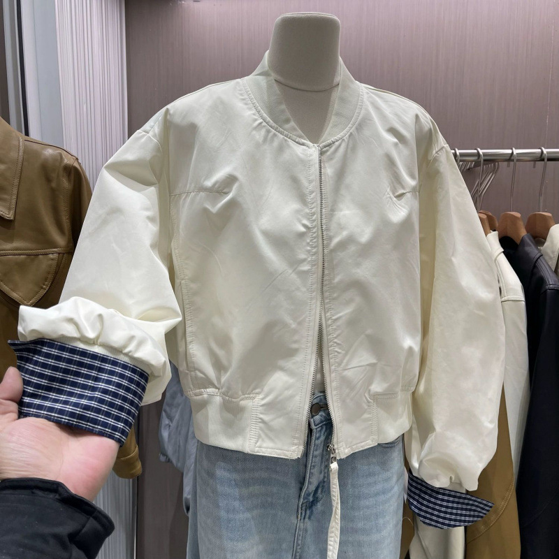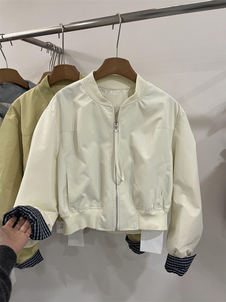 탑 작은 2025 여성 자켓 수직 칼라 스프링 자켓 느슨한 스티칭 슬리브 플레이드 한국 짧은 새 스타일